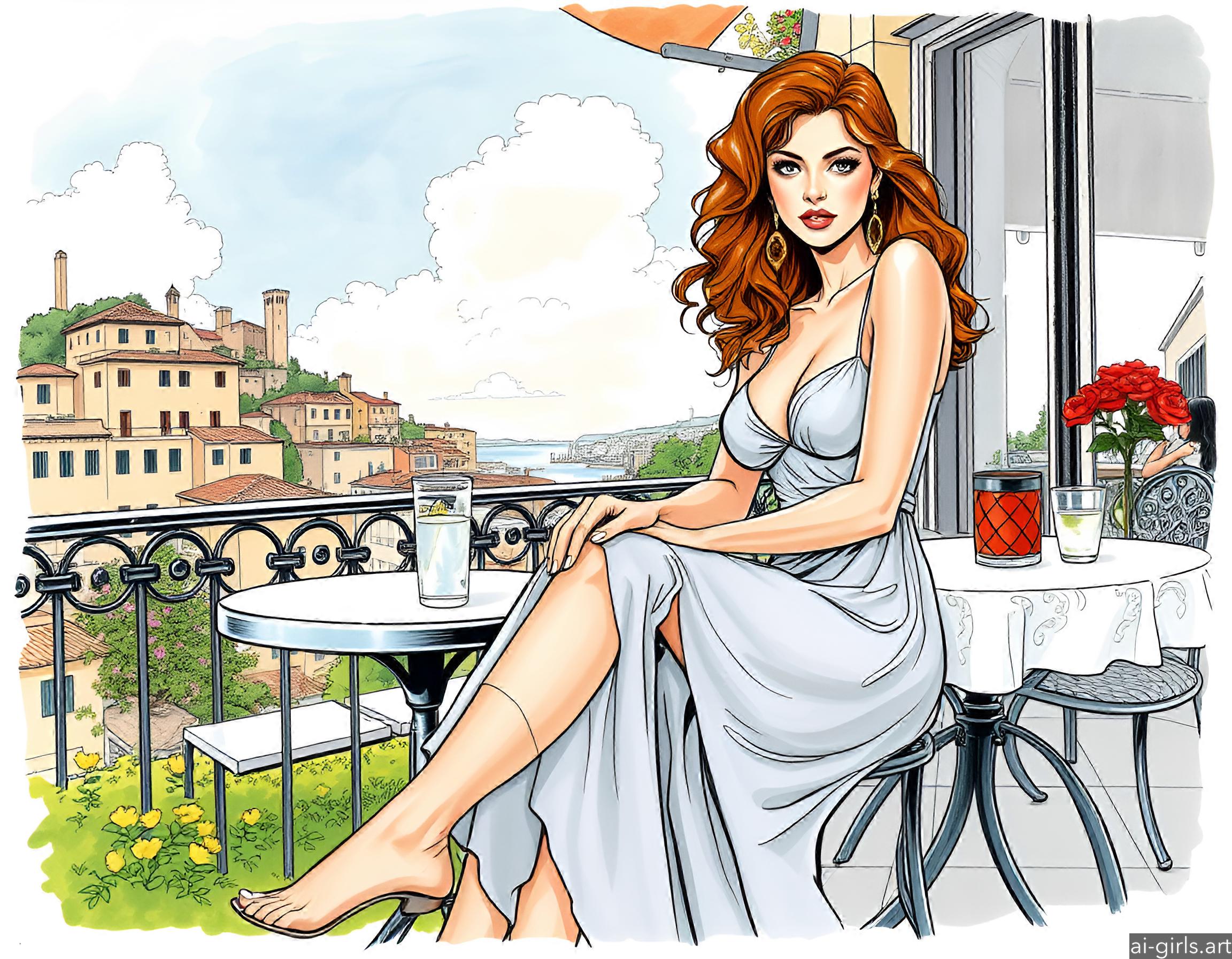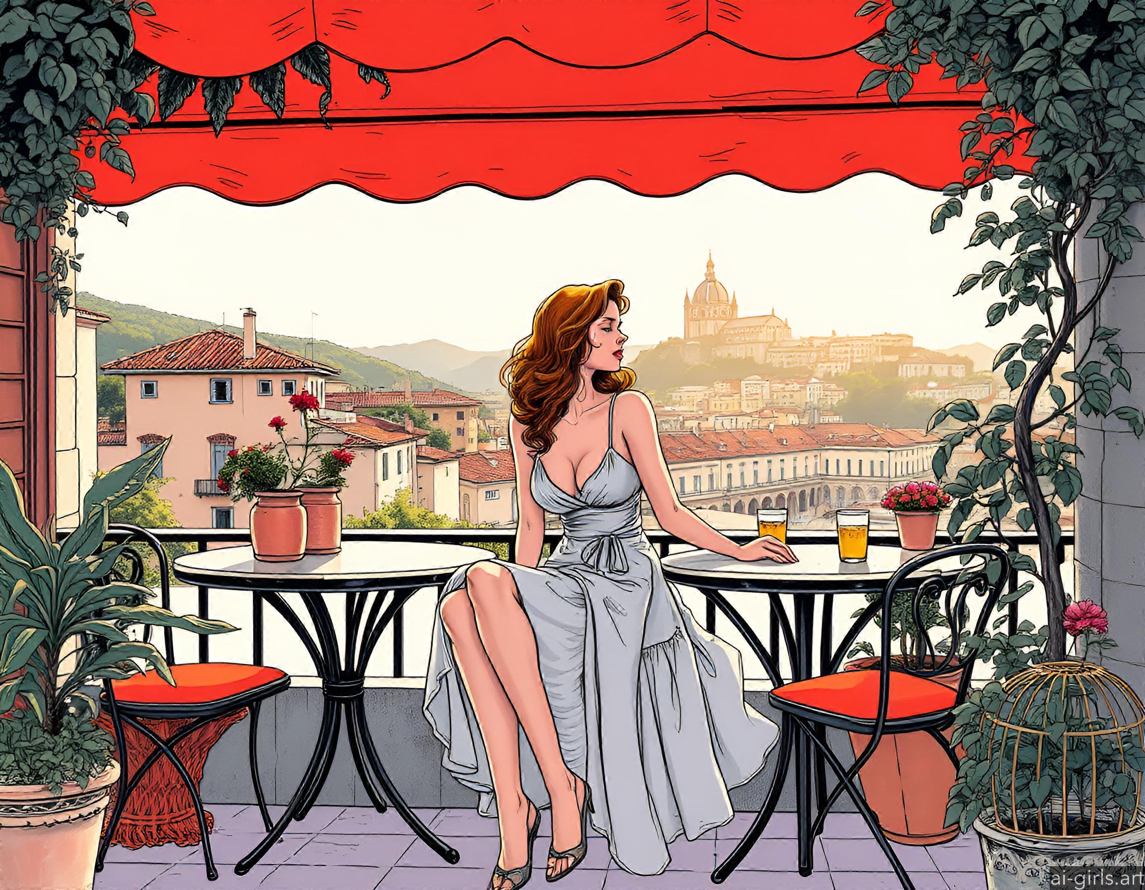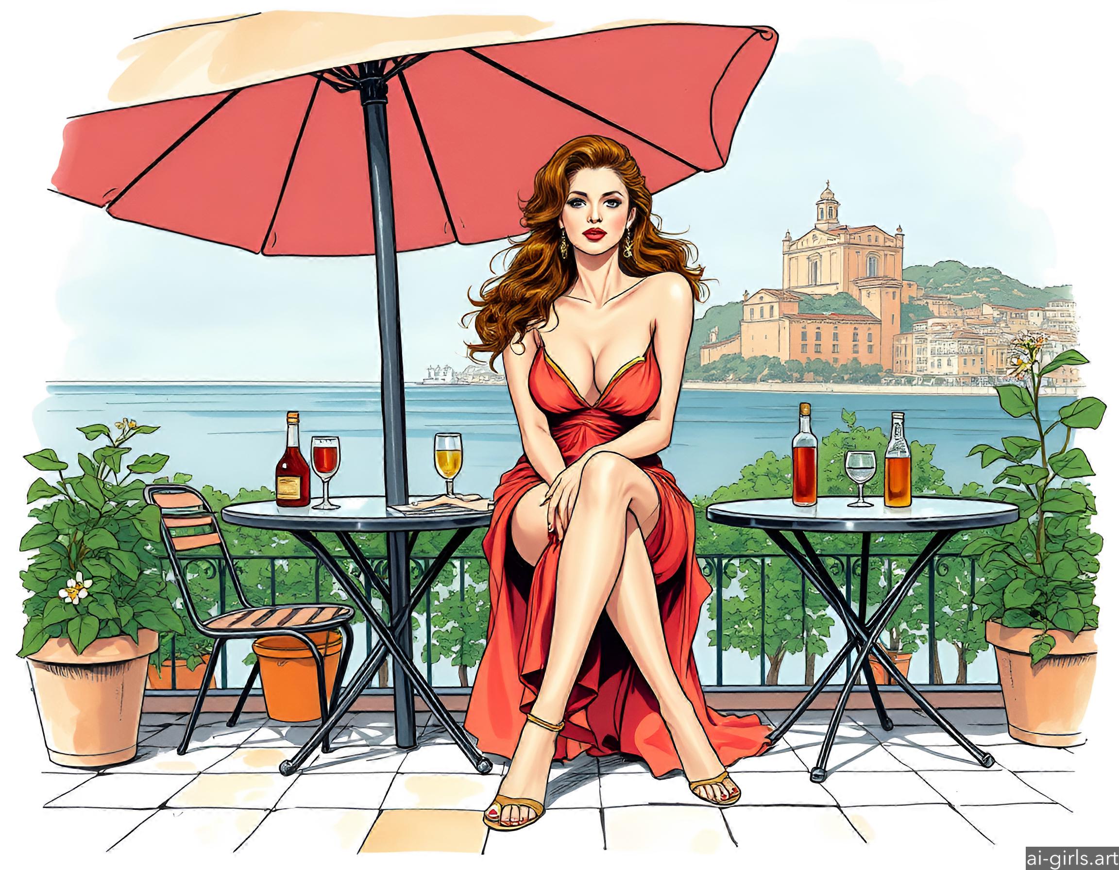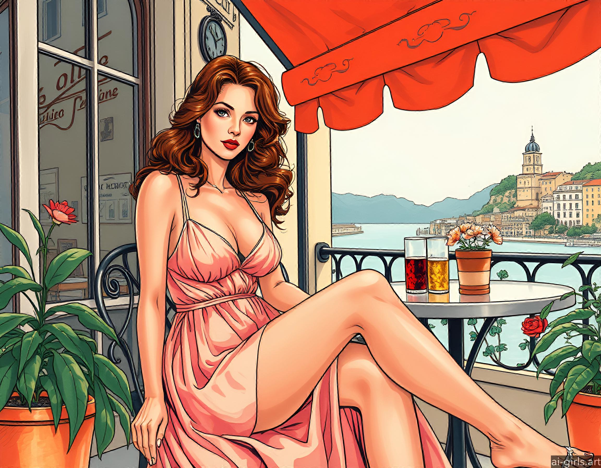 A sexy young woman wearing a summer dress sitting on the terrace of an italian café.