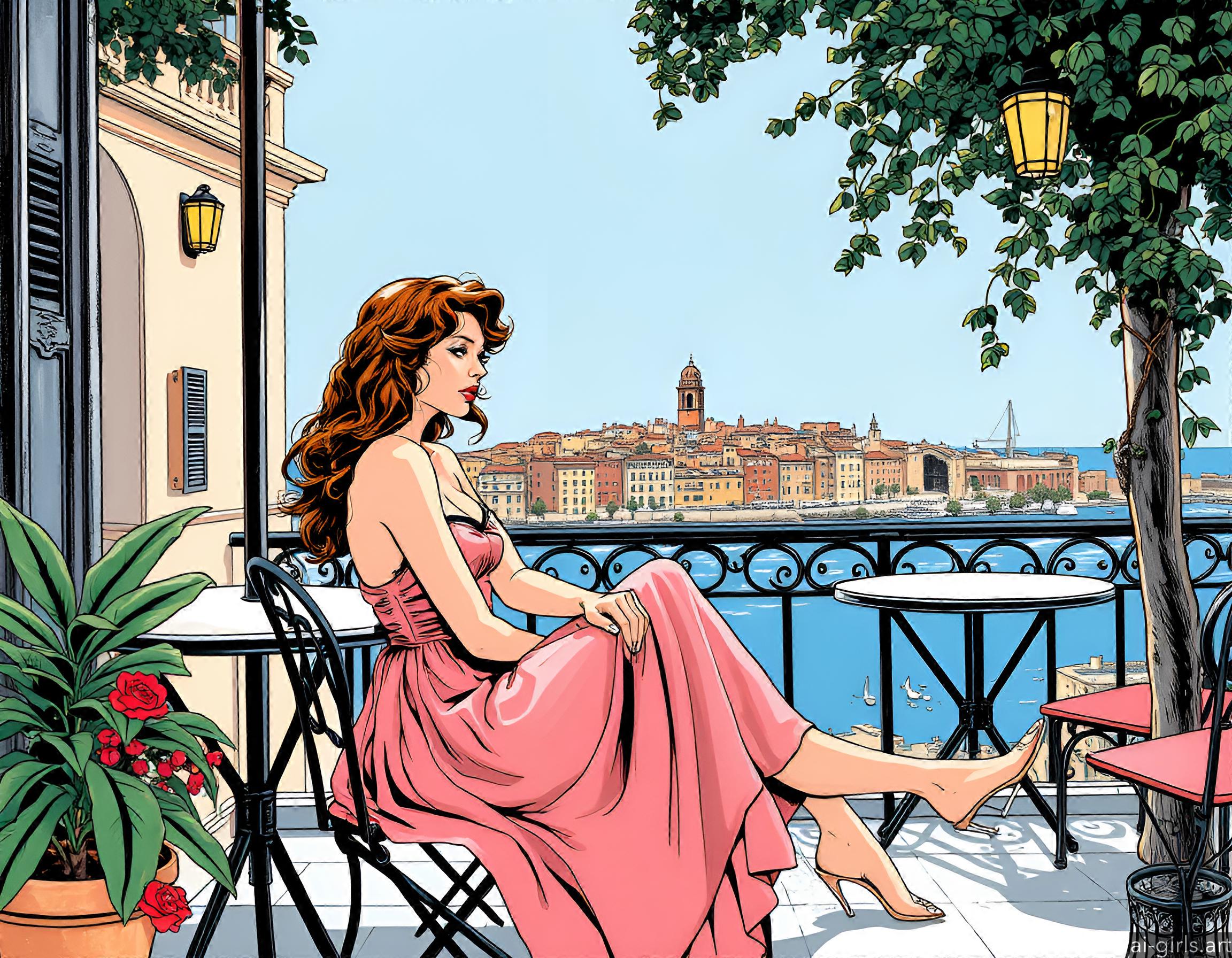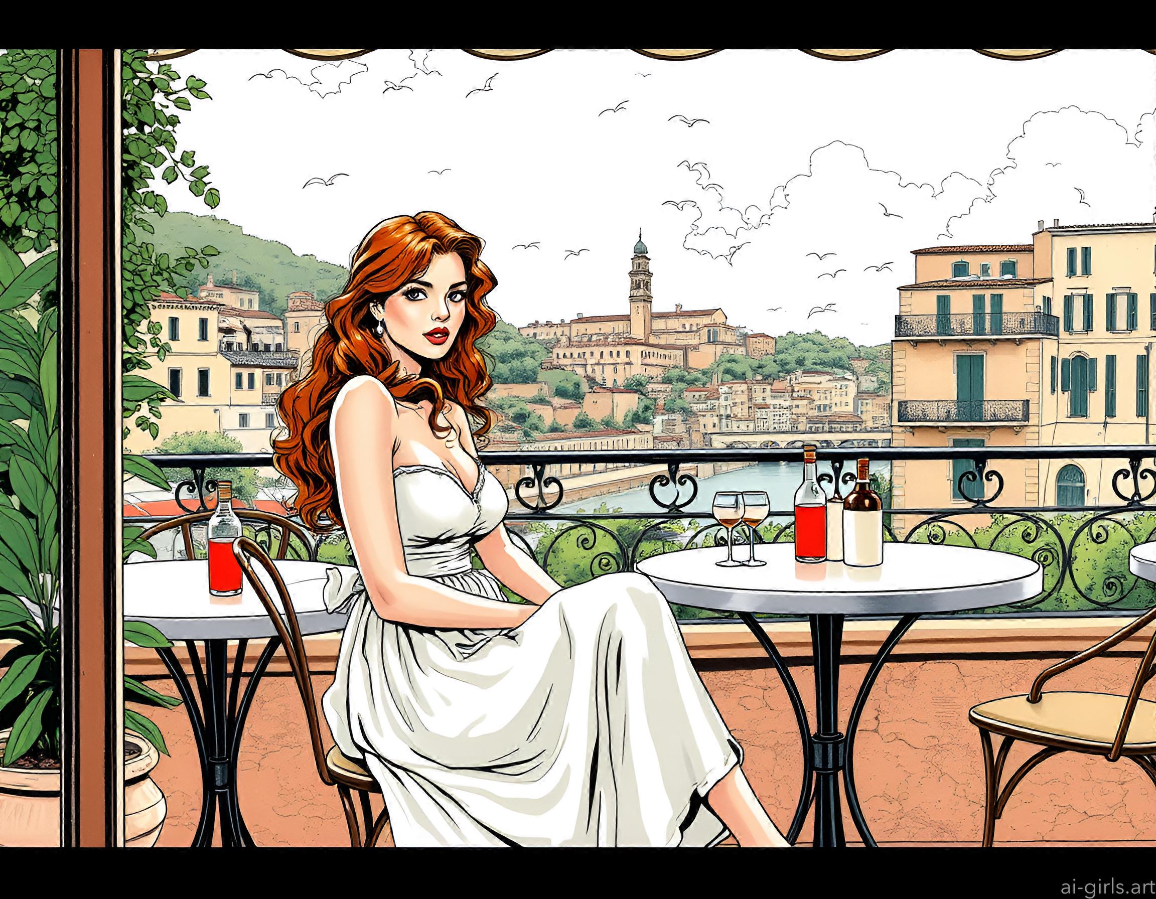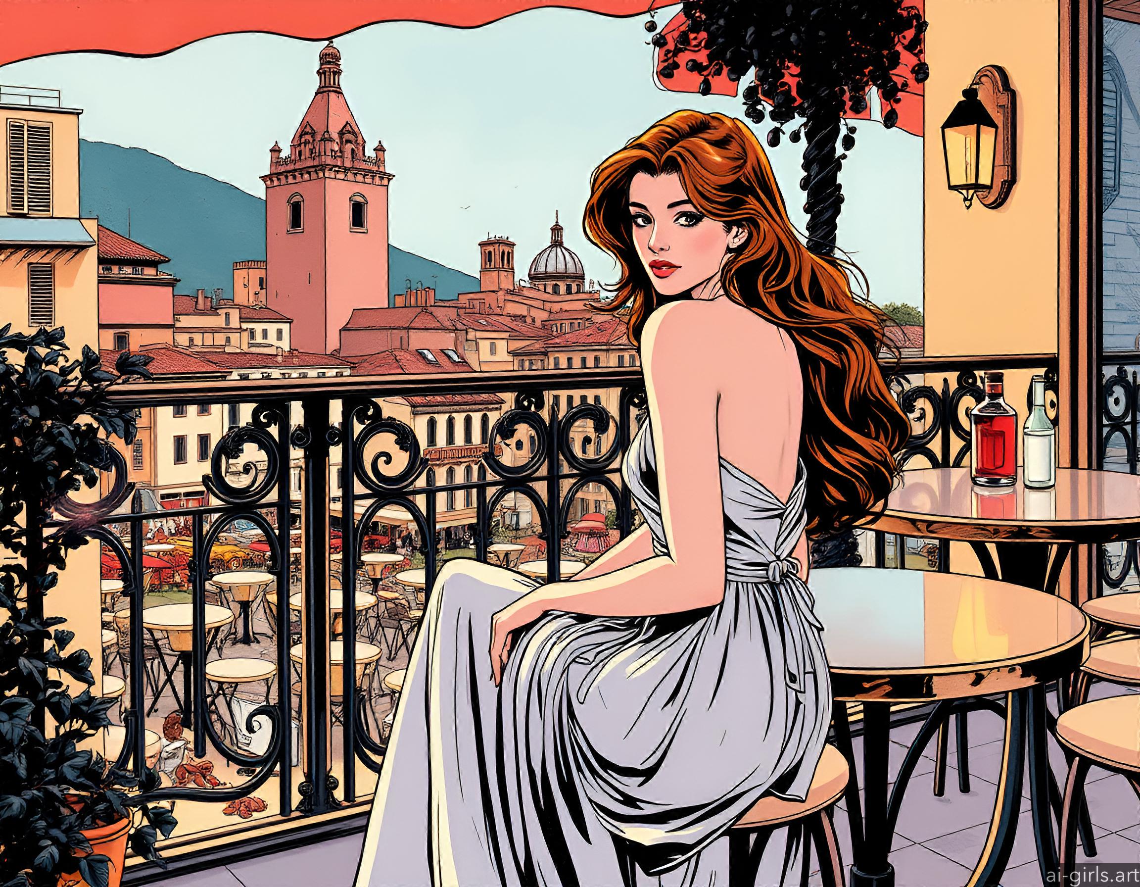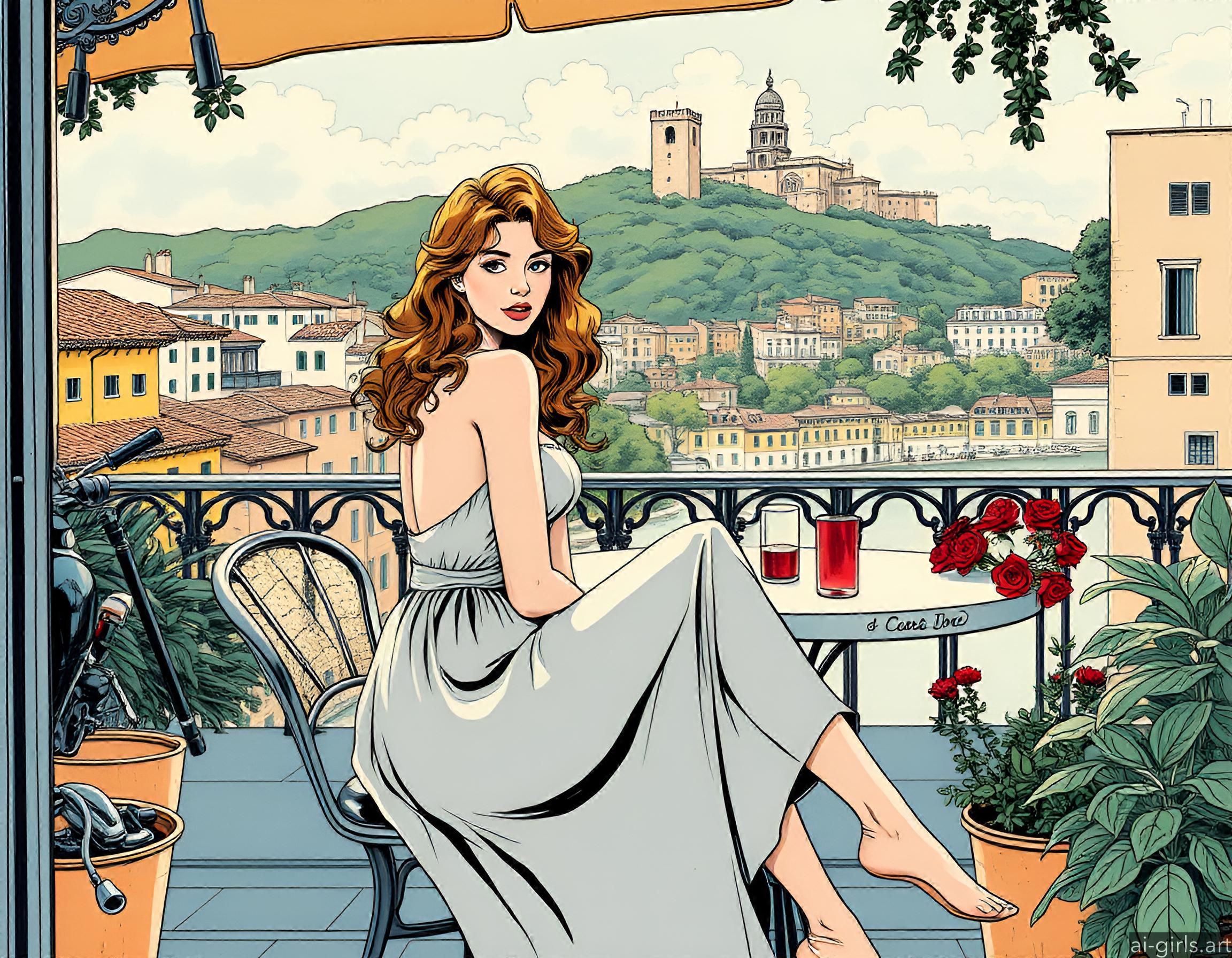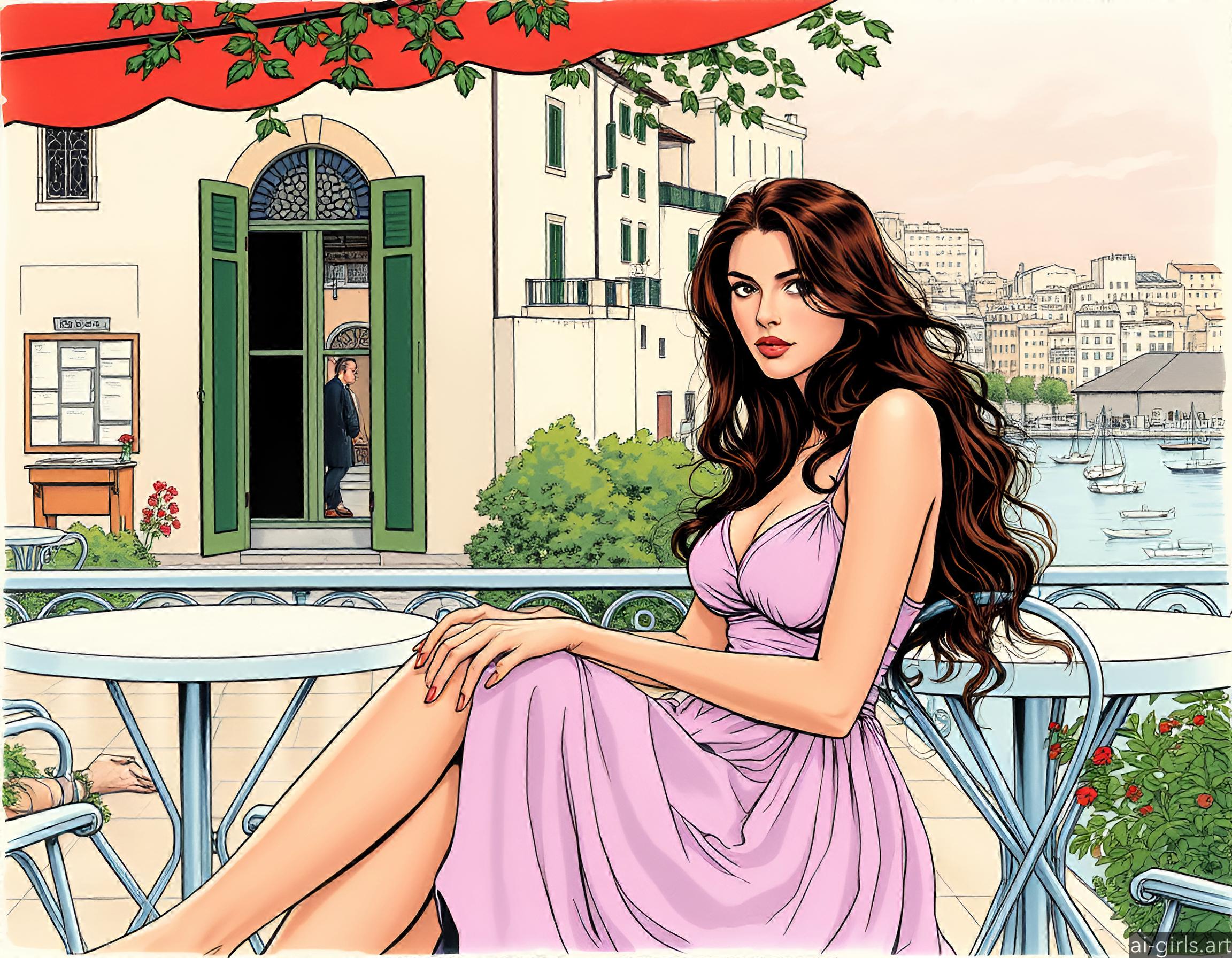 A sexy young woman wearing a summer dress sitting on the terrace of an italian café.