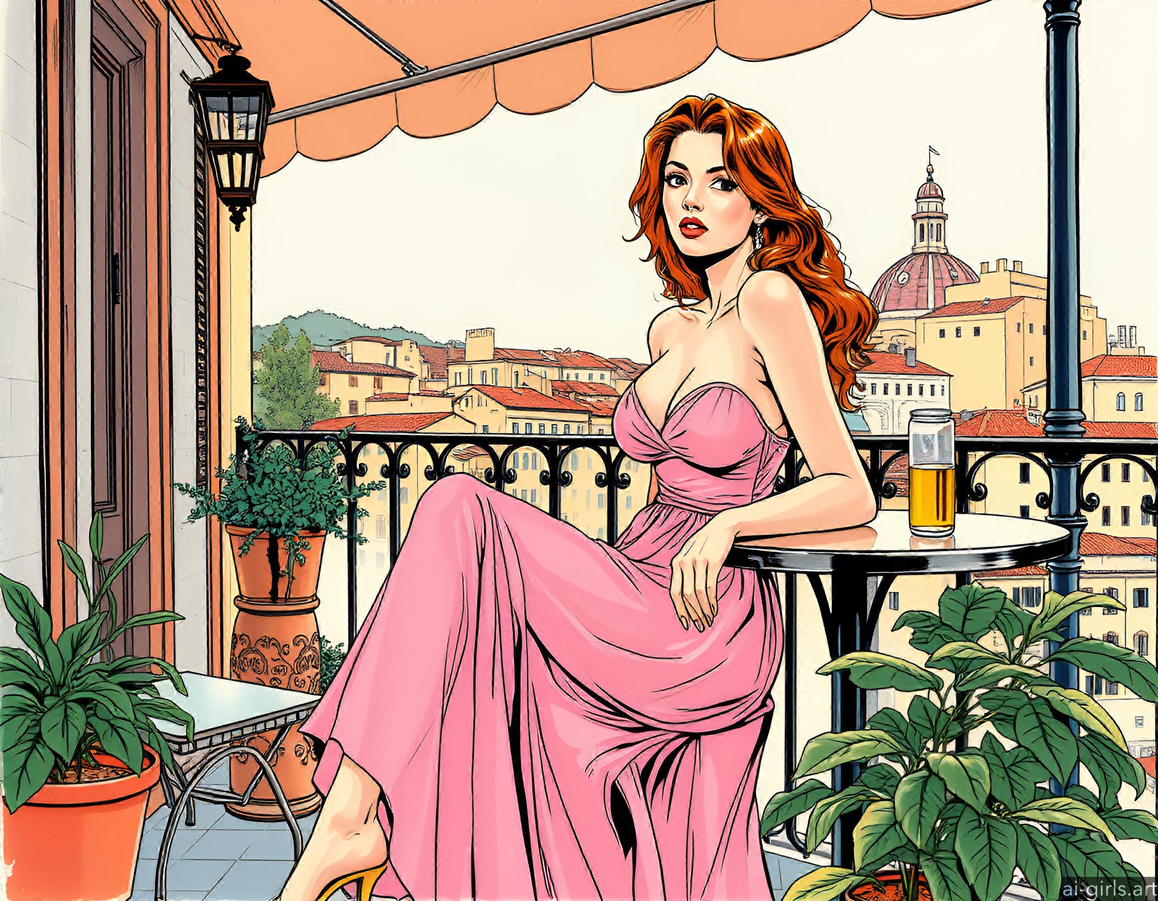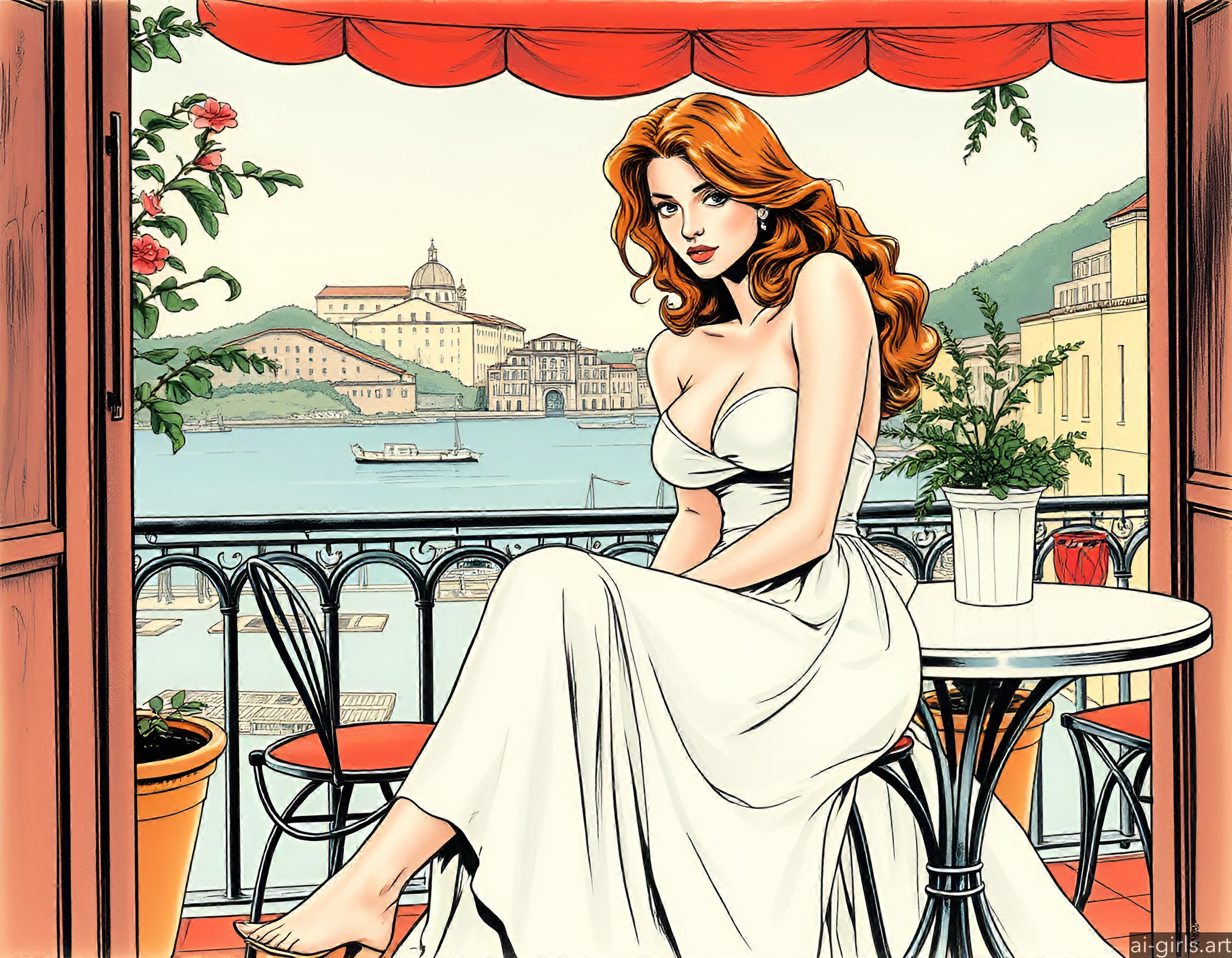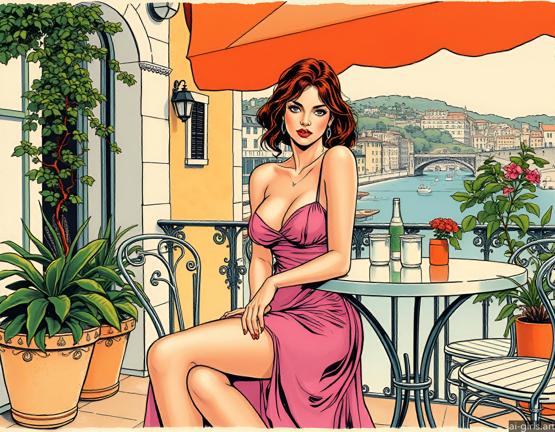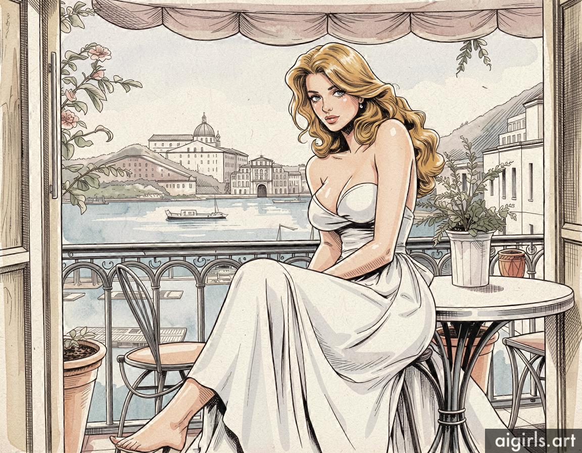 A sexy young woman wearing a summer dress sitting on the terrace of an italian café.