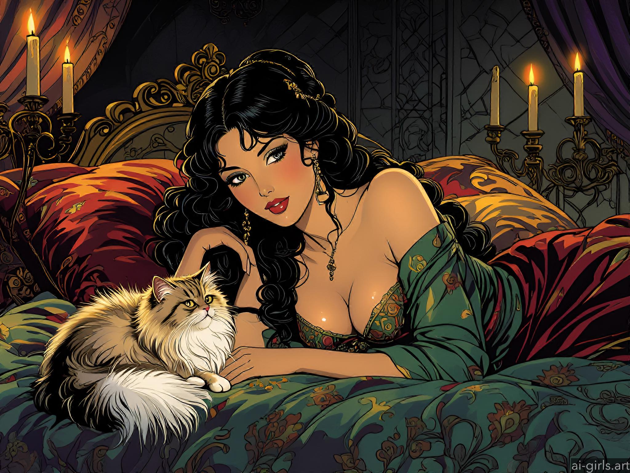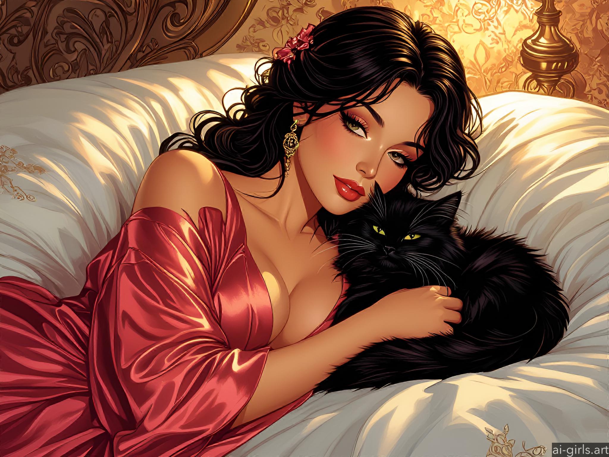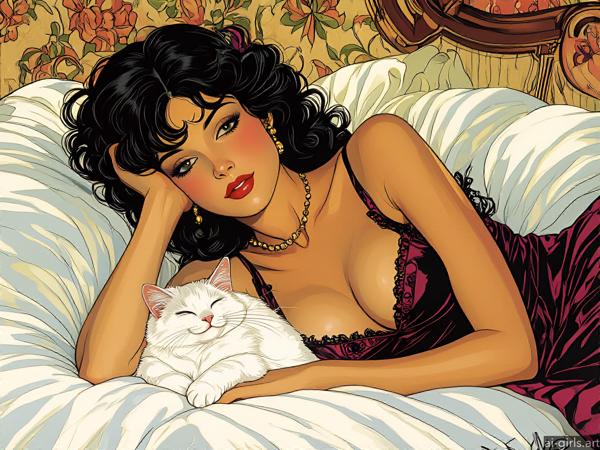 Girl lying on a bed with her cat