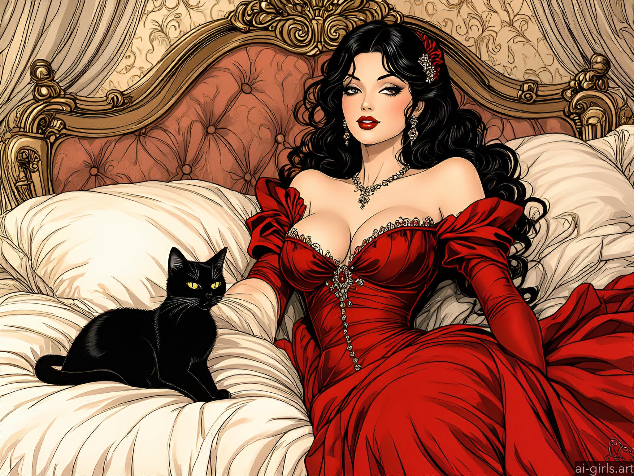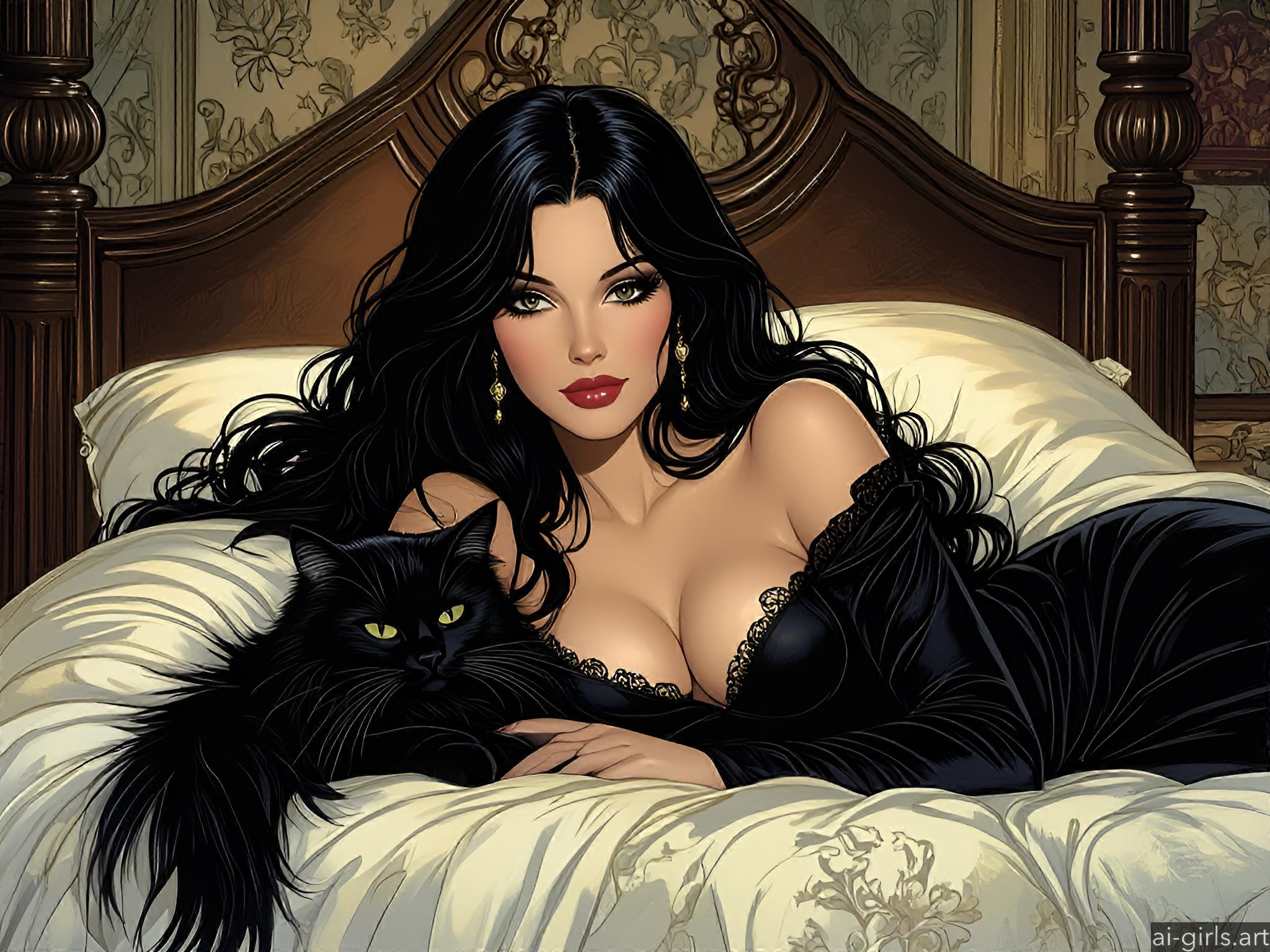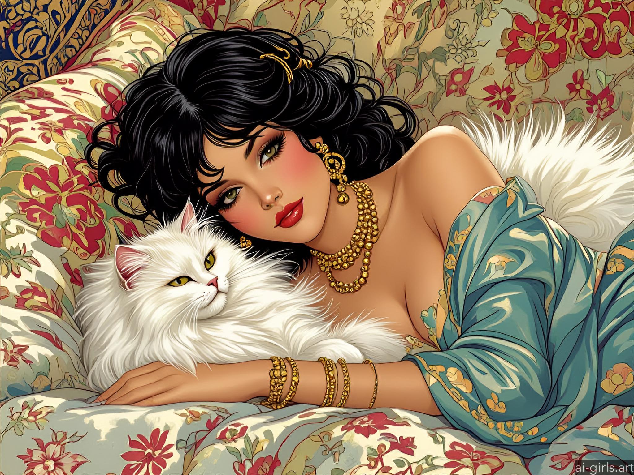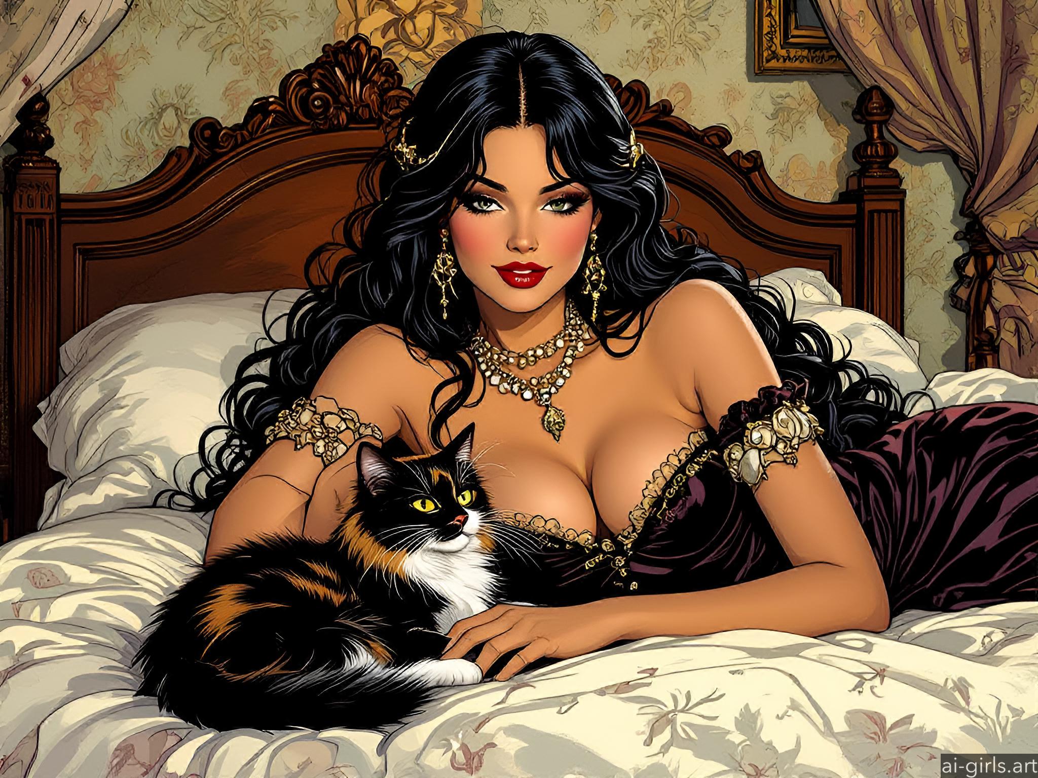 Girl lying on a bed with her cat