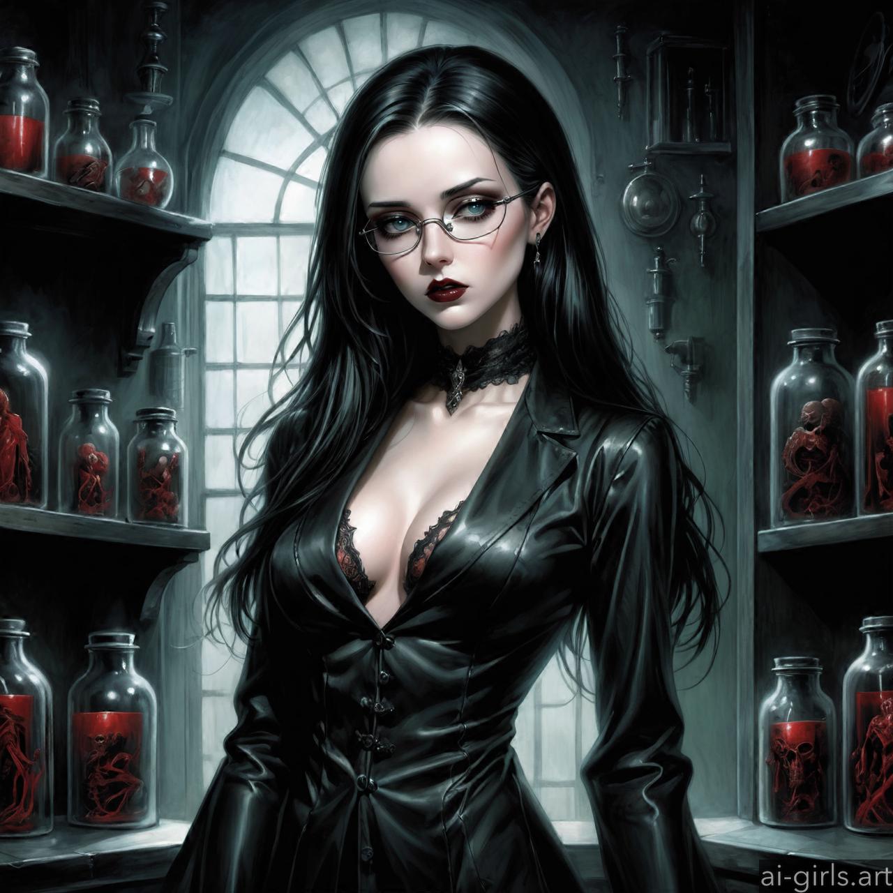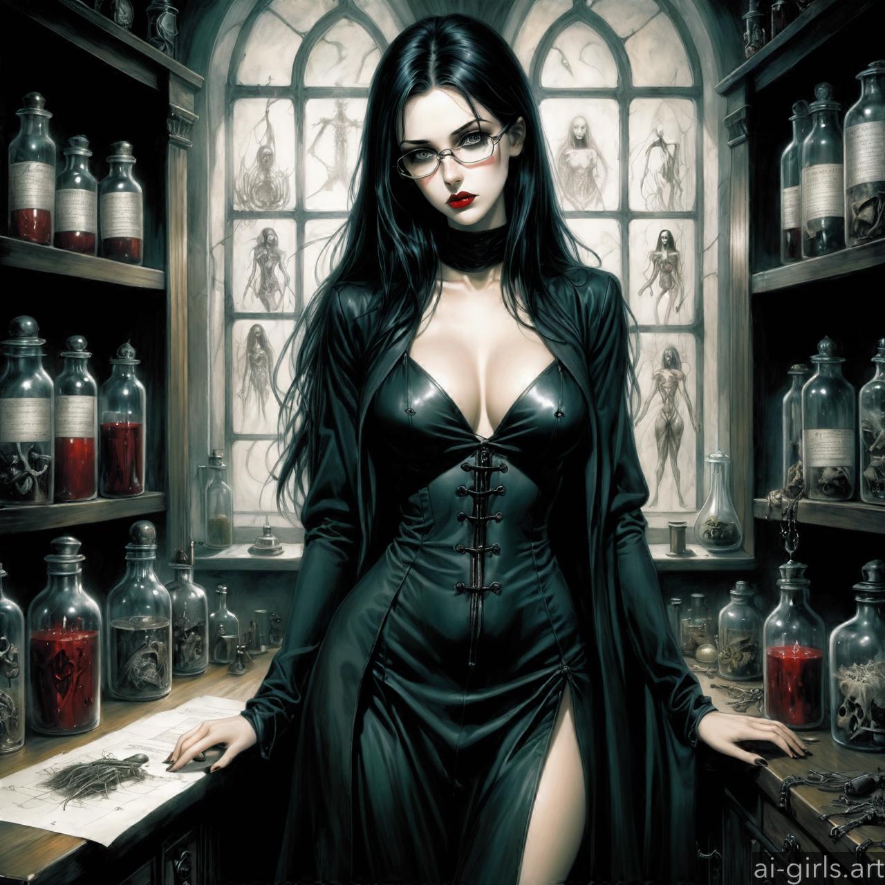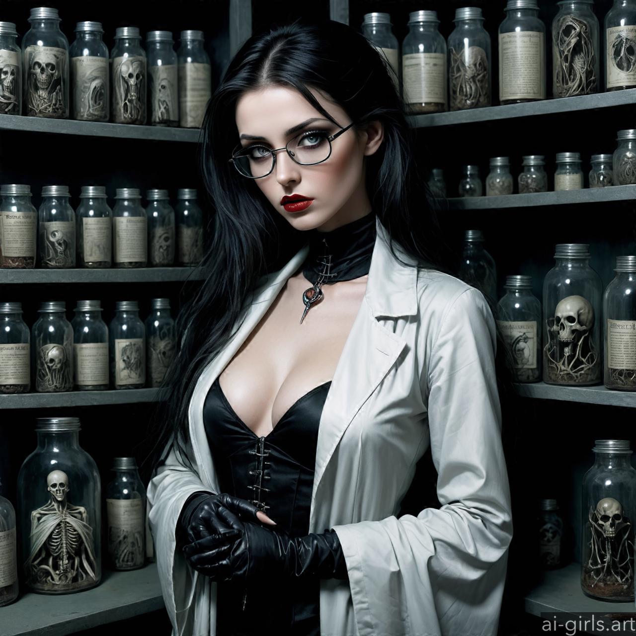 A dark fantasy illustration of a young alluring scientist woman in a gothic laboratory shrouded in darkness and shadows with anatomical charts, bookcases, cupboards with flask and jars with preserved specimens standing by the Mortuary table.