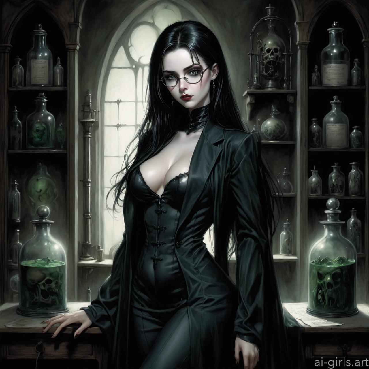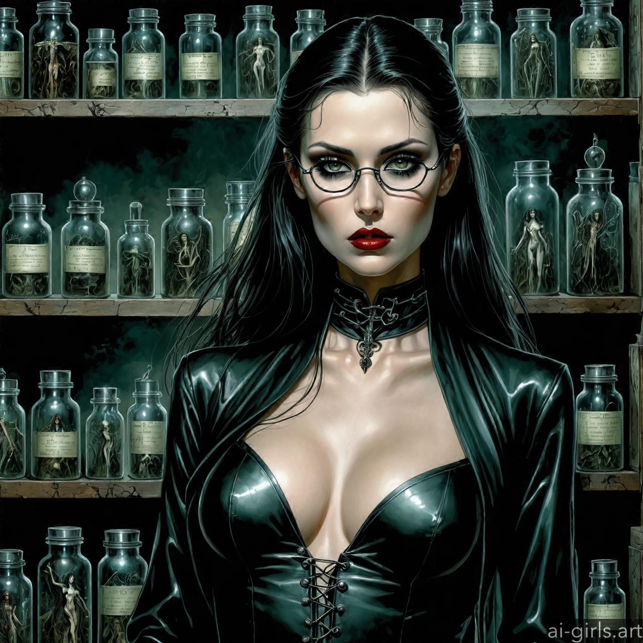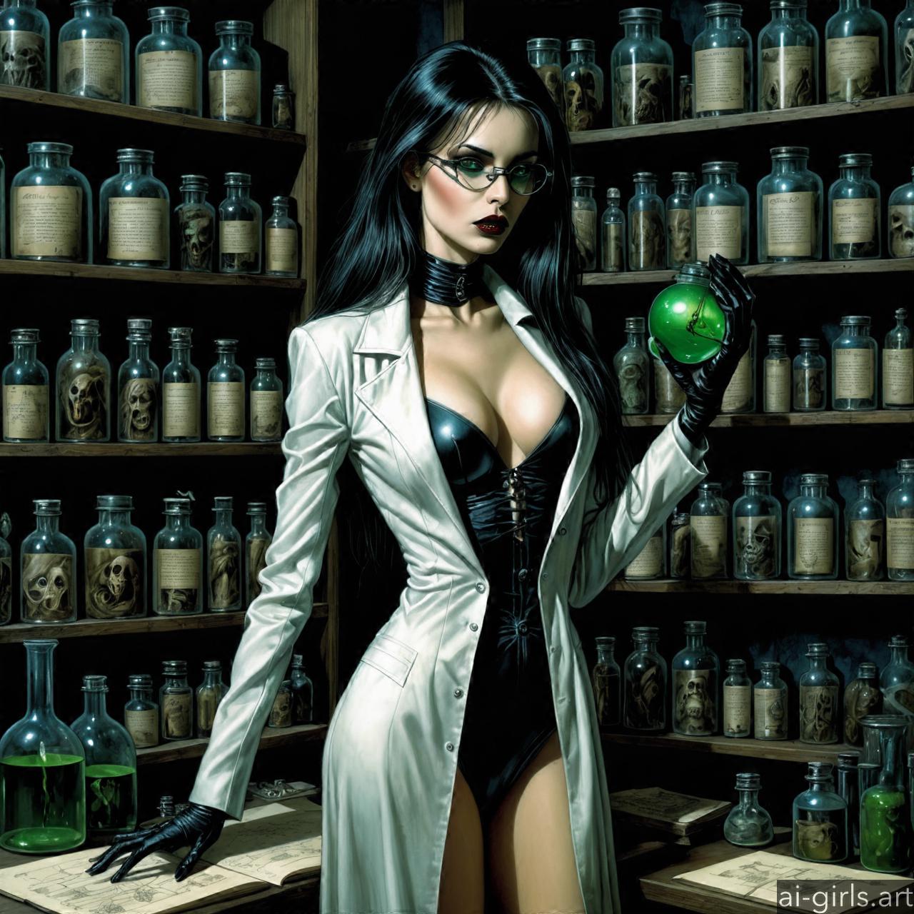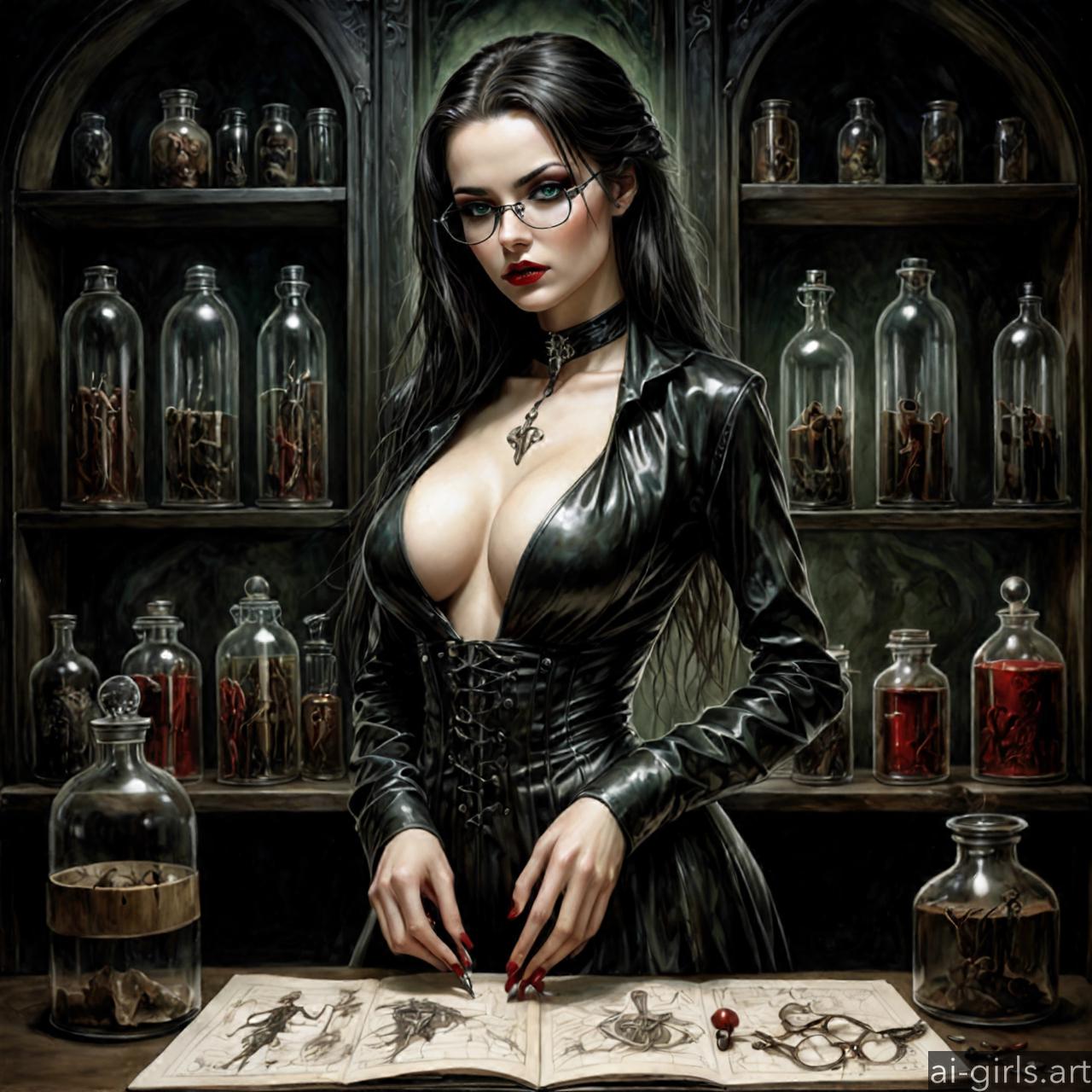 A dark fantasy illustration of a young alluring scientist woman in a gothic laboratory shrouded in darkness and shadows with anatomical charts, bookcases, cupboards with flask and jars with preserved specimens standing by the Mortuary table.