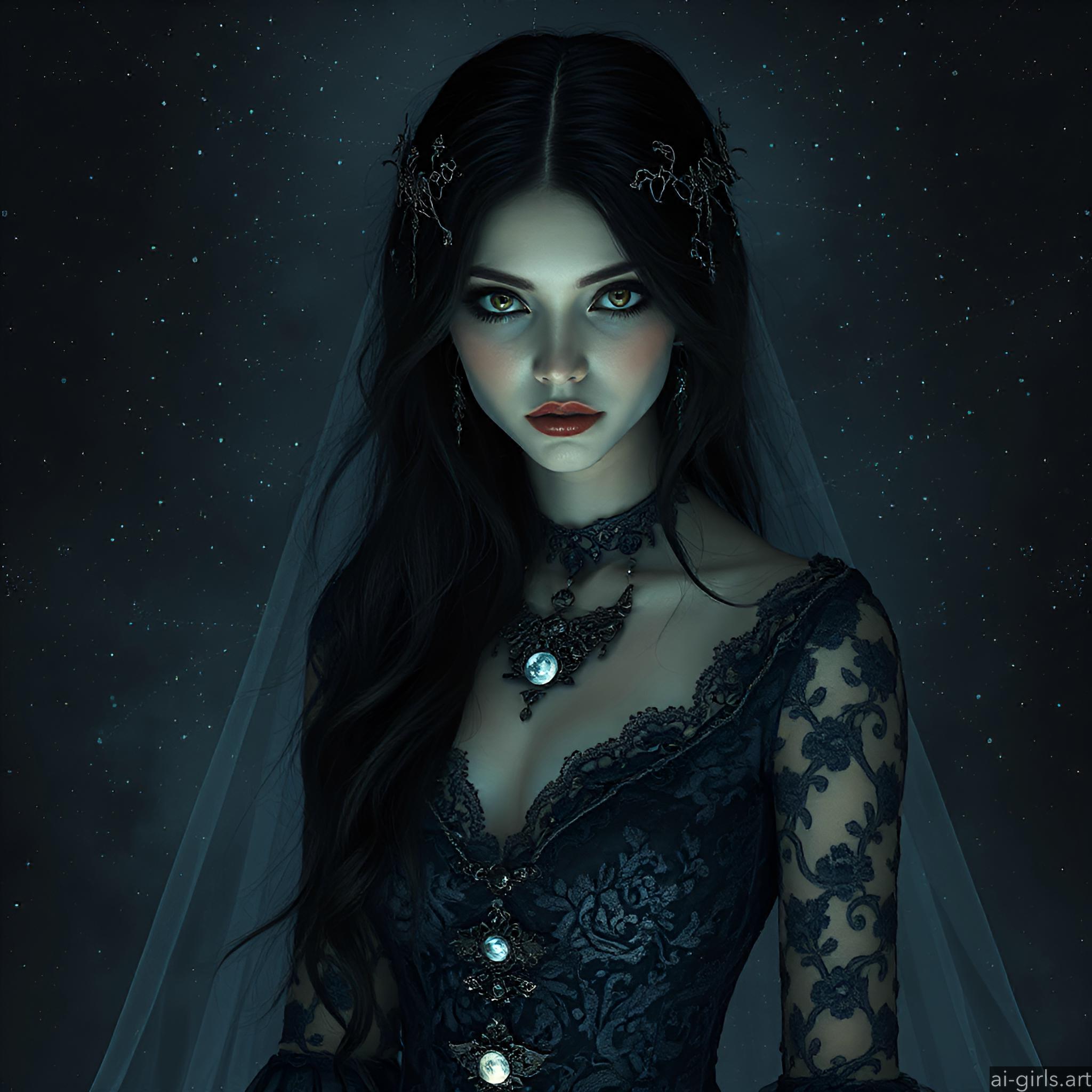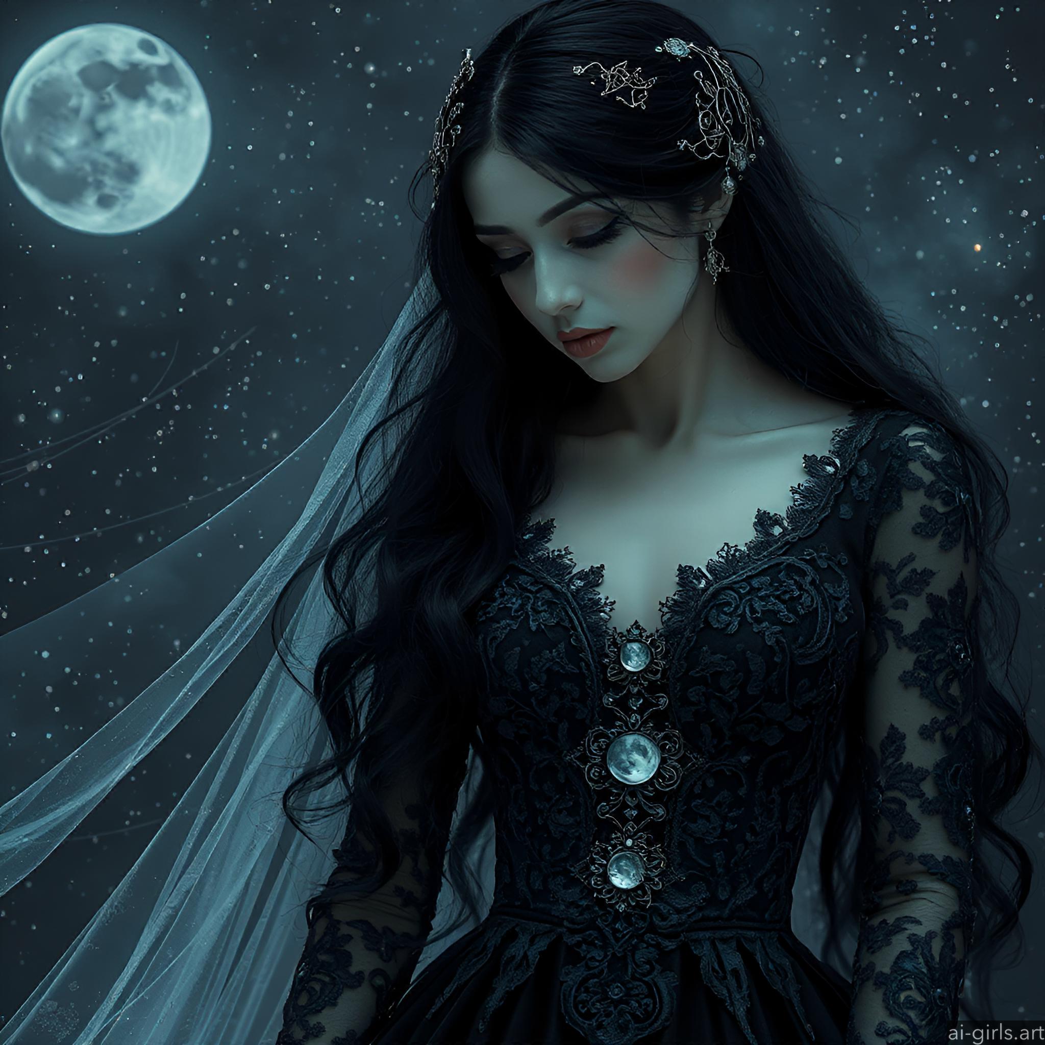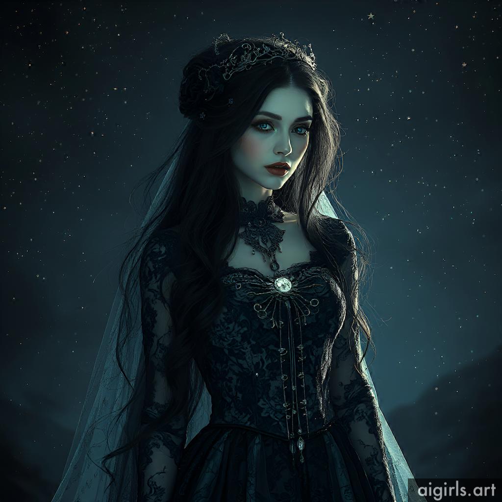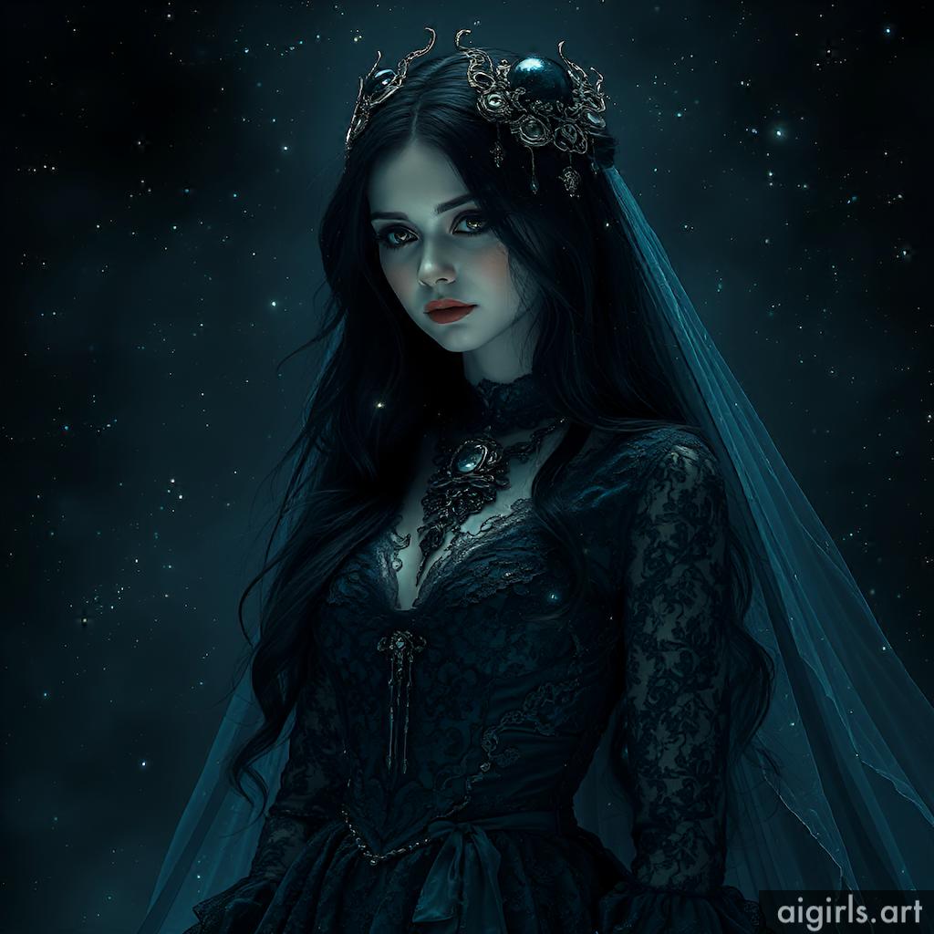 A mystical and enchanting dark fantasy Gothic bride with long black hair and a porcelain skin. She wears a tattered midnight blue lace gown.