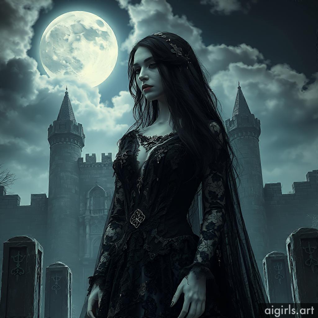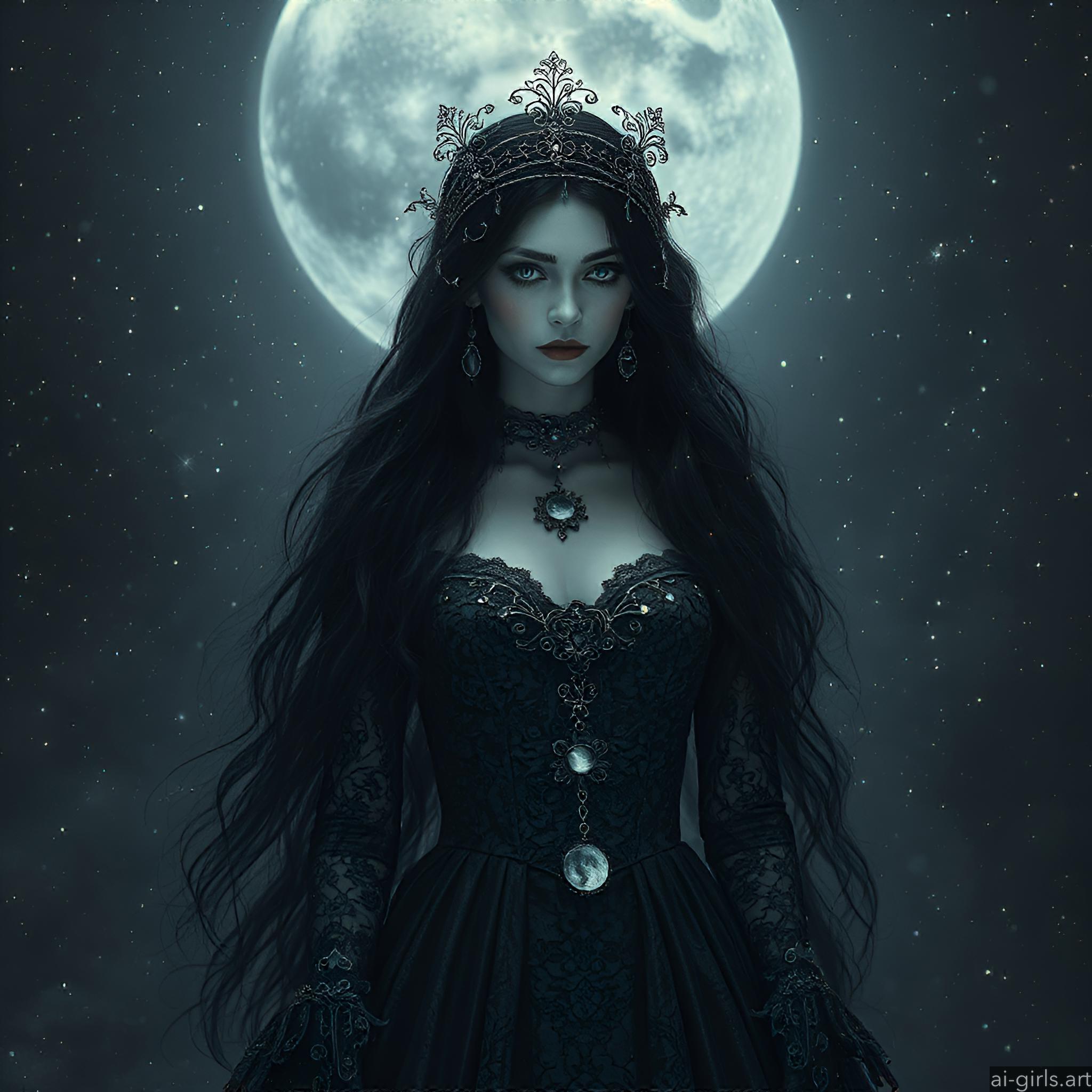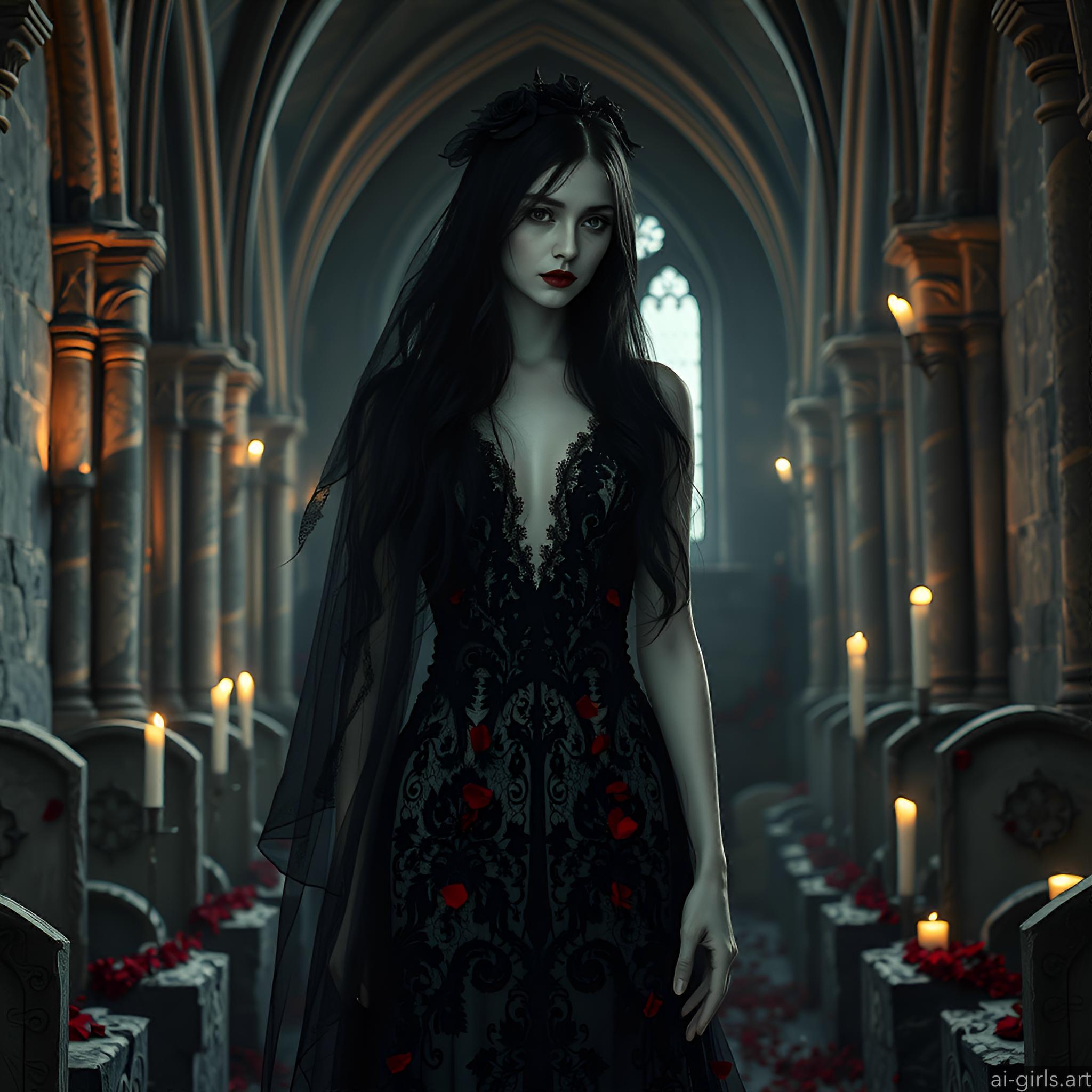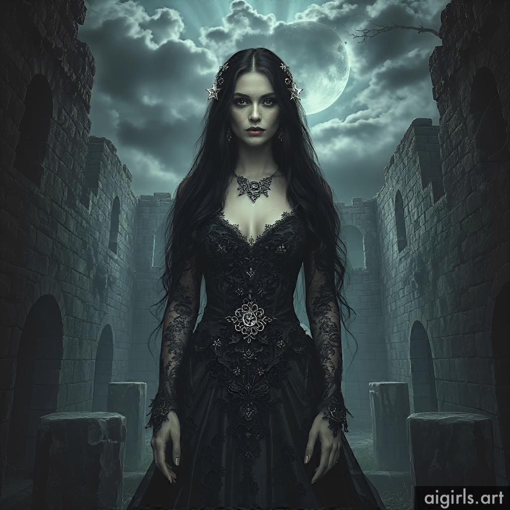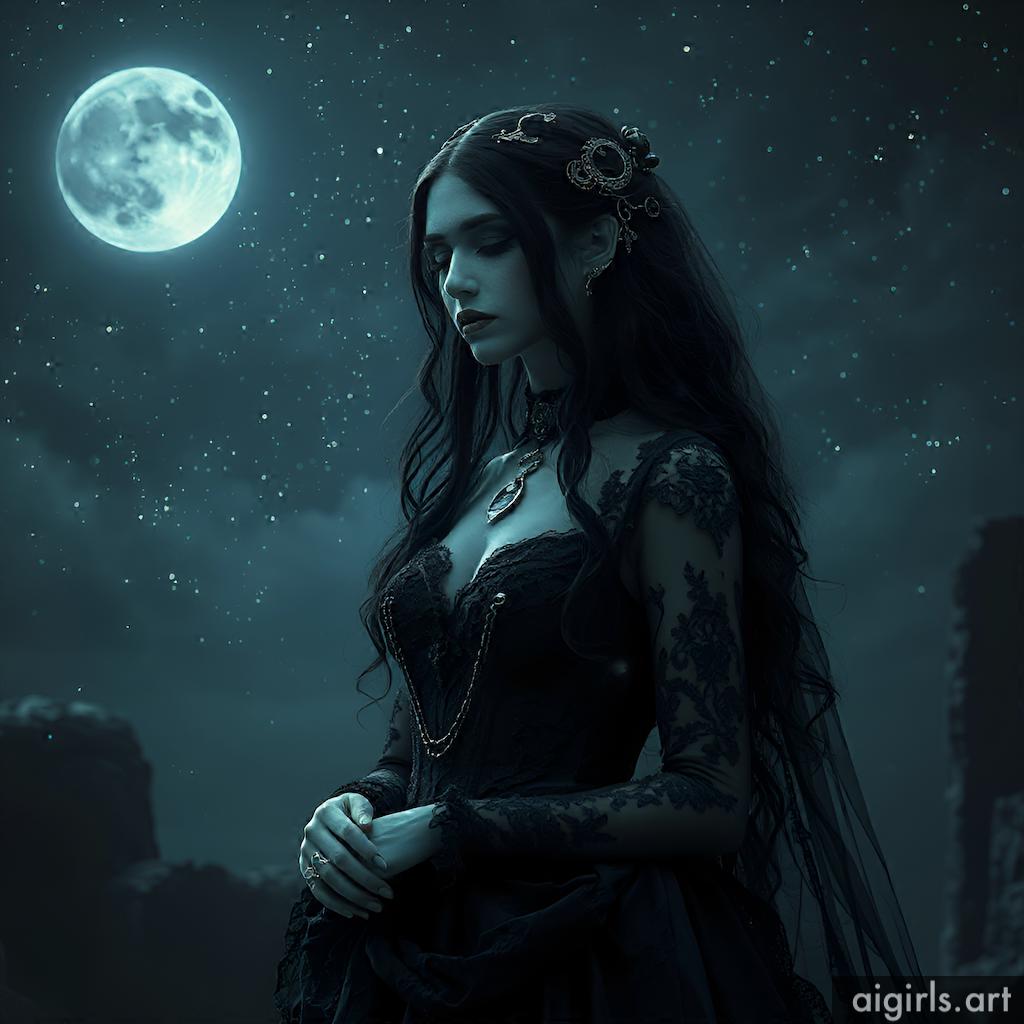 A mystical and enchanting dark fantasy Gothic bride with long black hair and a porcelain skin. She wears a tattered midnight blue lace gown.