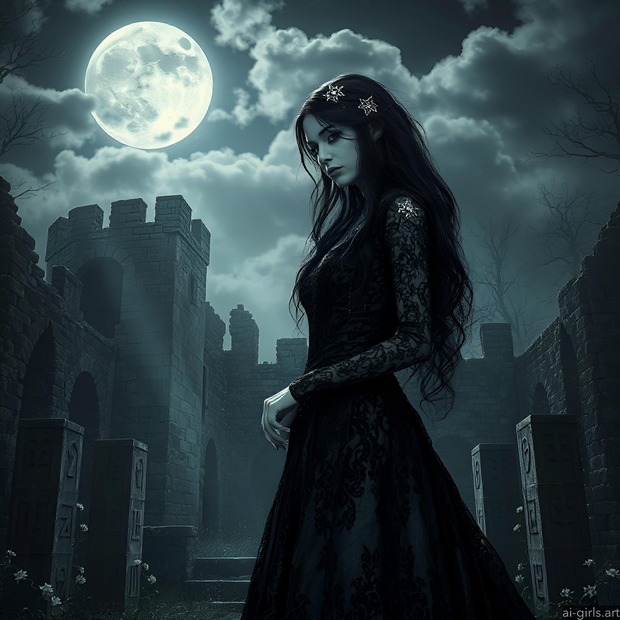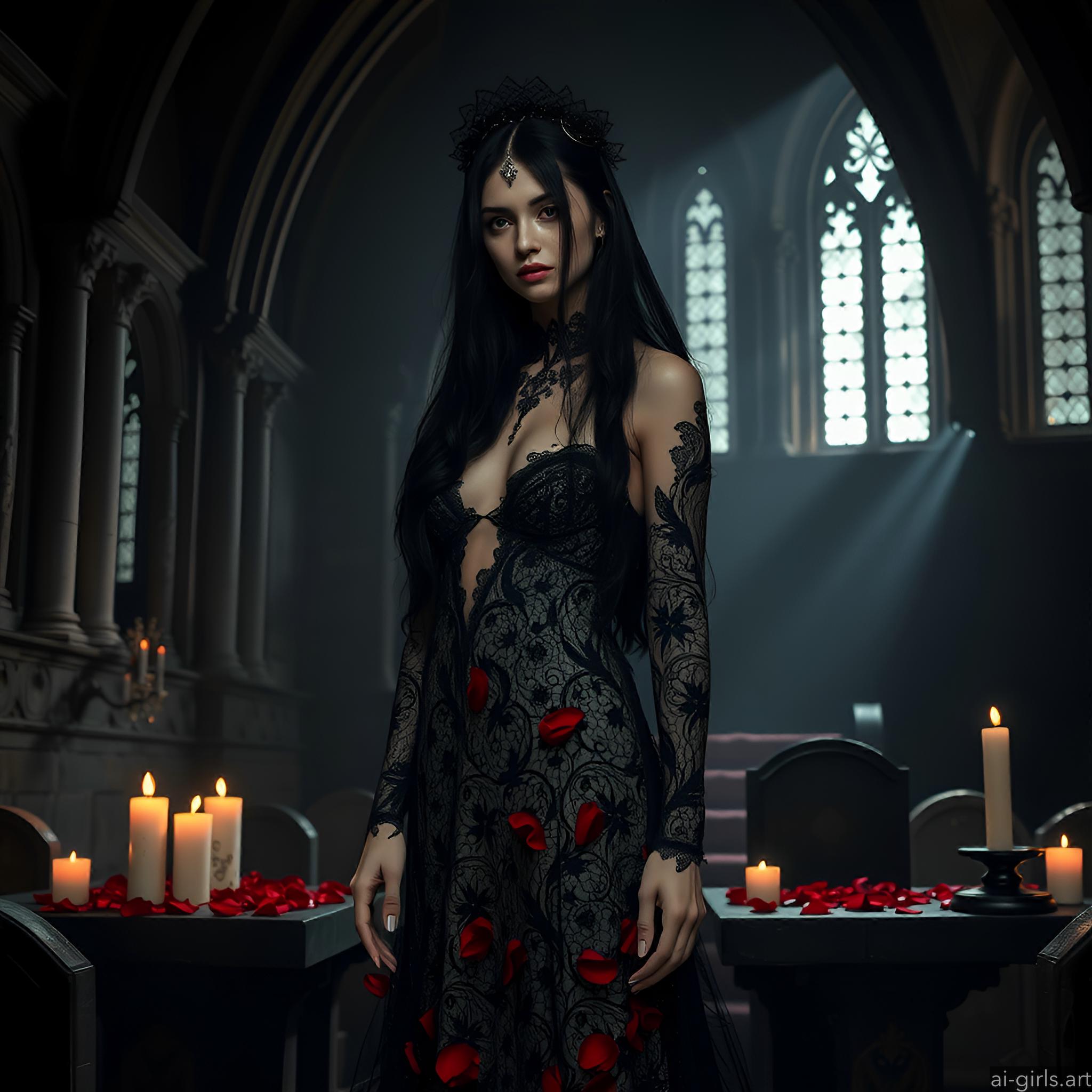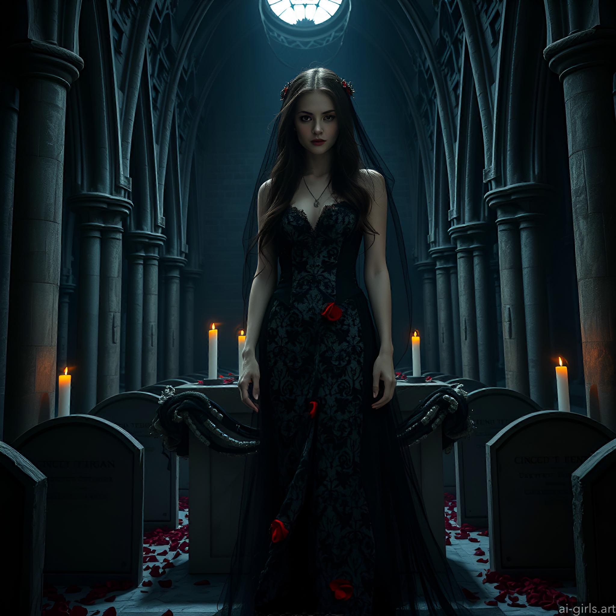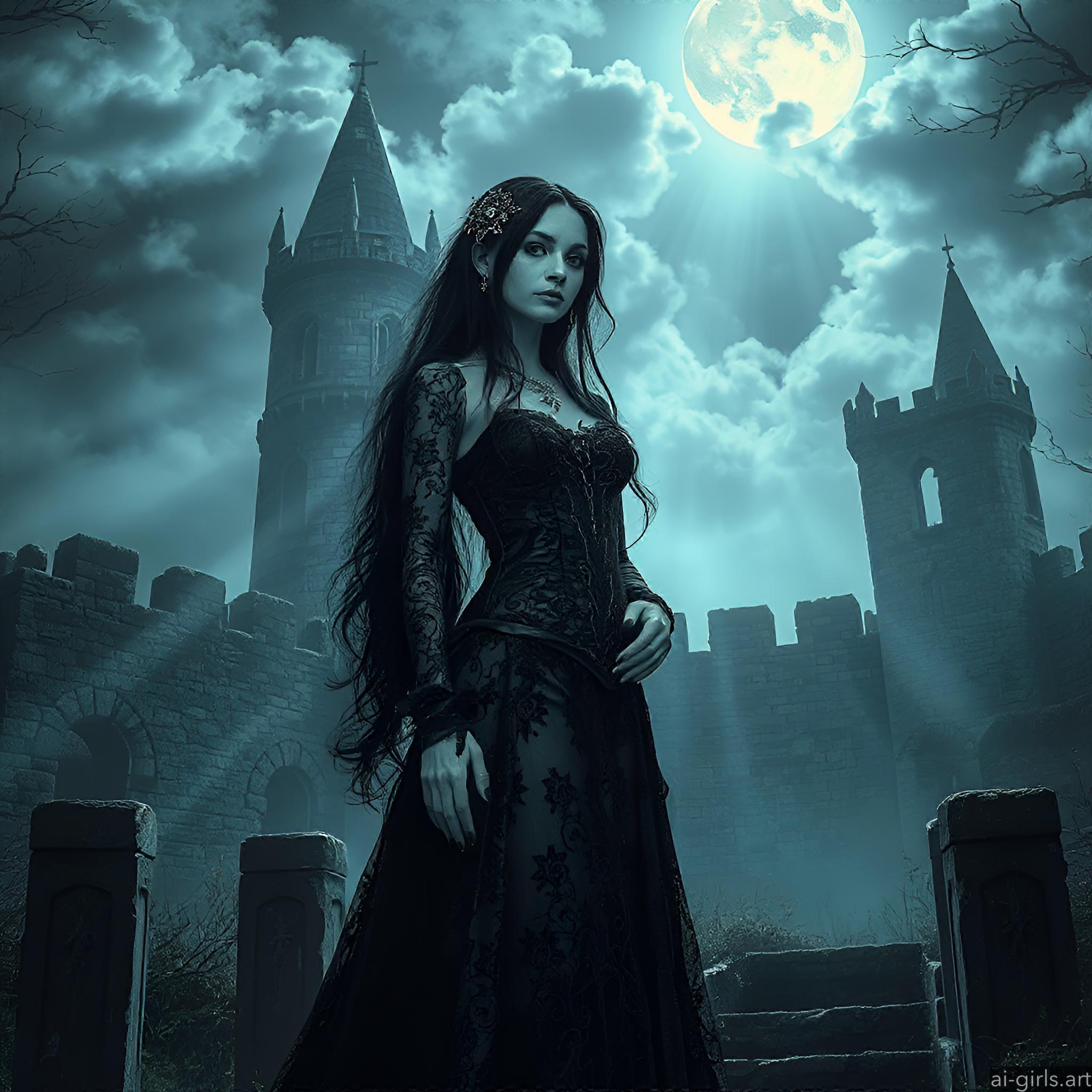 A mystical and enchanting dark fantasy Gothic bride with long black hair and a porcelain skin. She wears a tattered midnight blue lace gown.