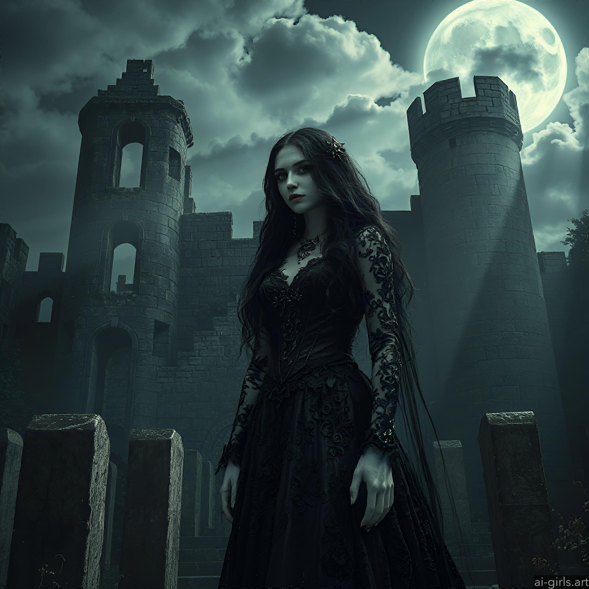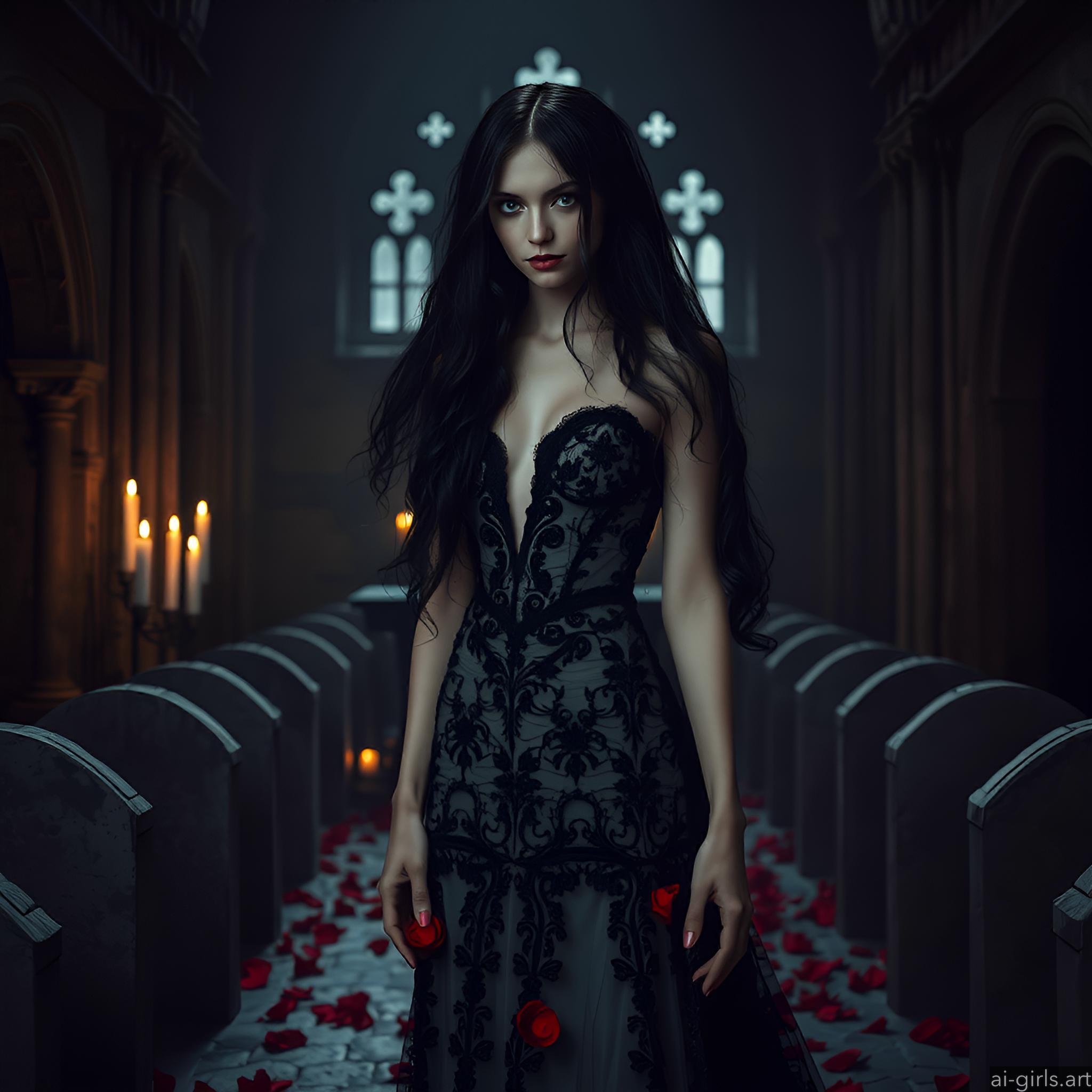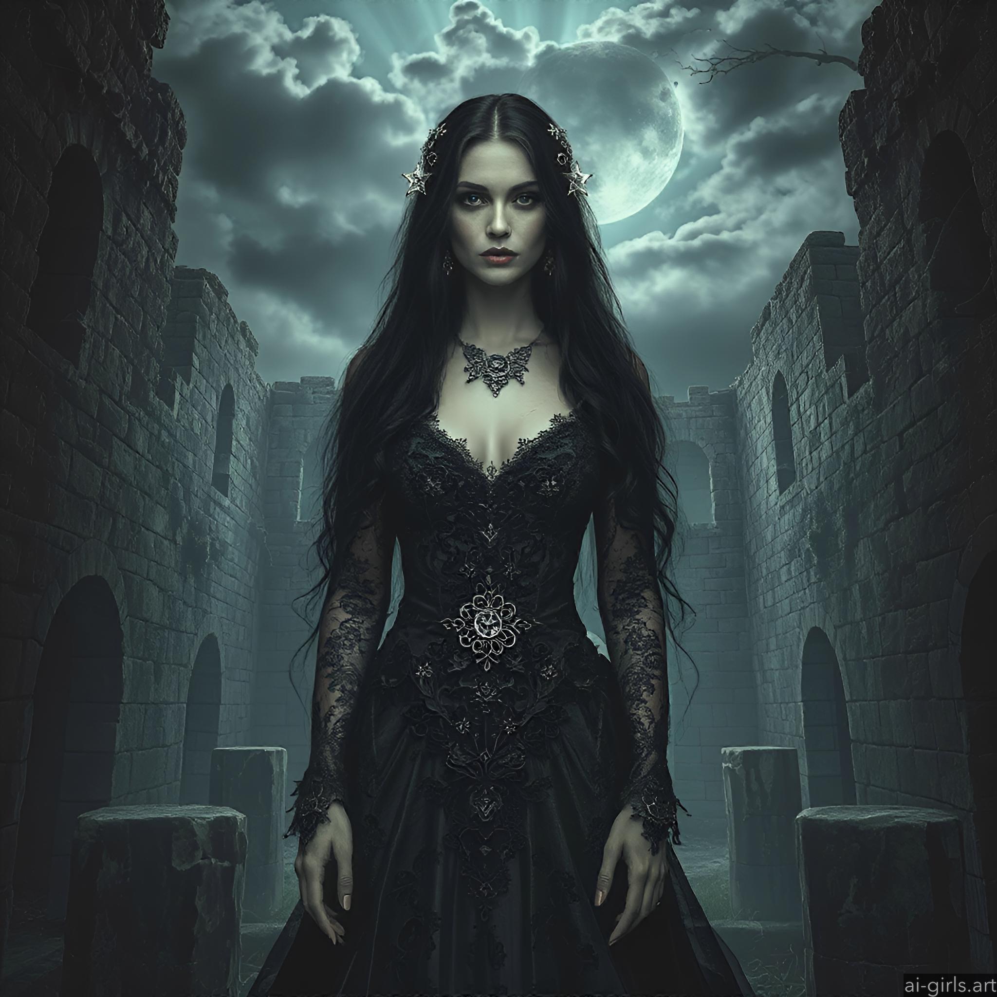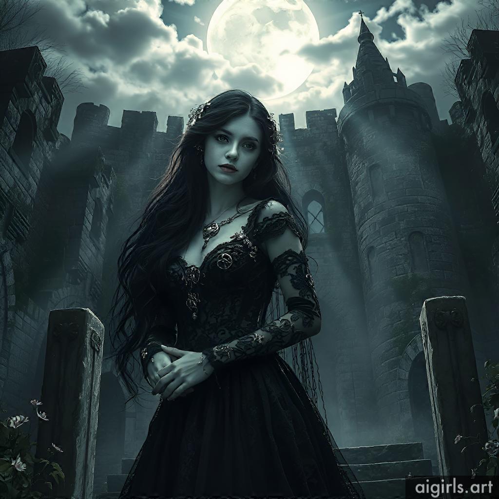 A mystical and enchanting dark fantasy Gothic bride with long black hair and a porcelain skin. She wears a tattered midnight blue lace gown.