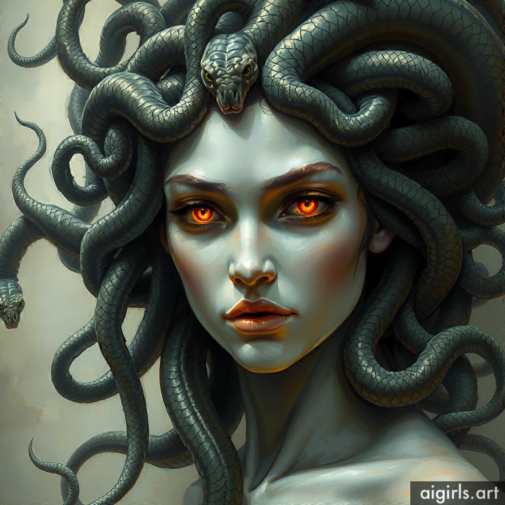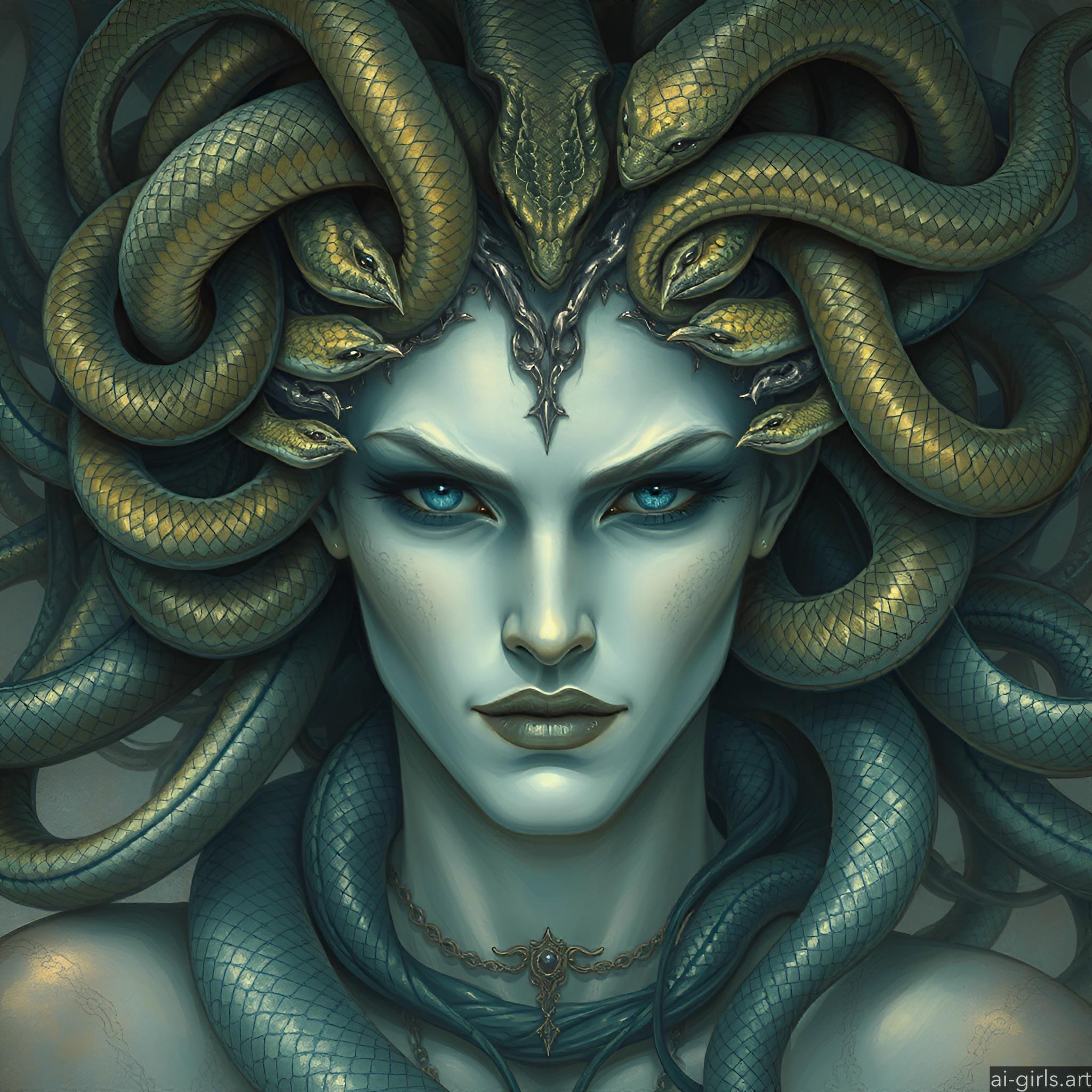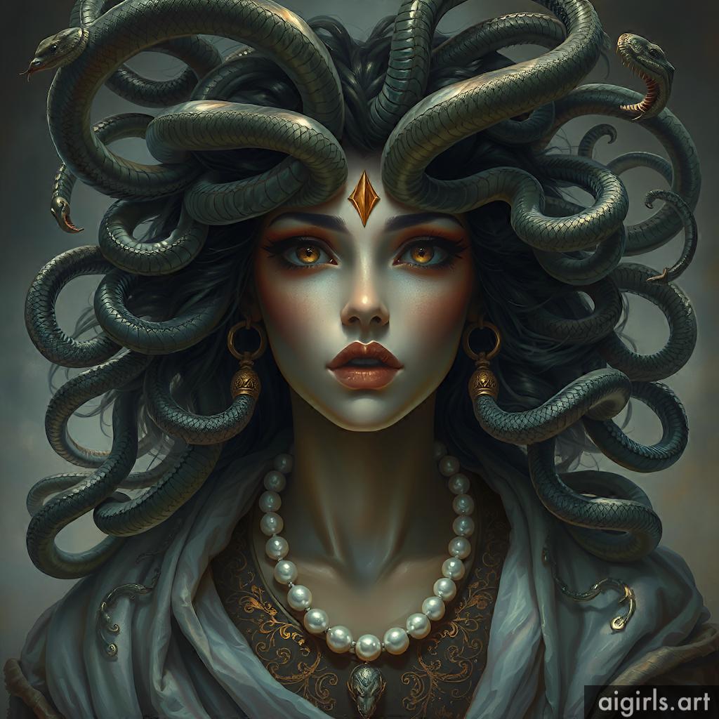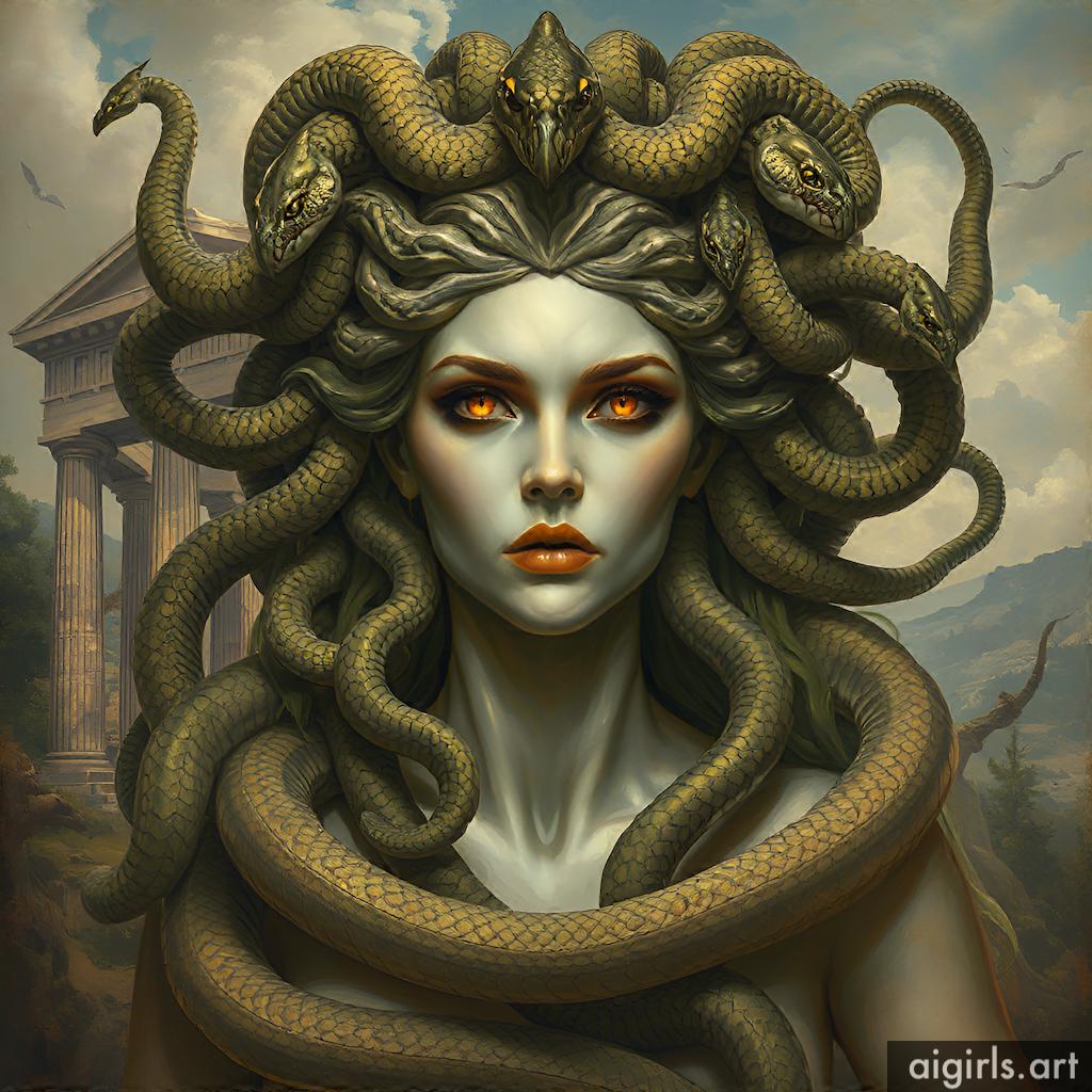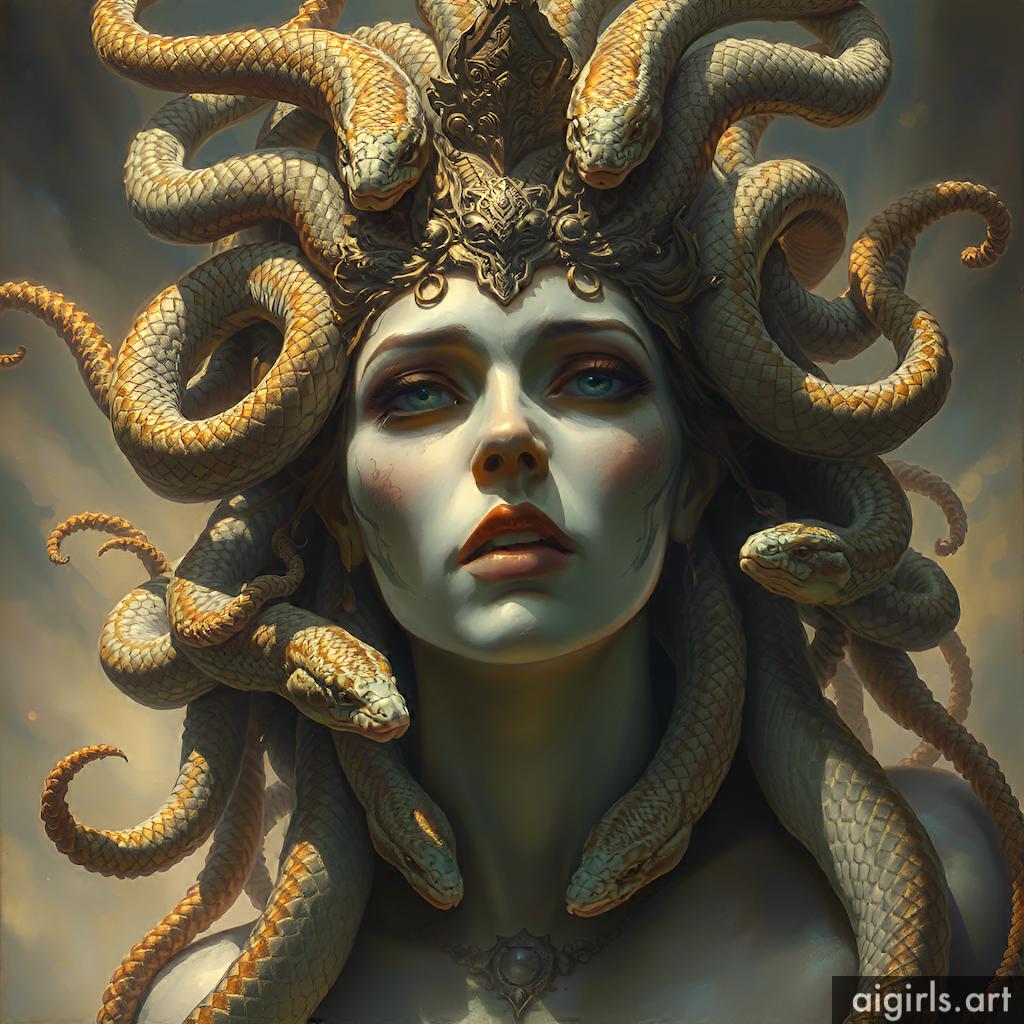 Medusa is a prominent figure in Greek mythology, known as one of the three Gorgons, the daughters of the primordial sea gods Phorcys and Ceto. She is typically depicted as a winged female creature with snakes for hair, and her gaze could turn anyone who looked at her into stone.