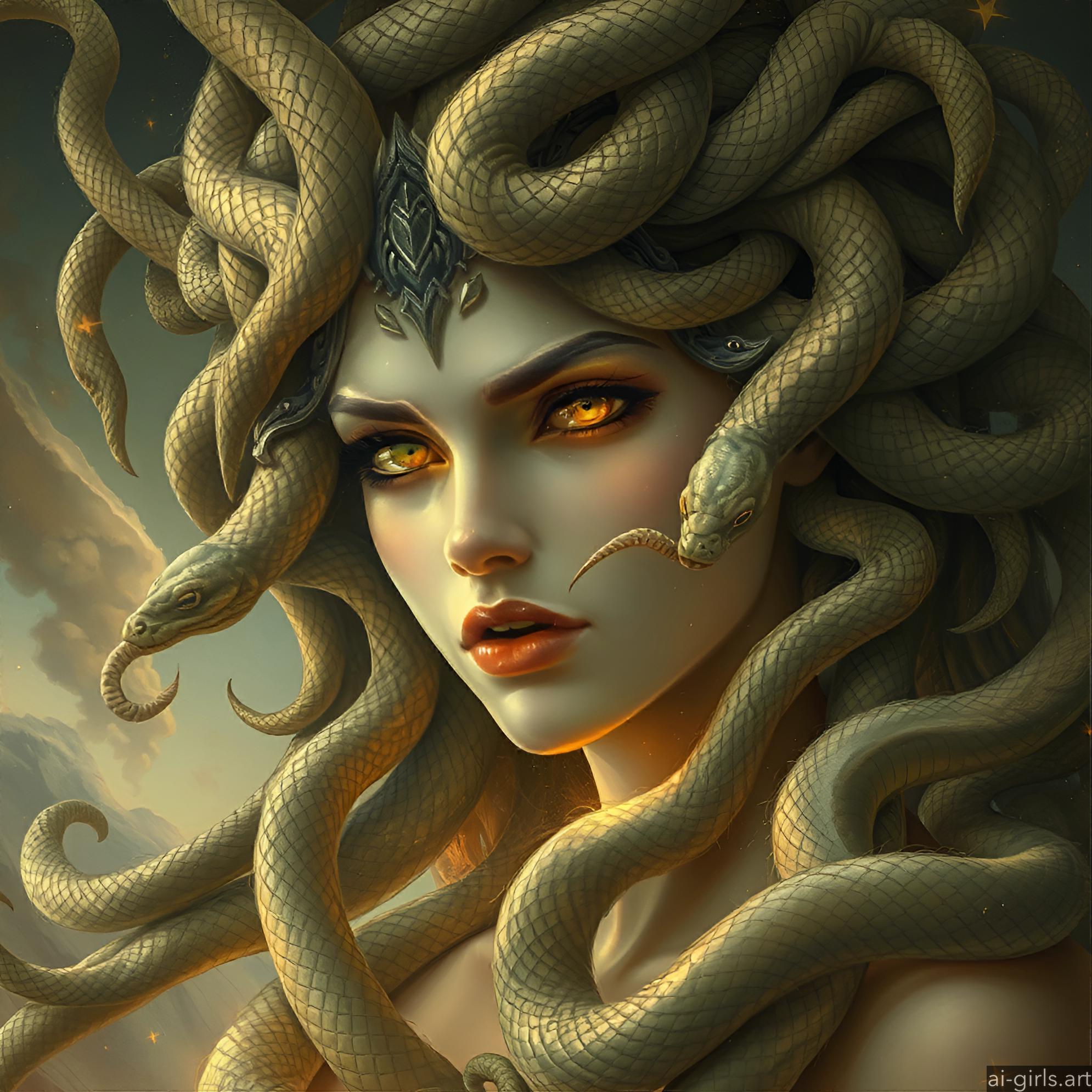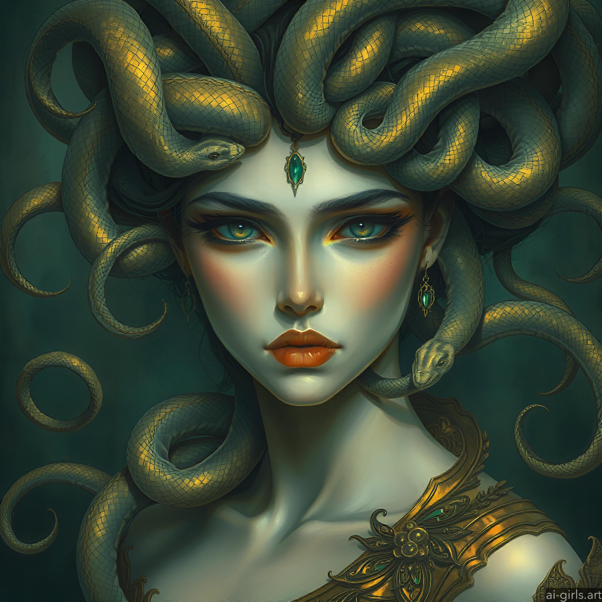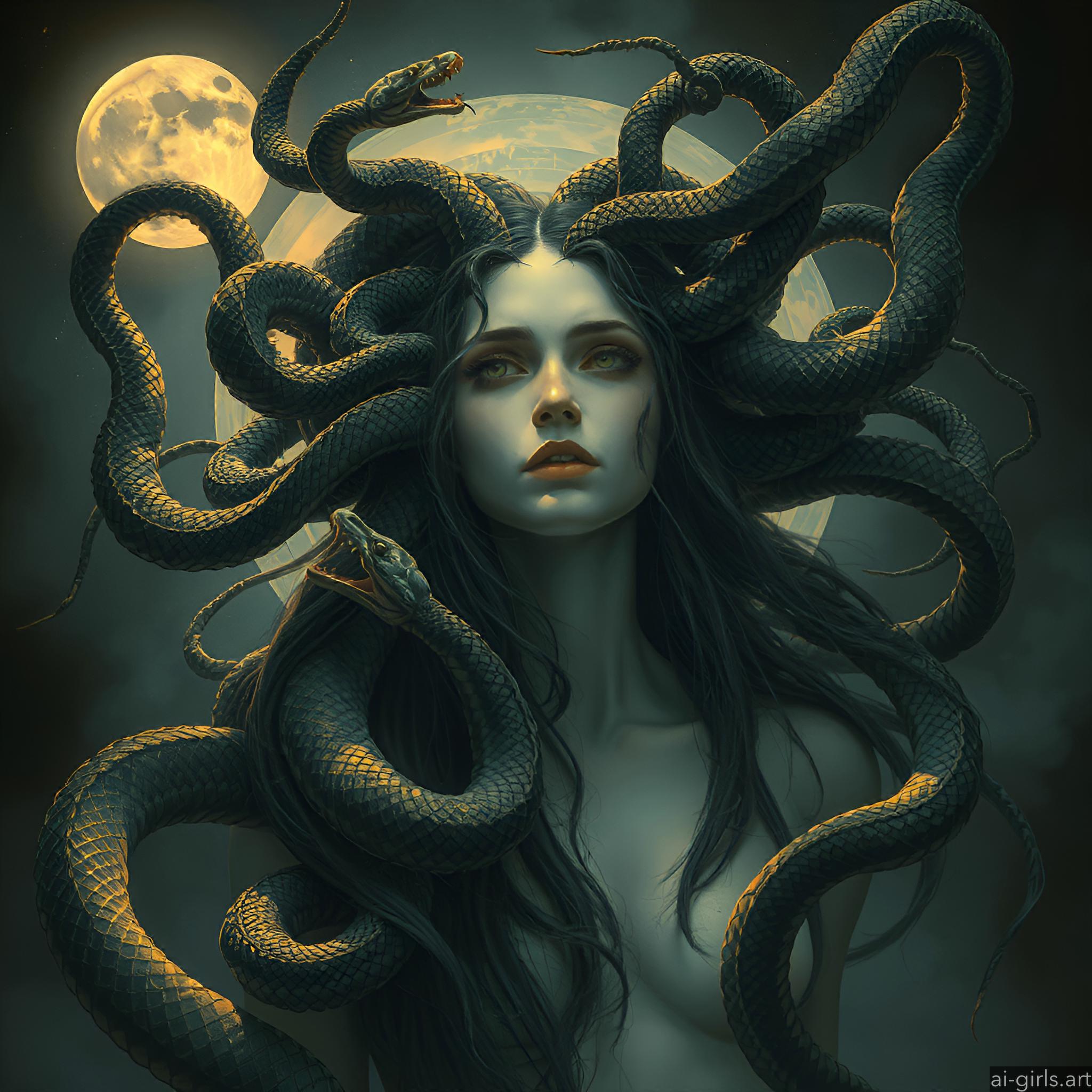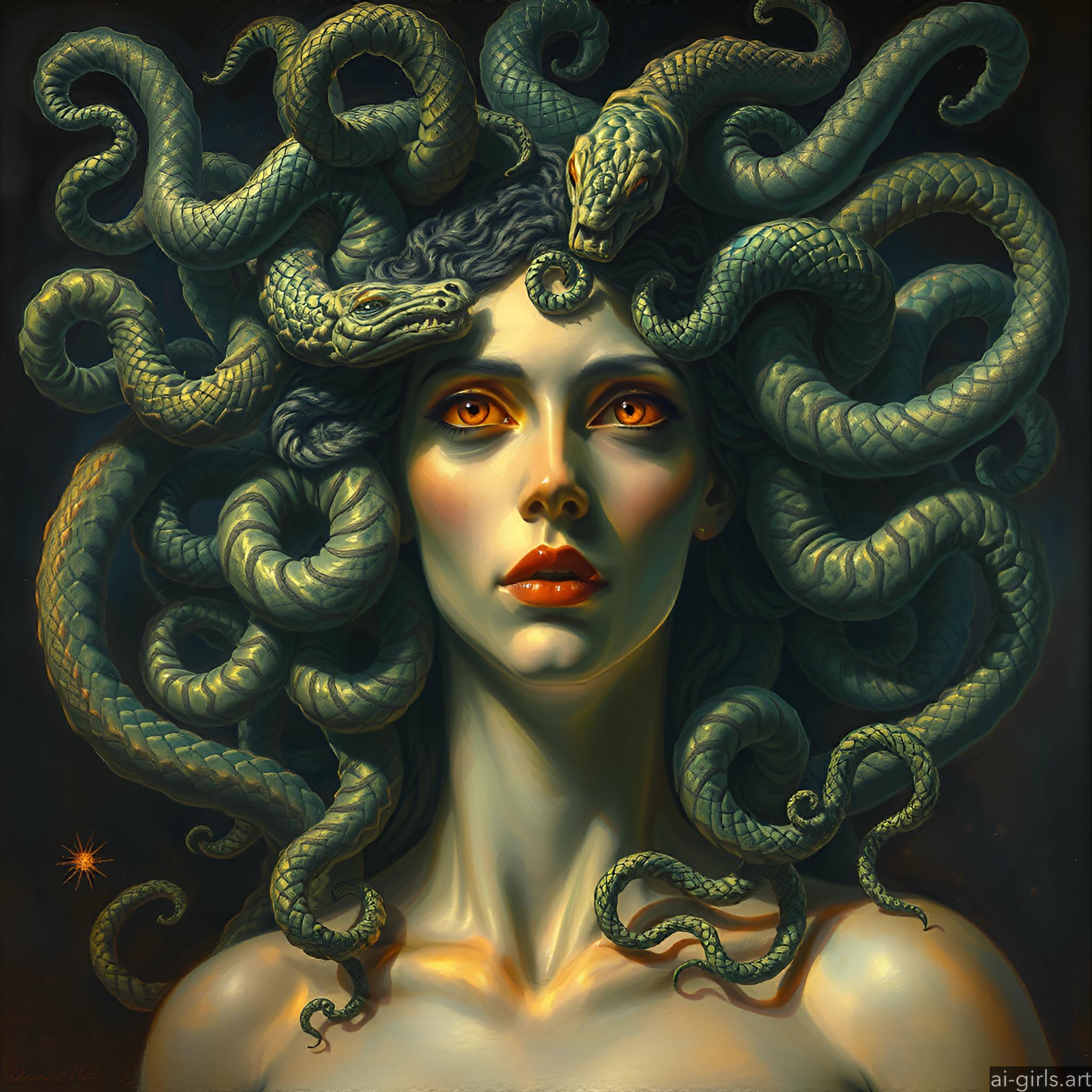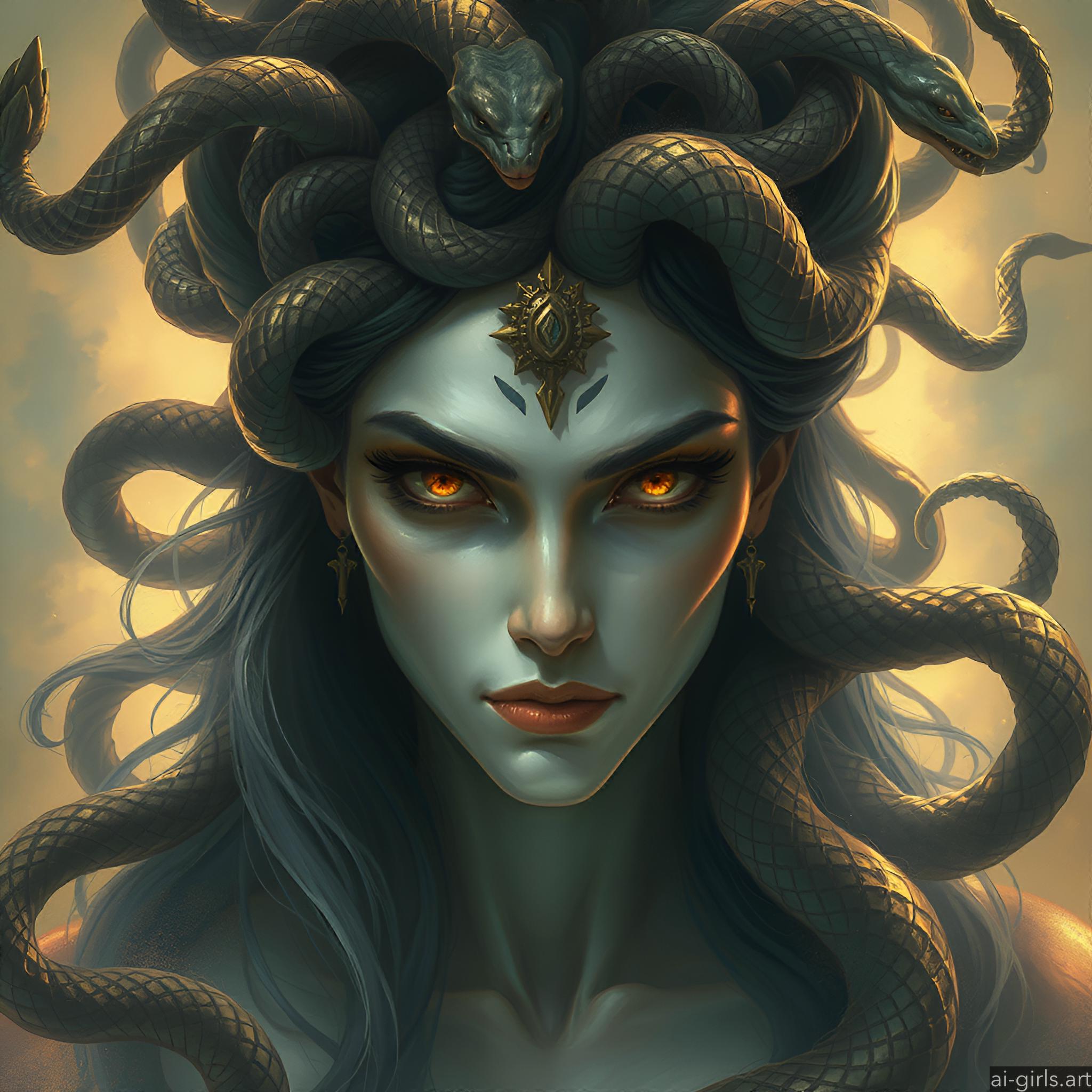 Medusa is a prominent figure in Greek mythology, known as one of the three Gorgons, the daughters of the primordial sea gods Phorcys and Ceto. She is typically depicted as a winged female creature with snakes for hair, and her gaze could turn anyone who looked at her into stone.