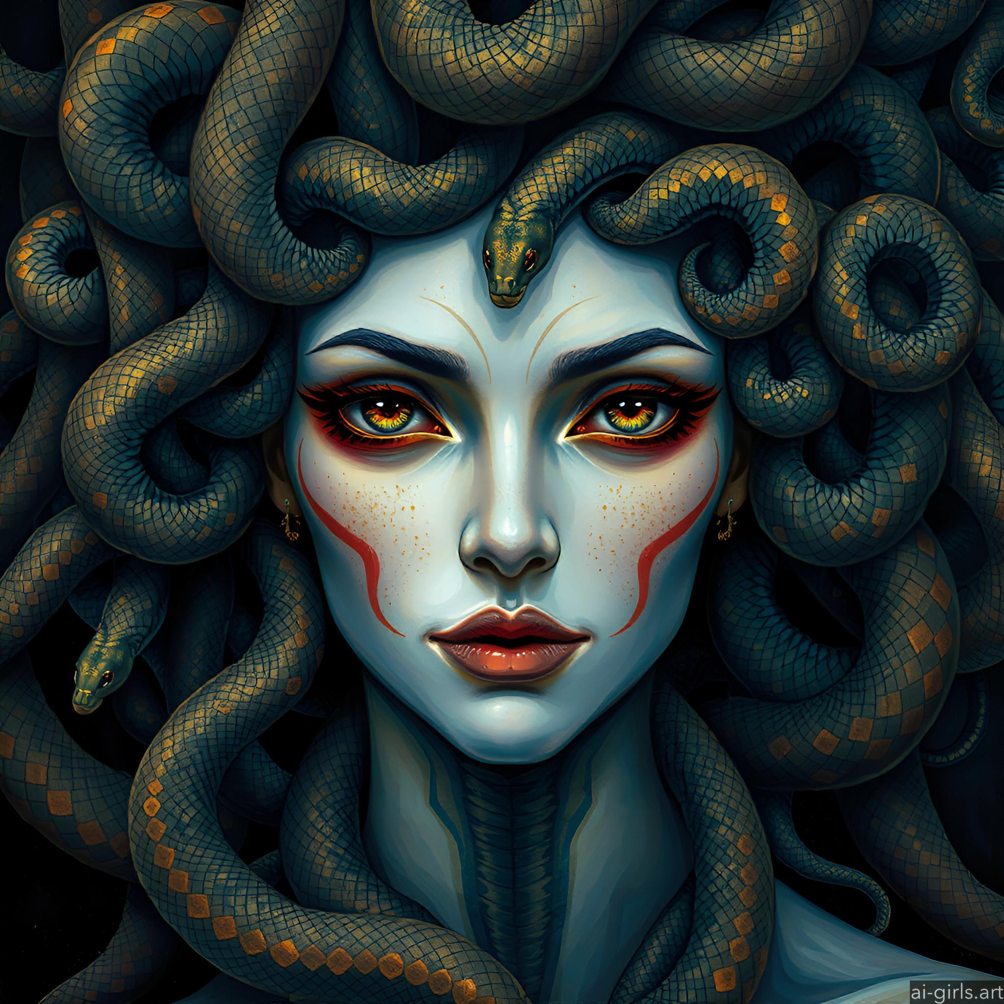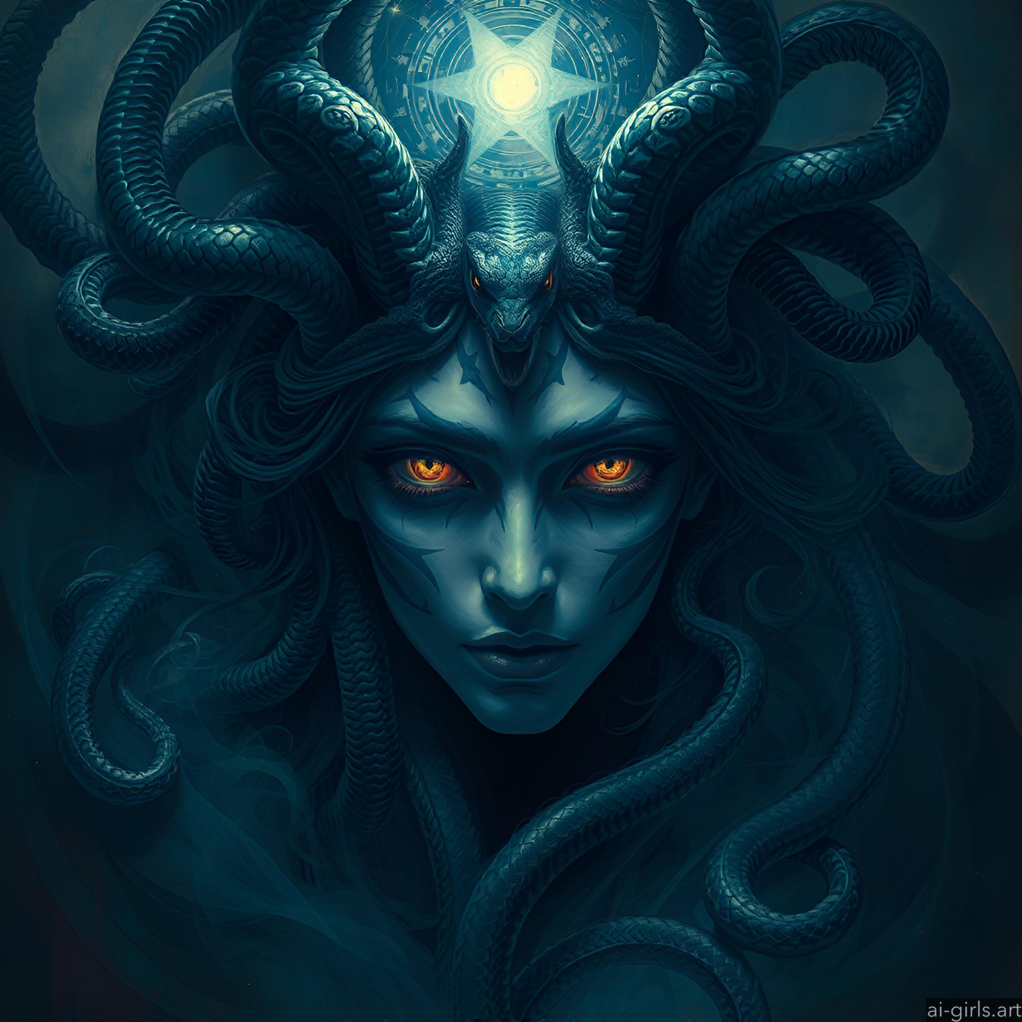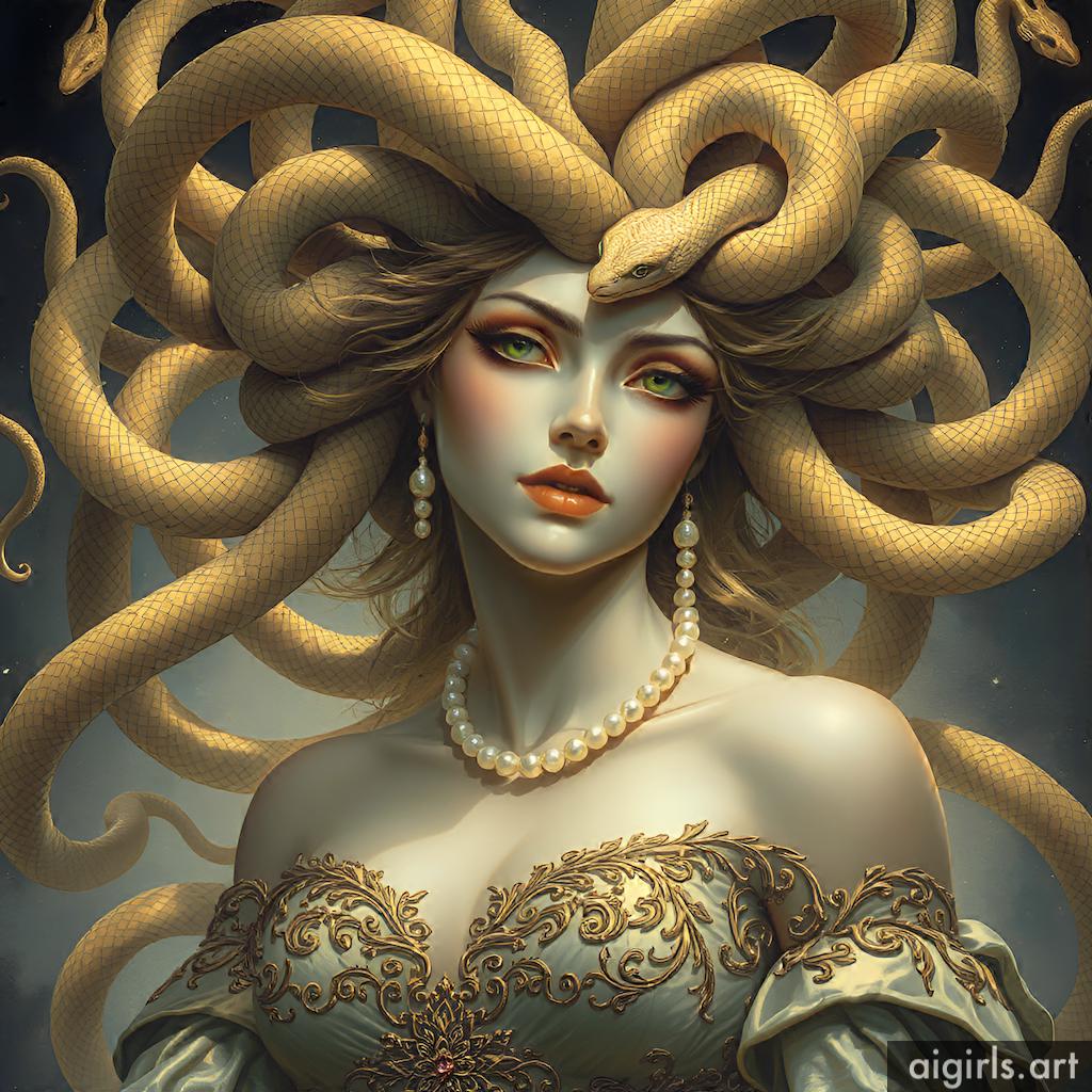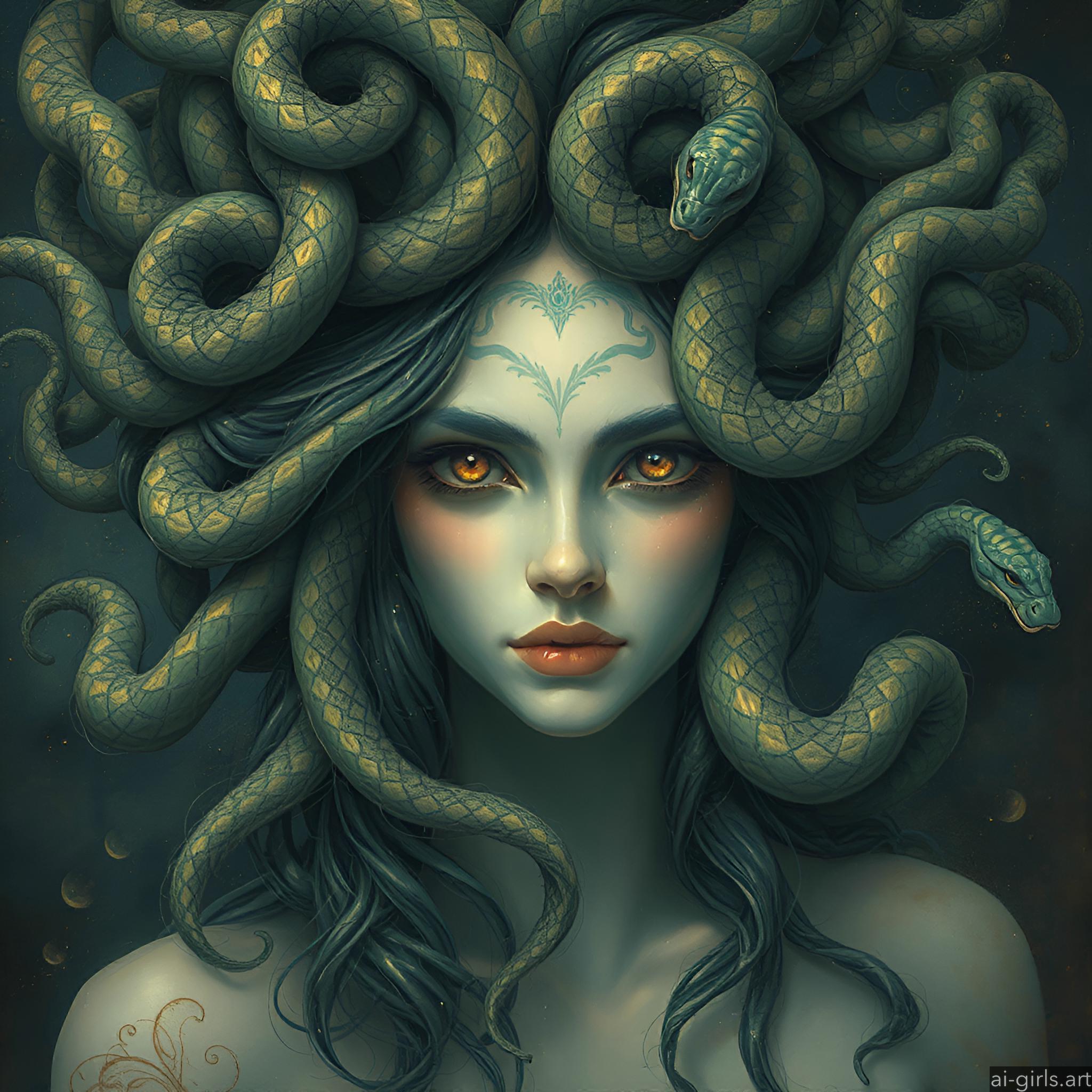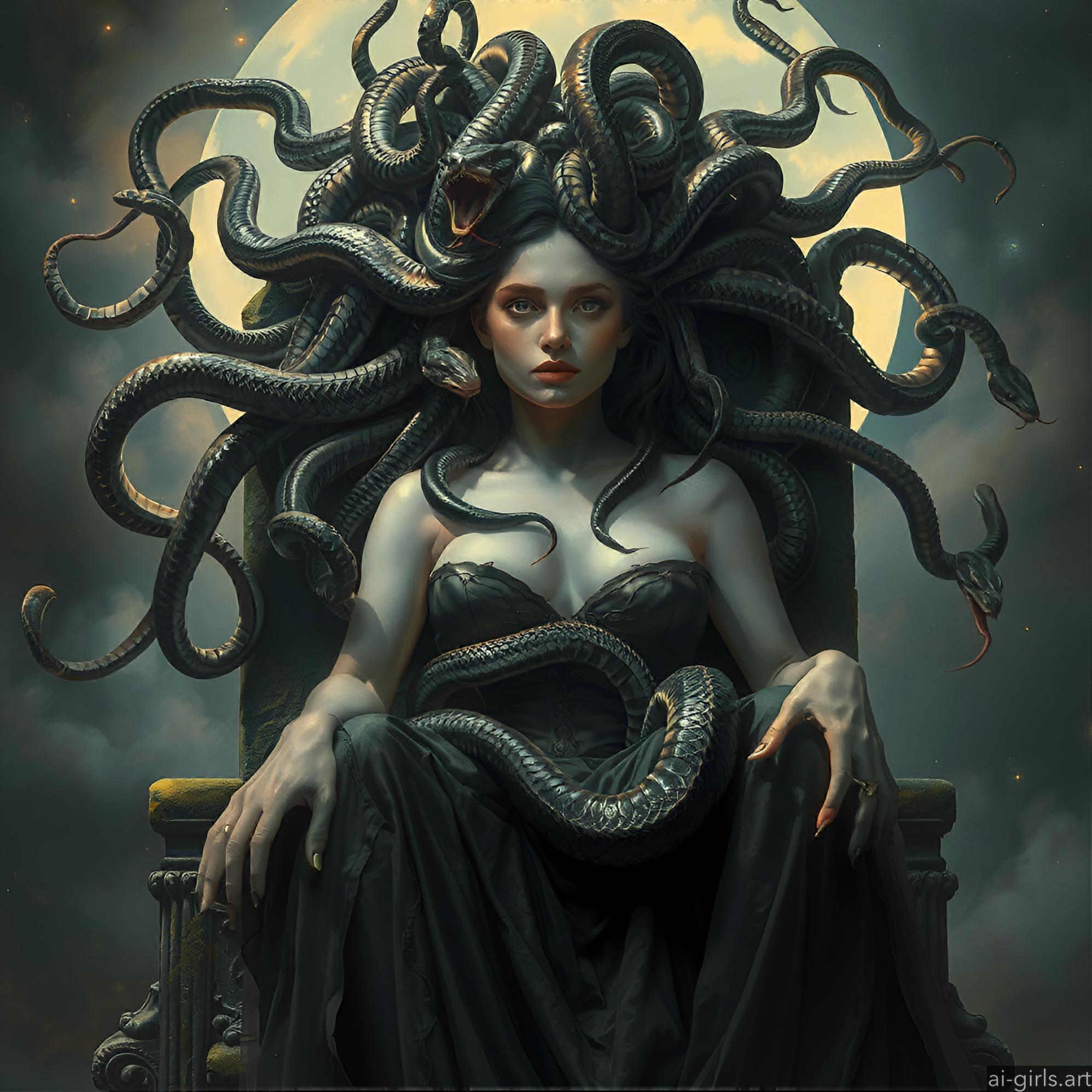 Medusa is a prominent figure in Greek mythology, known as one of the three Gorgons, the daughters of the primordial sea gods Phorcys and Ceto. She is typically depicted as a winged female creature with snakes for hair, and her gaze could turn anyone who looked at her into stone.