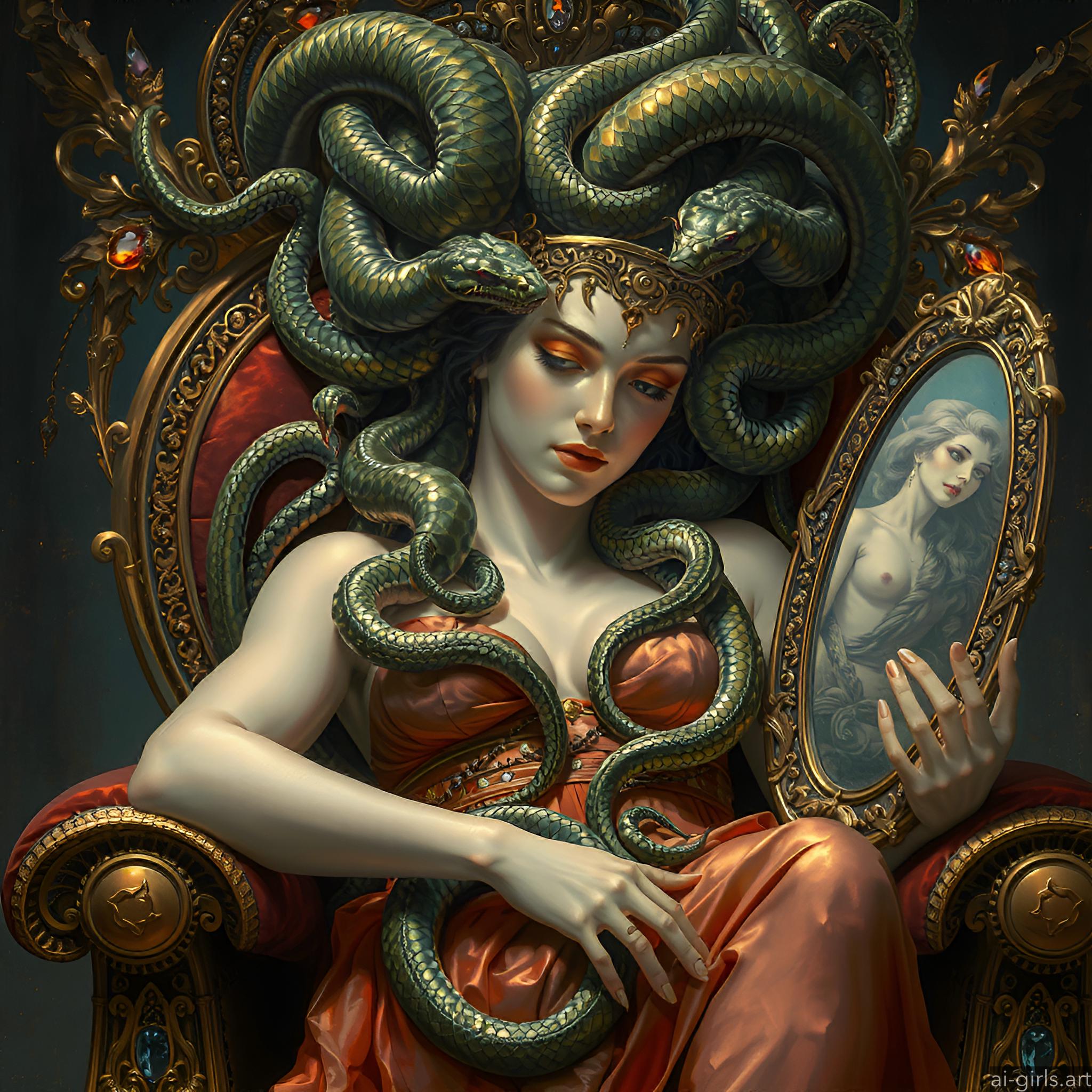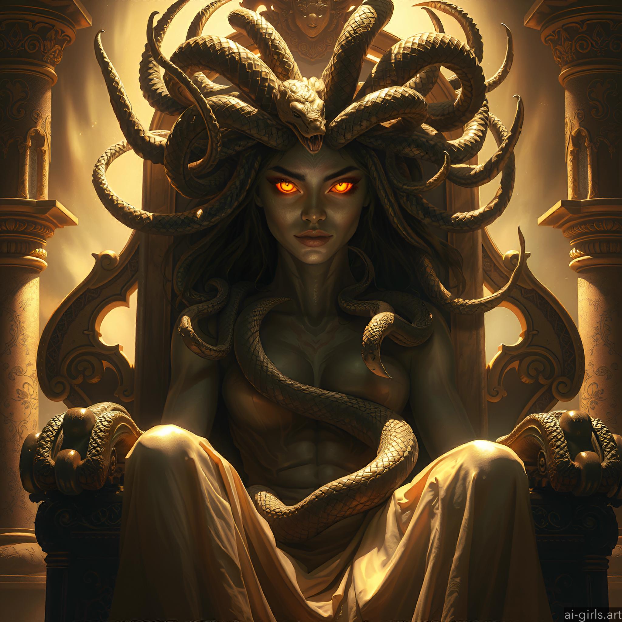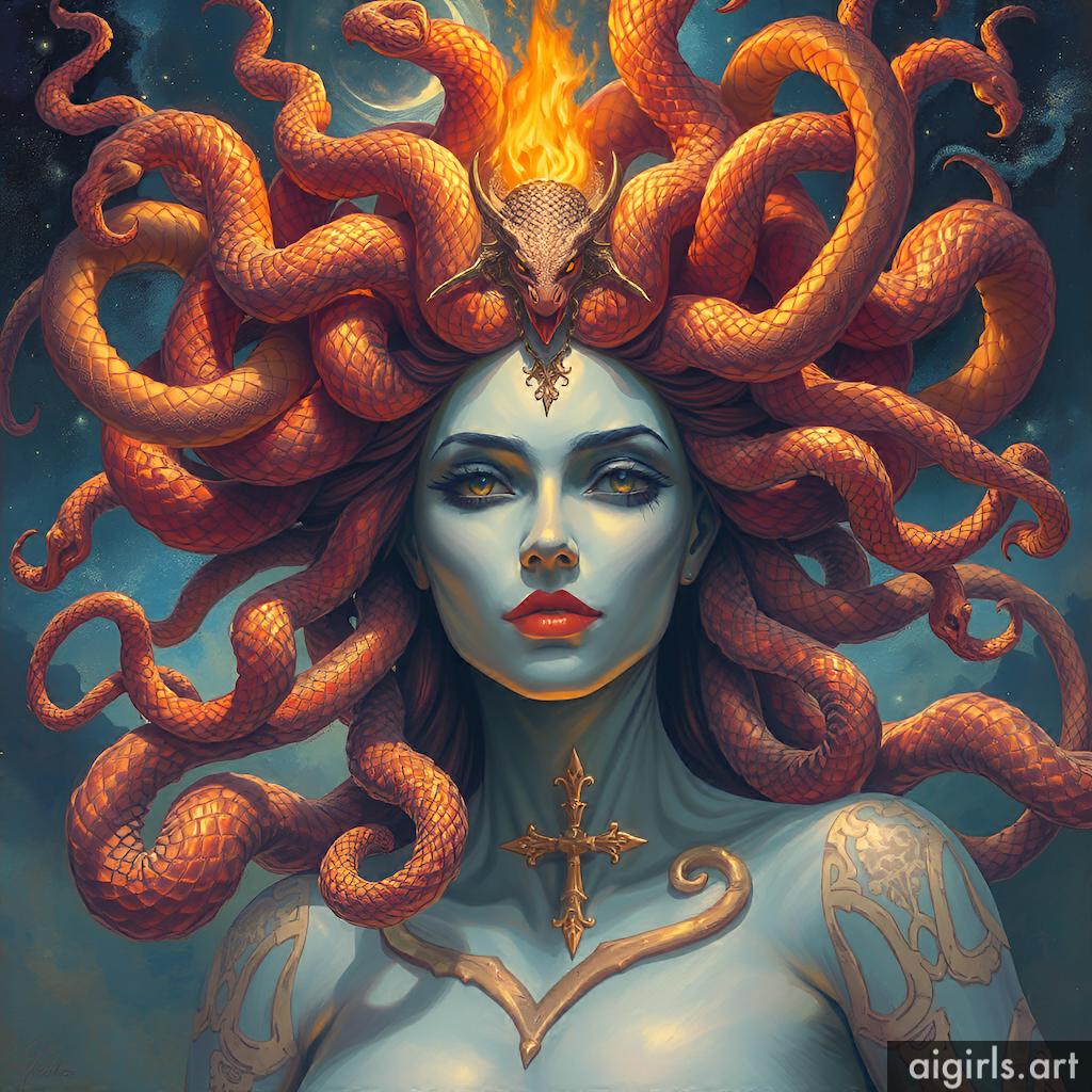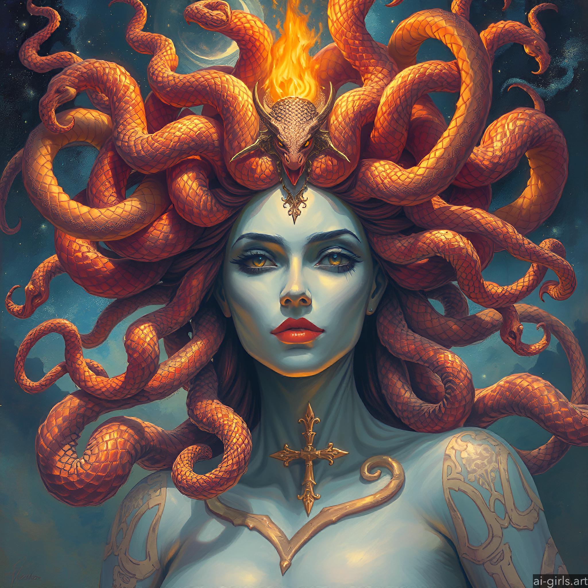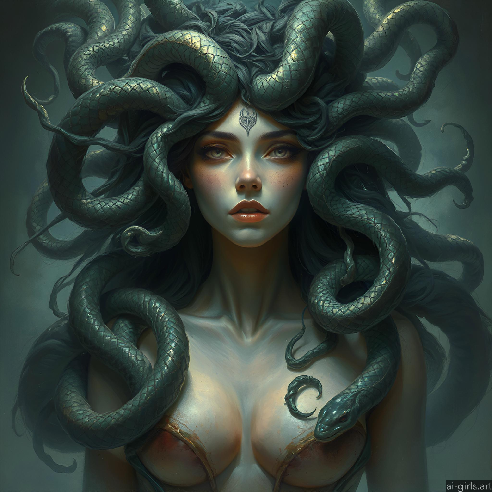 Medusa is a prominent figure in Greek mythology, known as one of the three Gorgons, the daughters of the primordial sea gods Phorcys and Ceto. She is typically depicted as a winged female creature with snakes for hair, and her gaze could turn anyone who looked at her into stone.