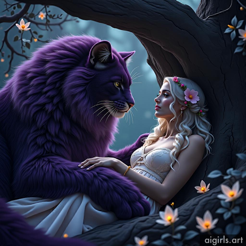 A giant cat hugging a woman.