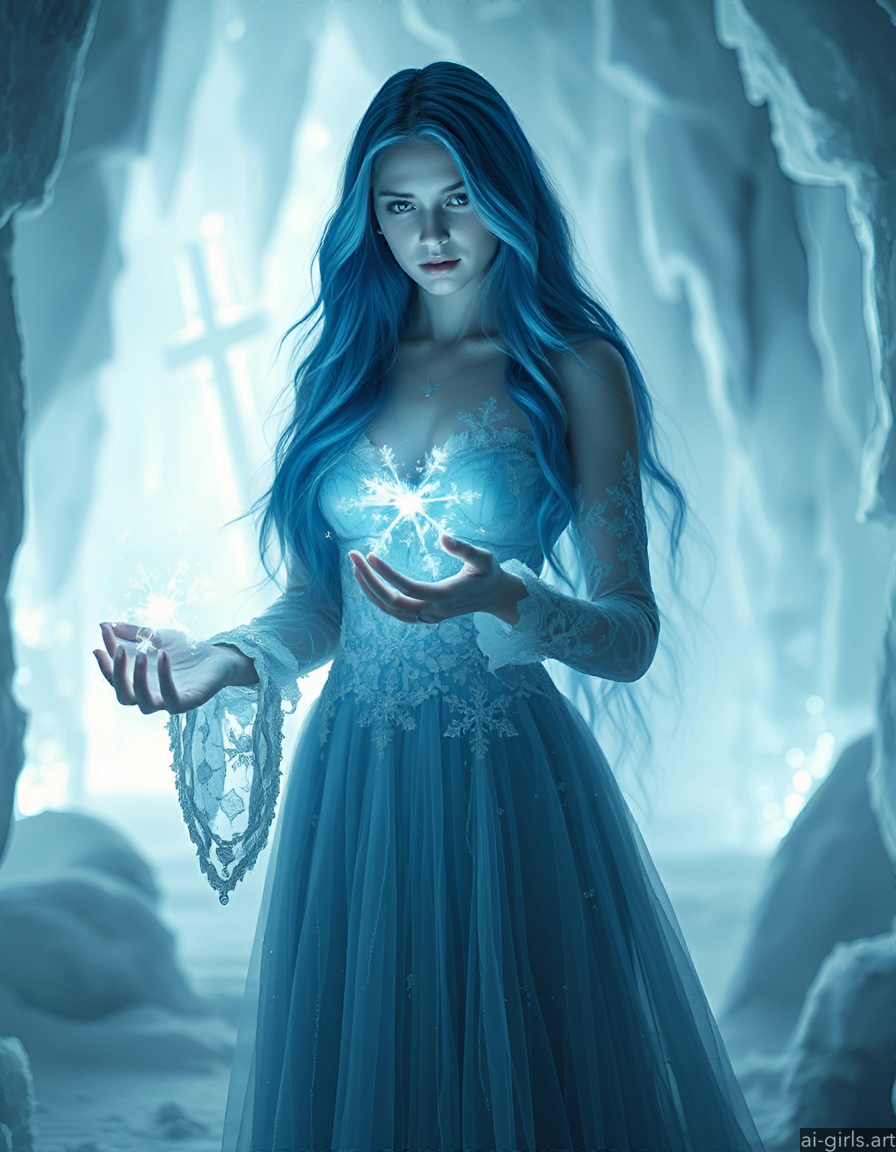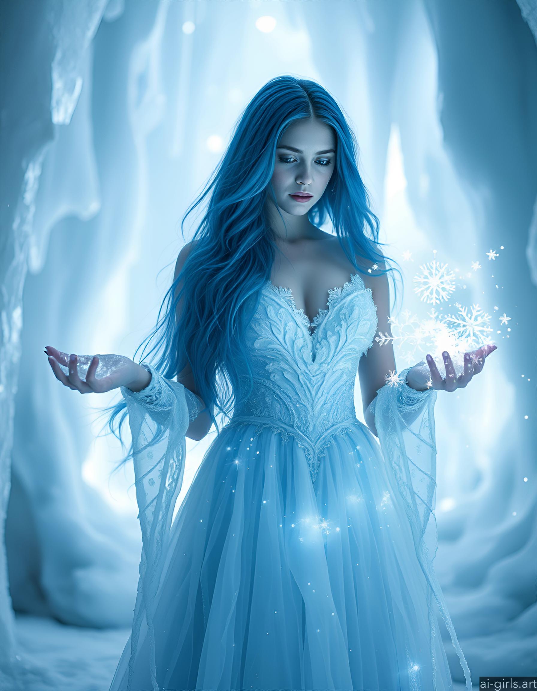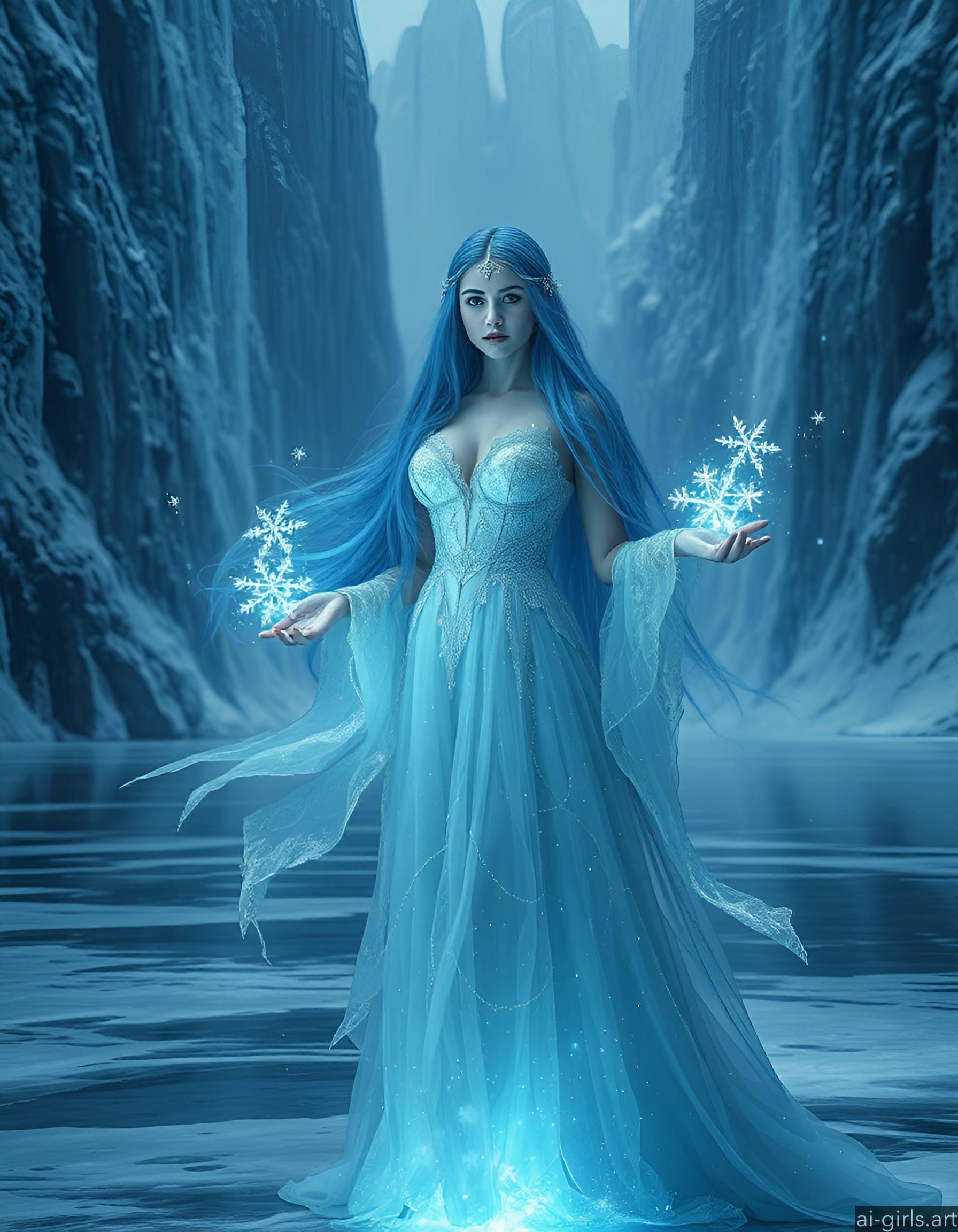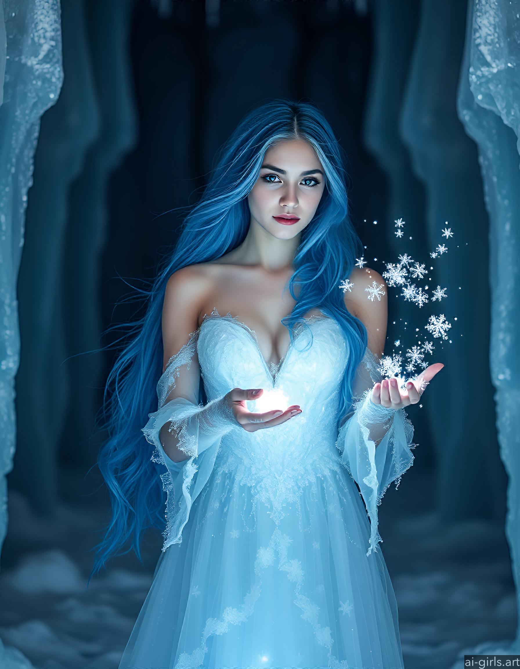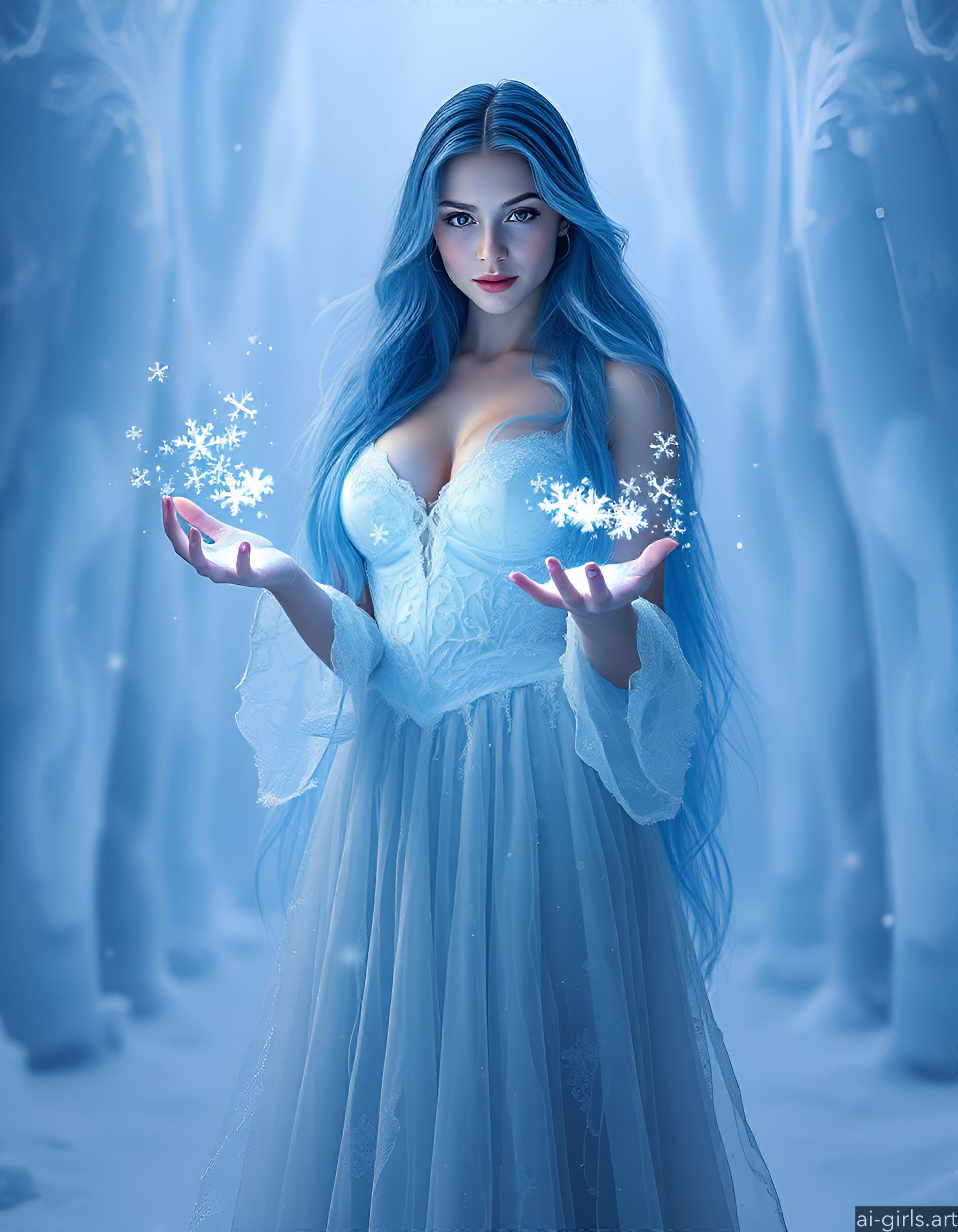 An ethereal seductive young ice sorceress with long flowing blue hair. Her gown is made of delicate frost, and she conjures glowing snowflakes in her hands, casting a cold, blue light across the scene.