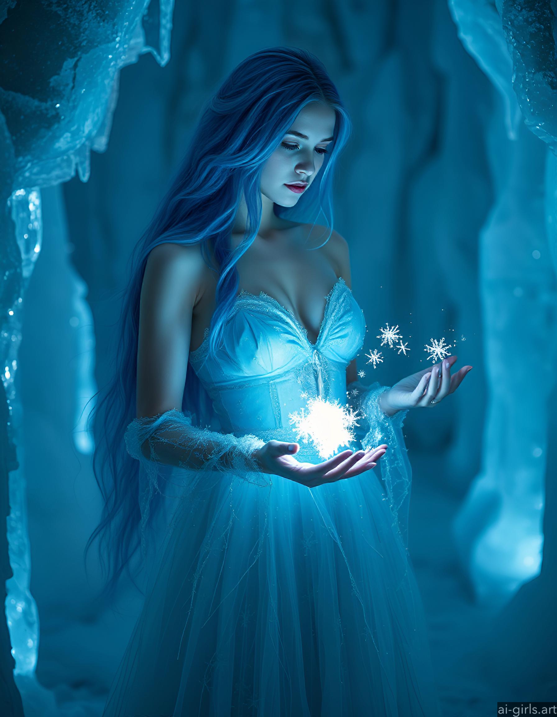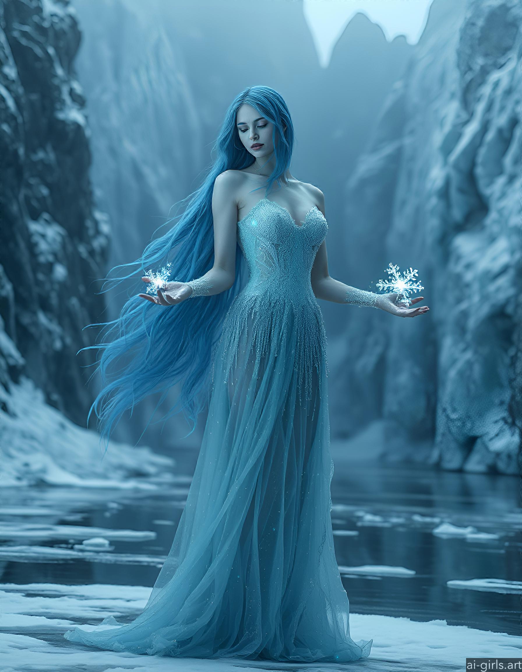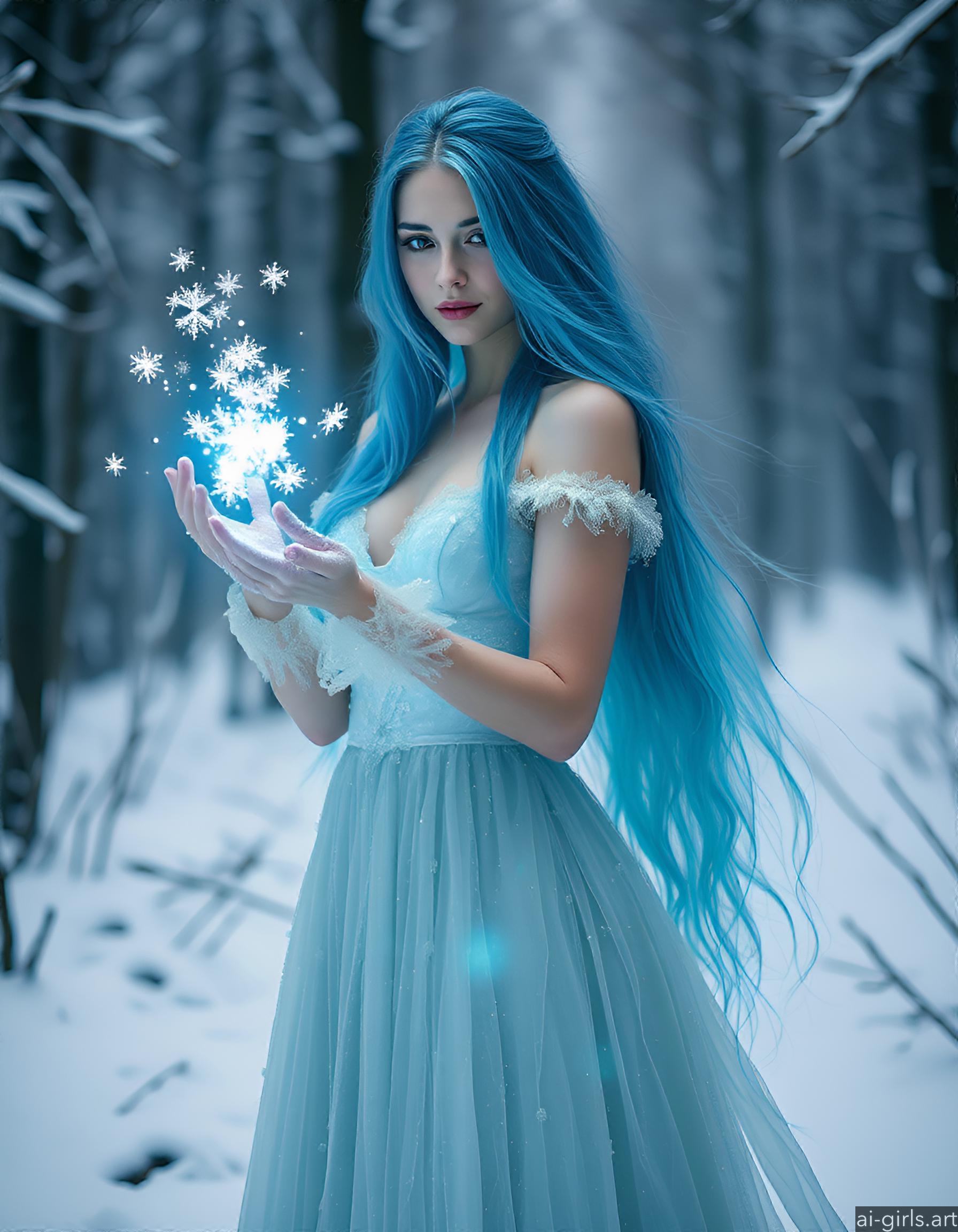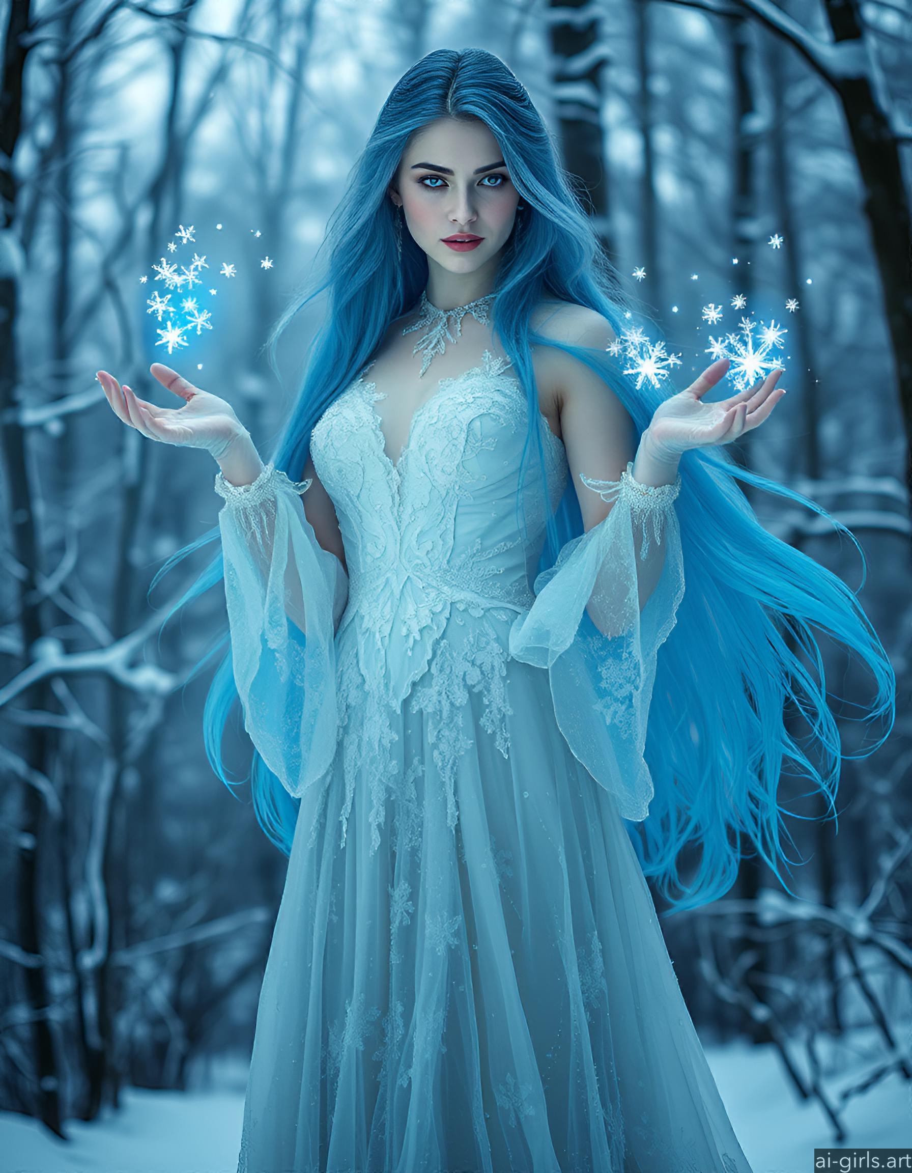 An ethereal seductive young ice sorceress with long flowing blue hair. Her gown is made of delicate frost, and she conjures glowing snowflakes in her hands, casting a cold, blue light across the scene.
