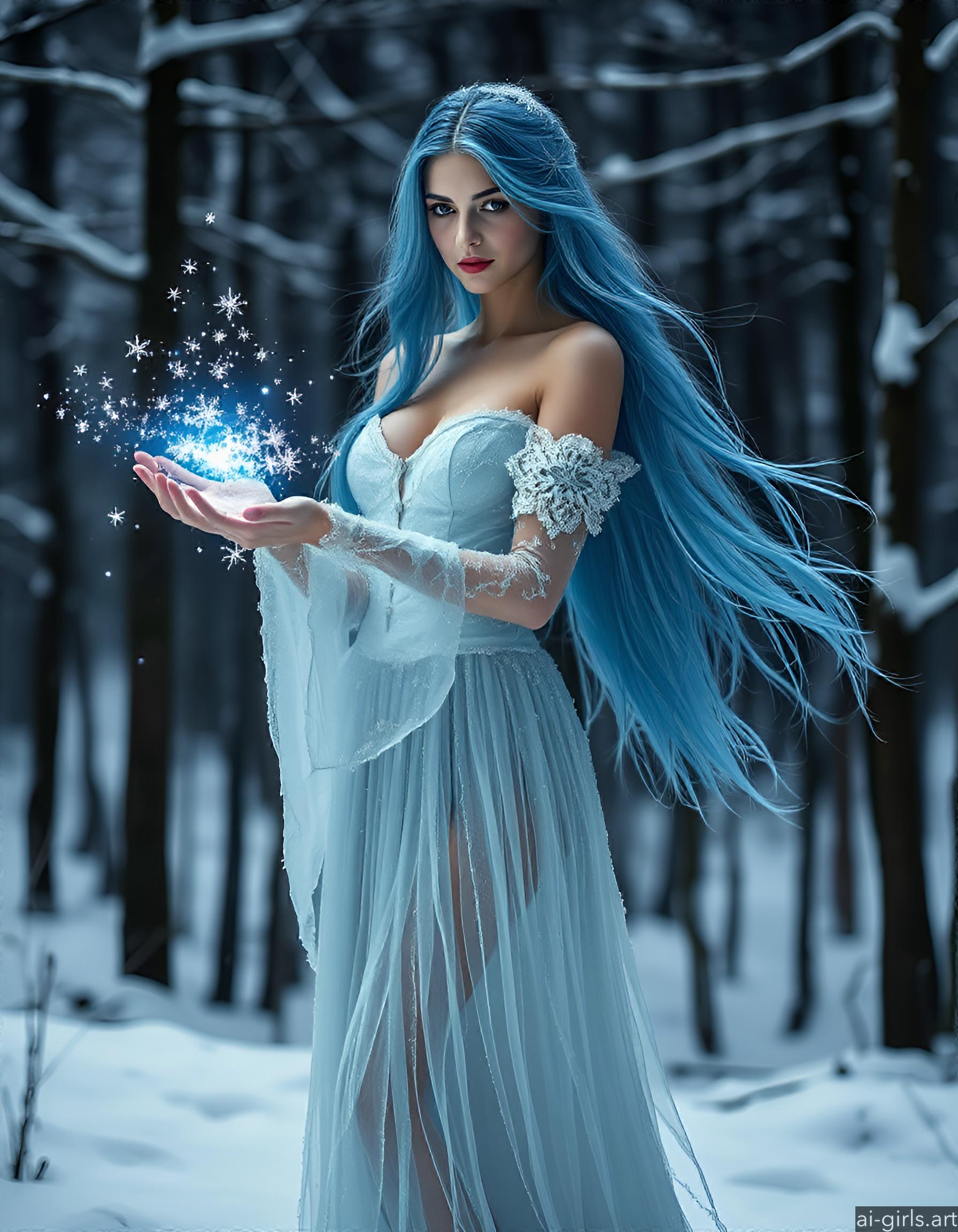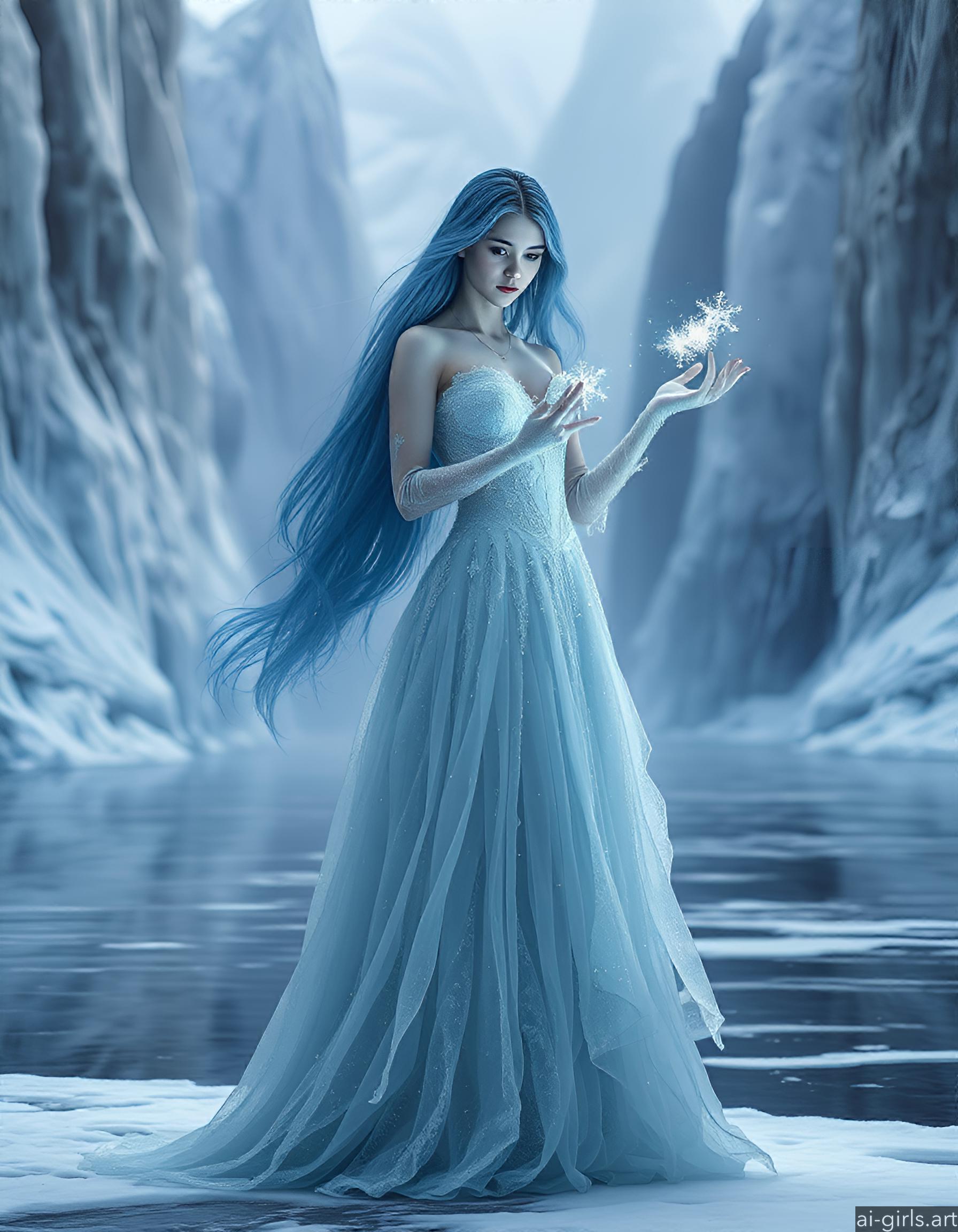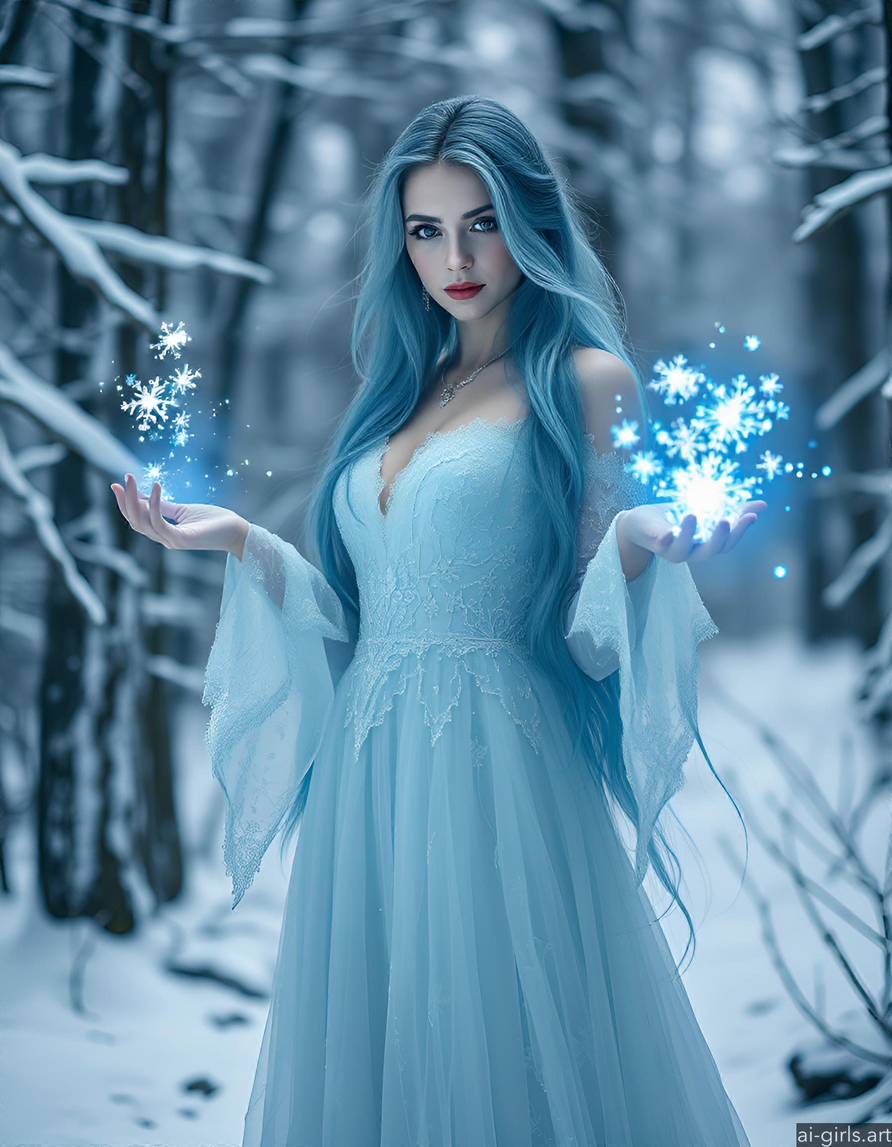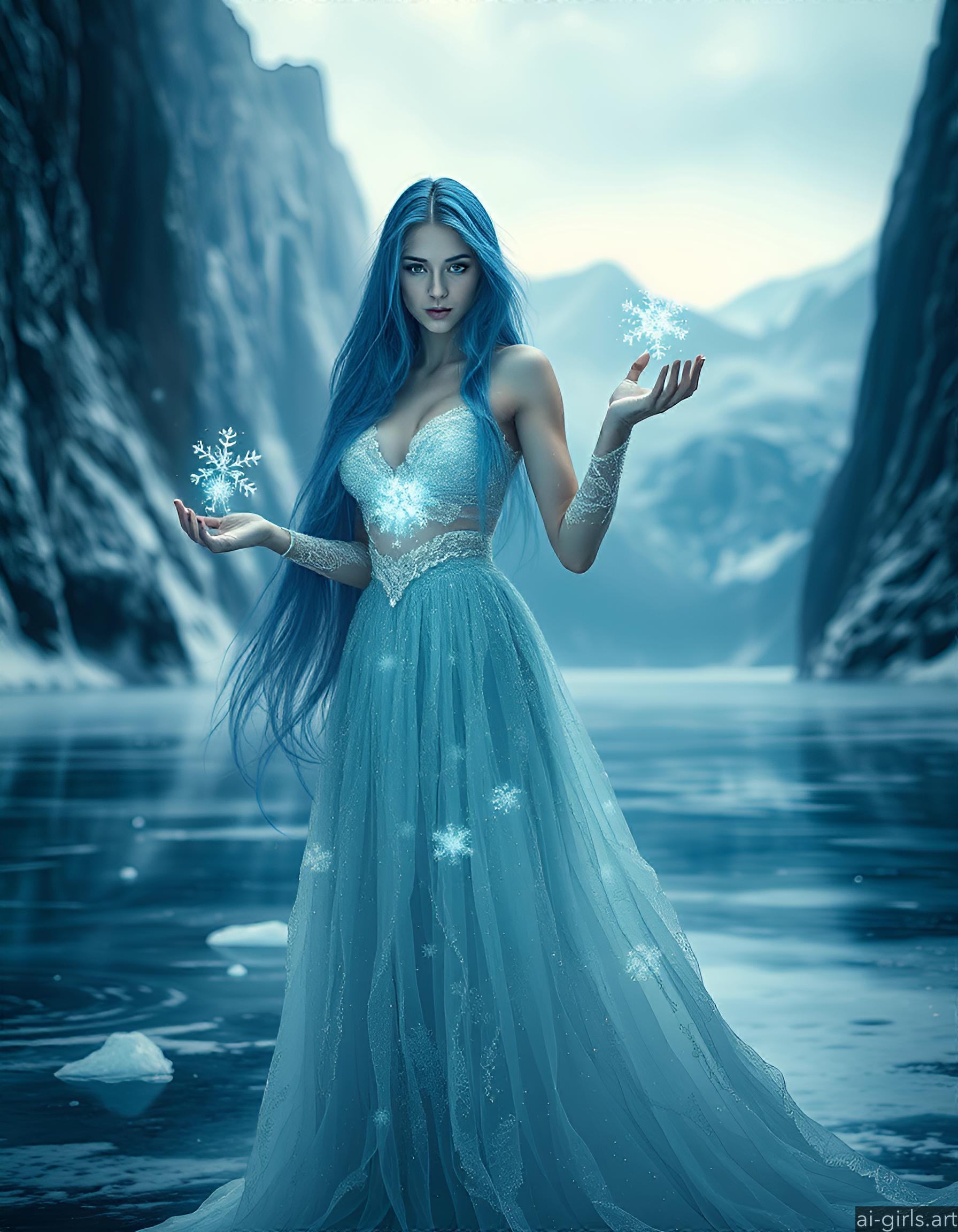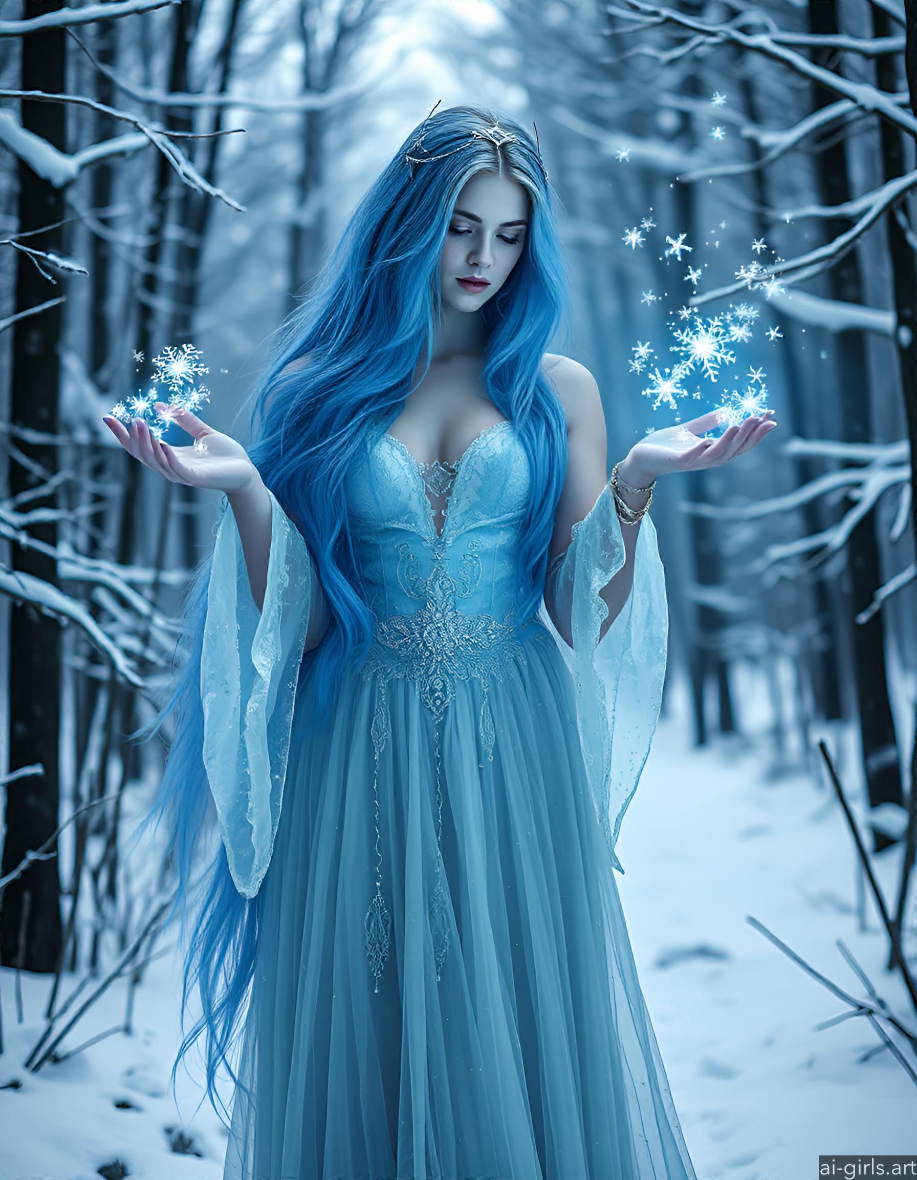 An ethereal seductive young ice sorceress with long flowing blue hair. Her gown is made of delicate frost, and she conjures glowing snowflakes in her hands, casting a cold, blue light across the scene.