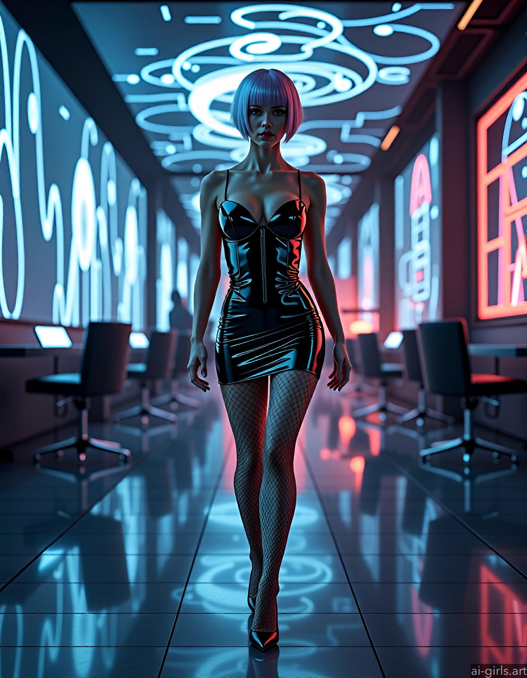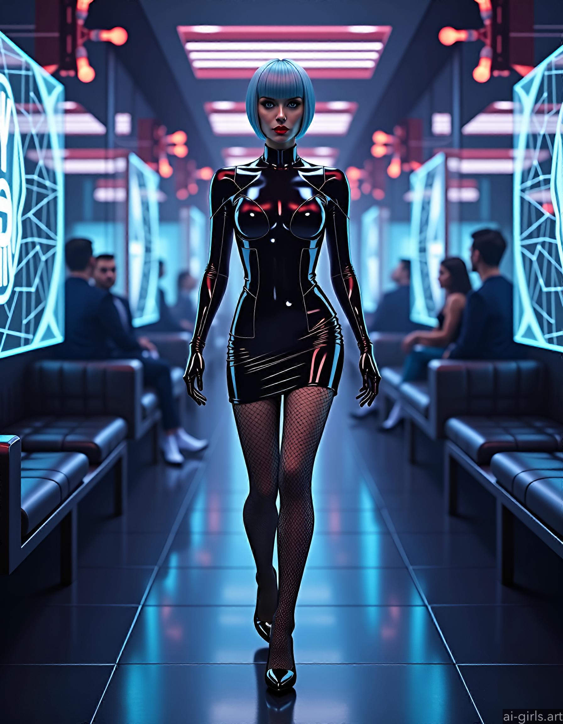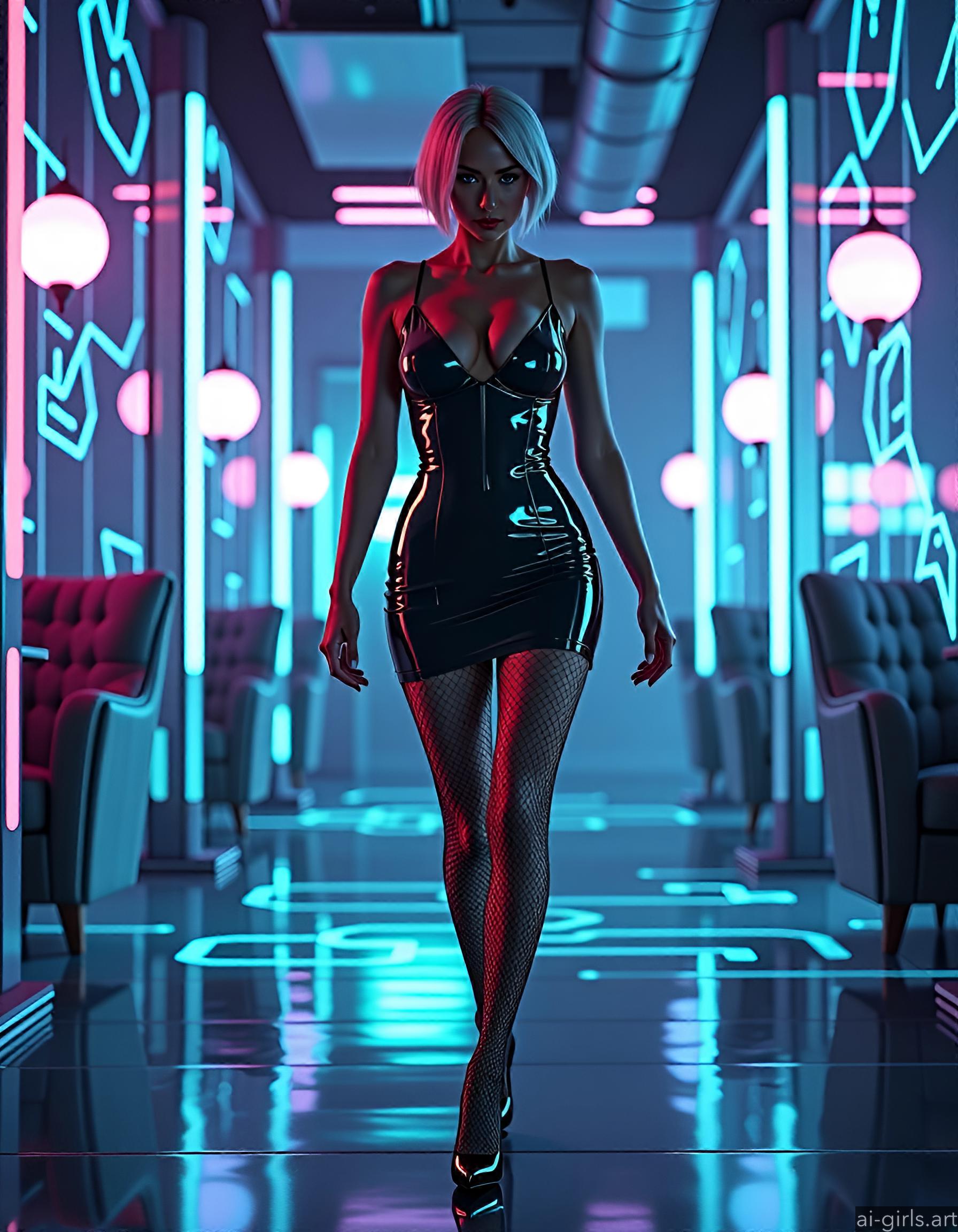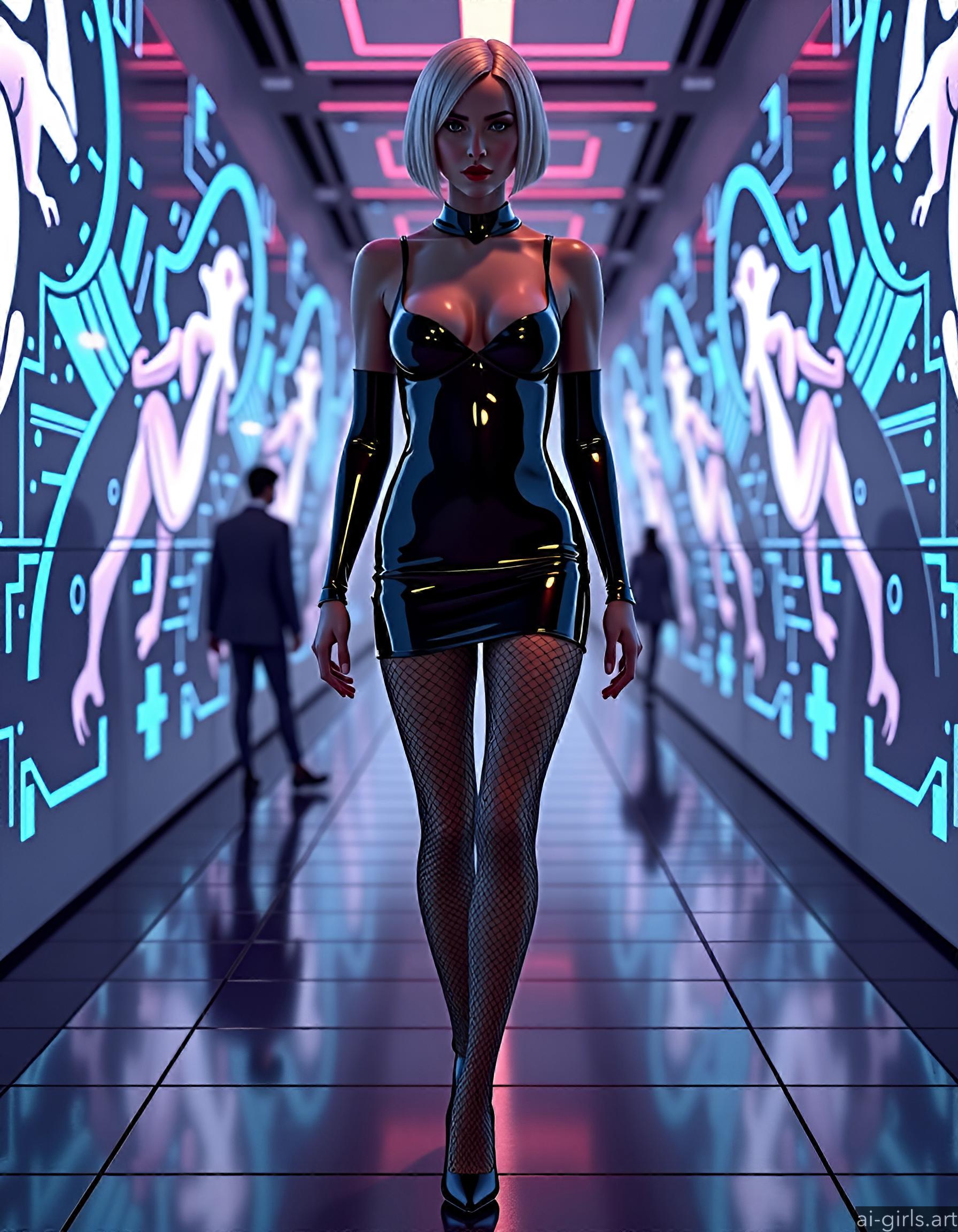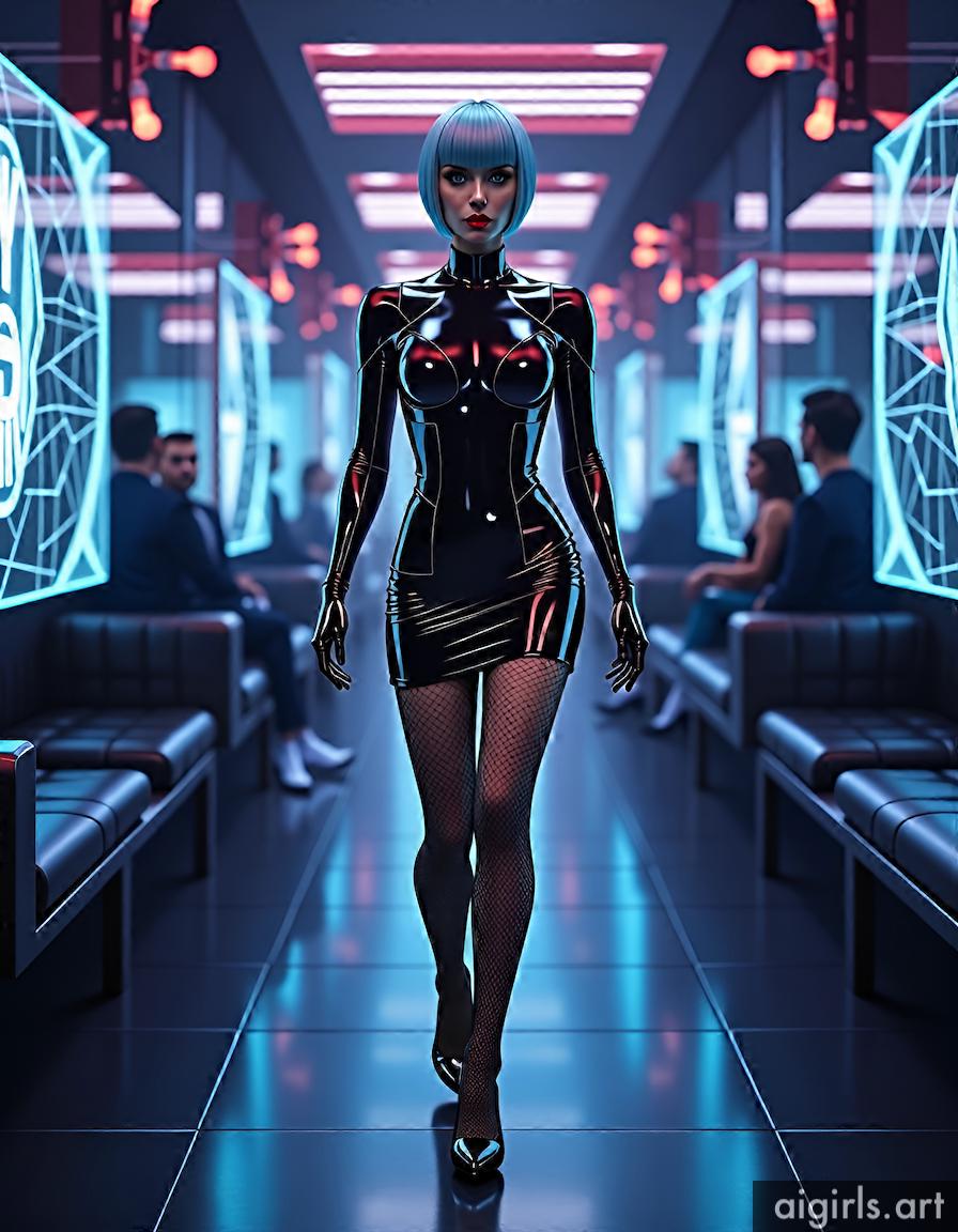 A sexy woman with short hair, dressed up in a bodycon mini shiny latex dress, fishnet tights and high heels, walking in a high-tech lounge filled with holographic projections.