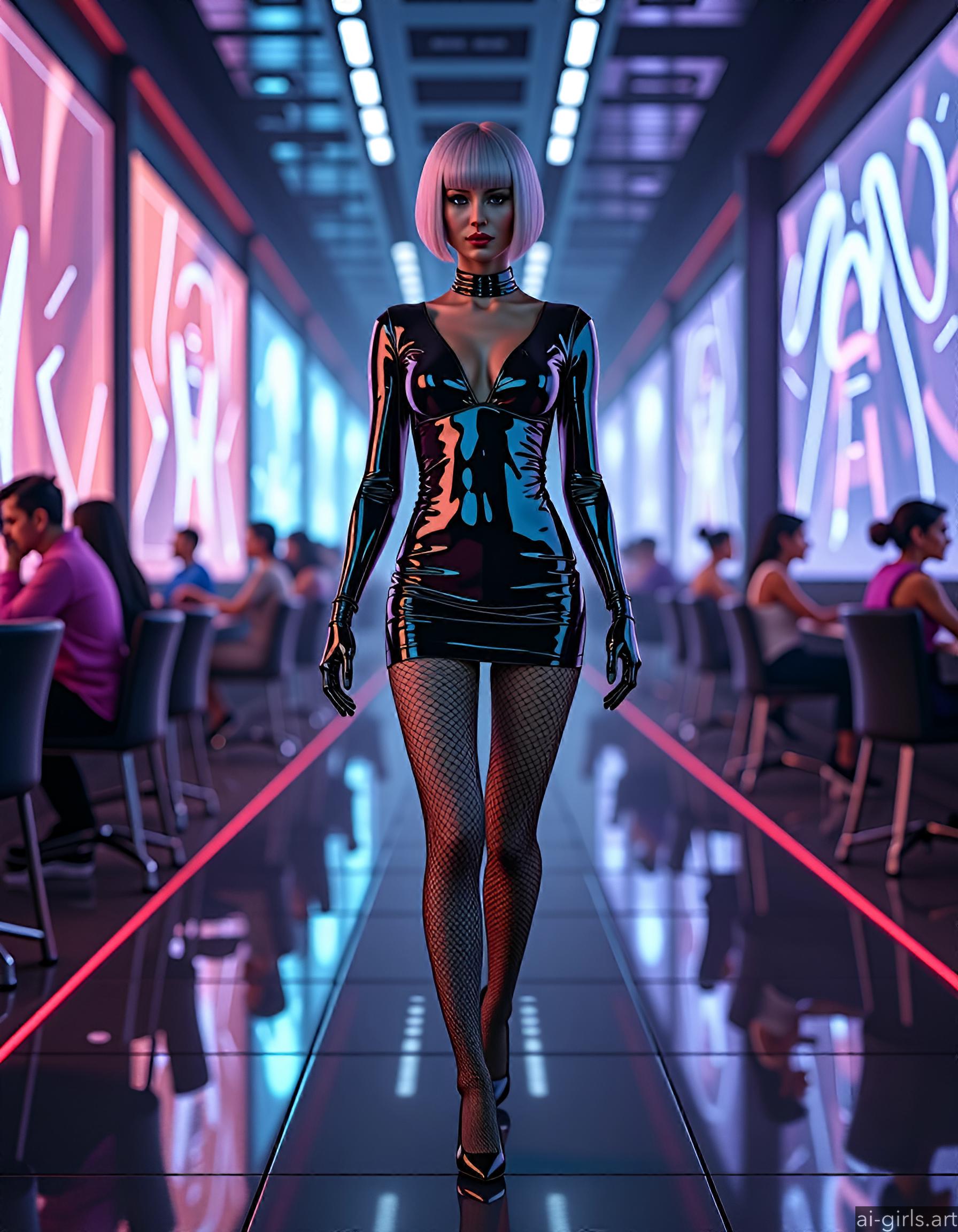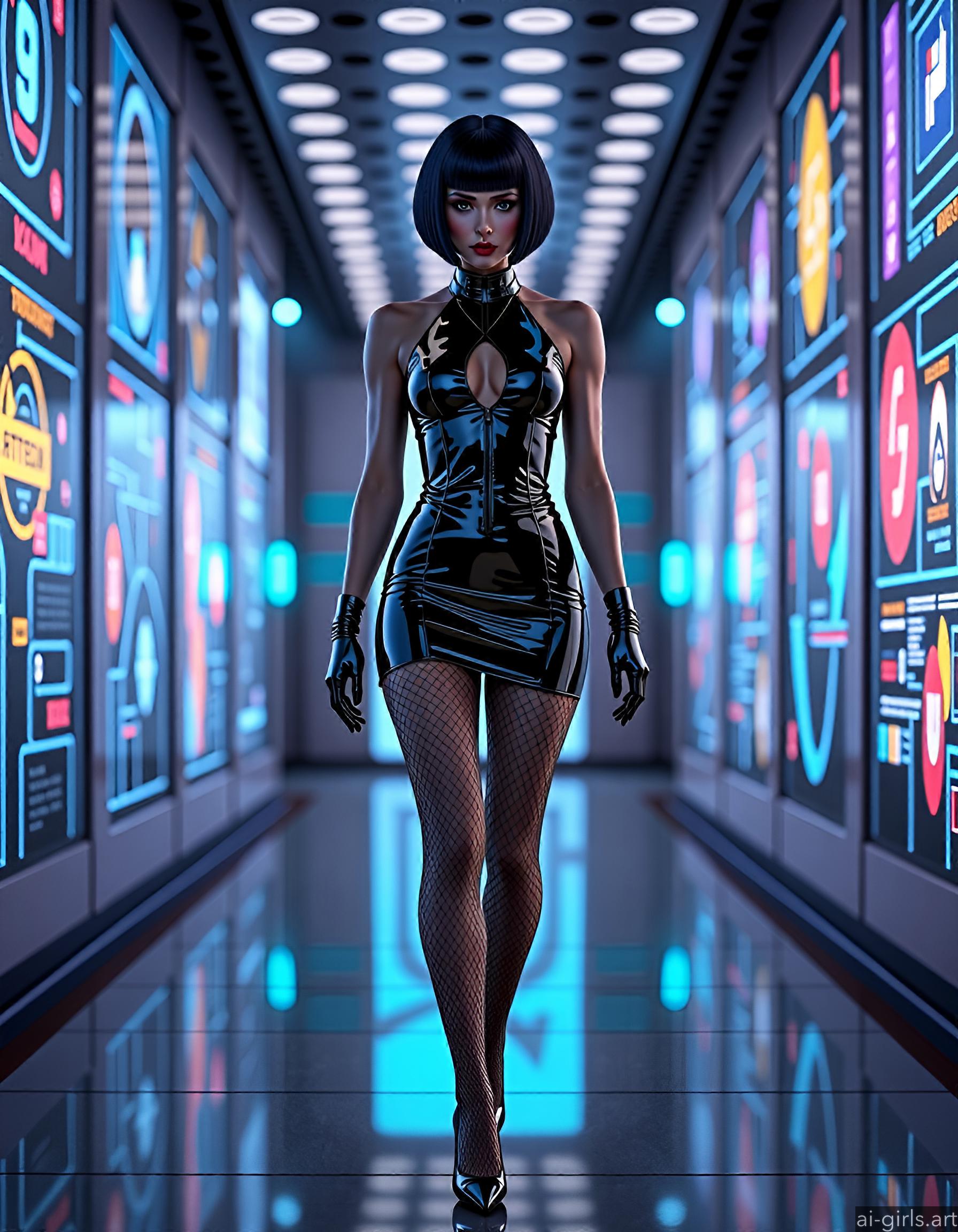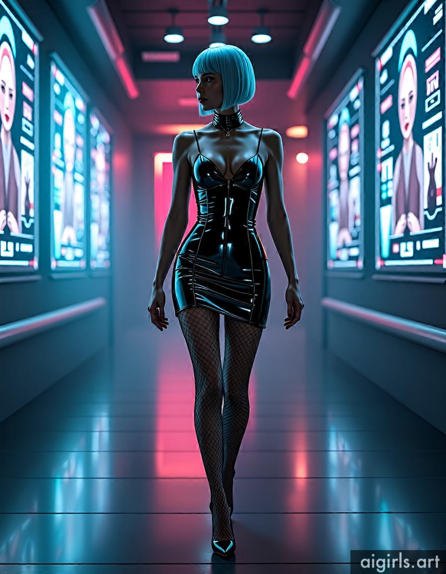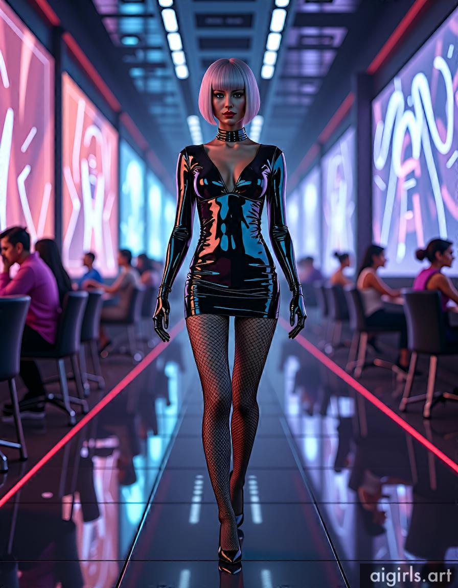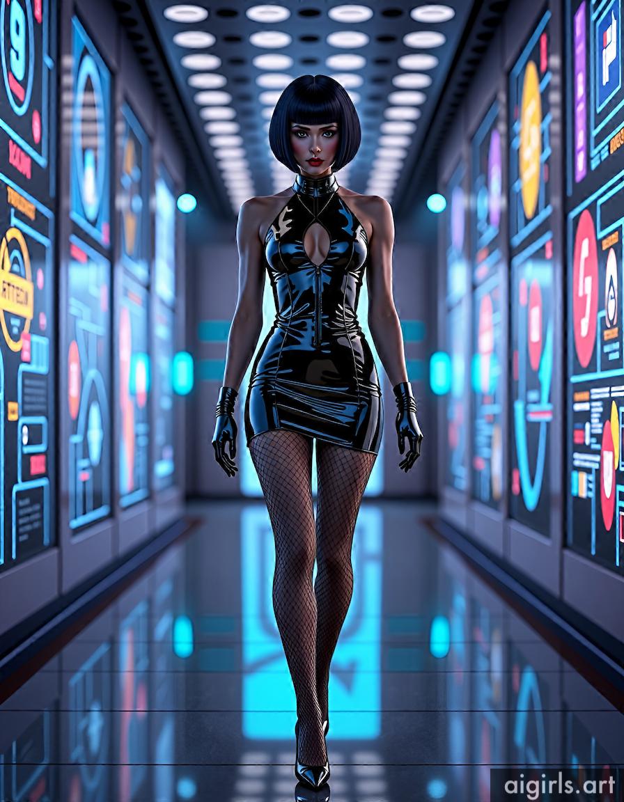 A sexy woman with short hair, dressed up in a bodycon mini shiny latex dress, fishnet tights and high heels, walking in a high-tech lounge filled with holographic projections.