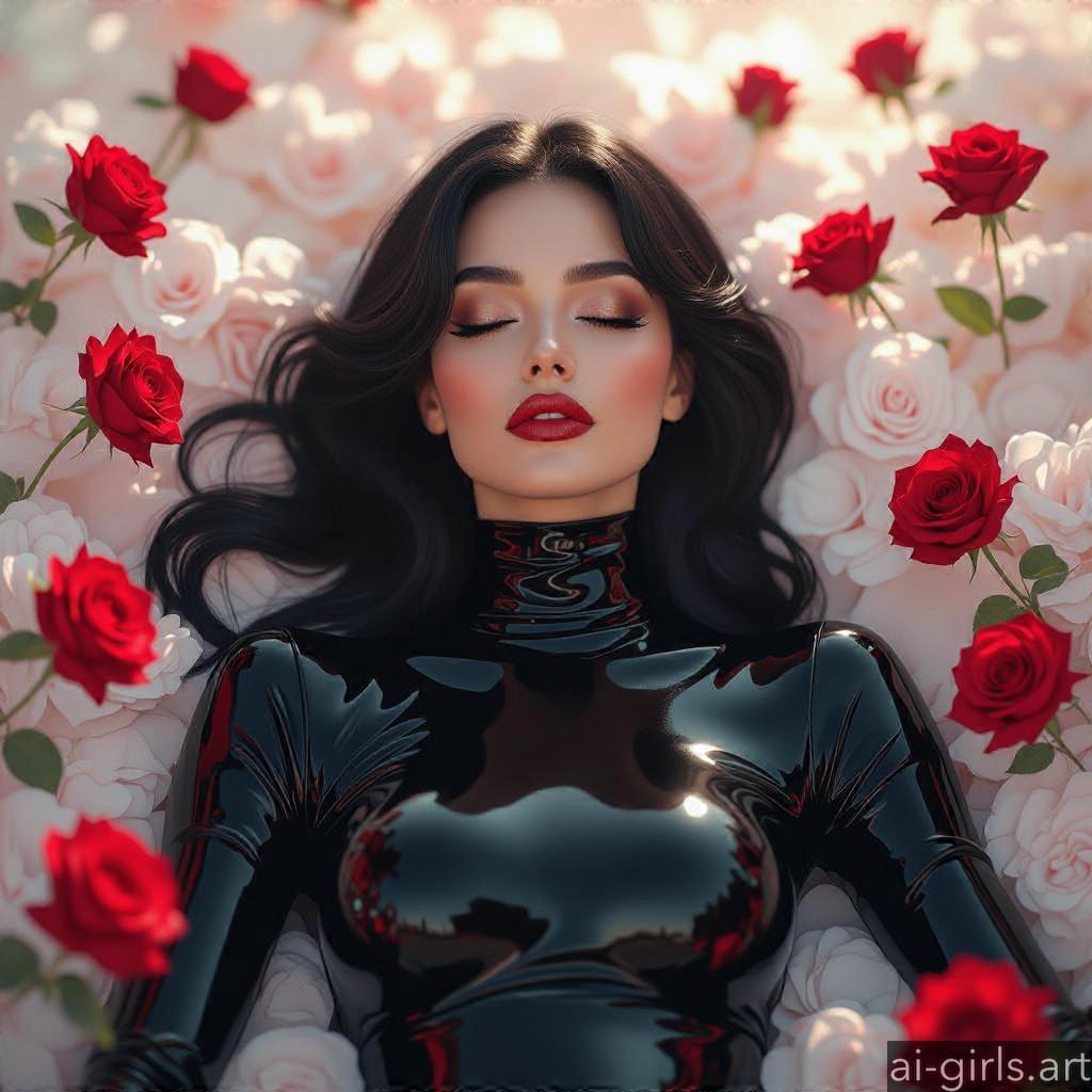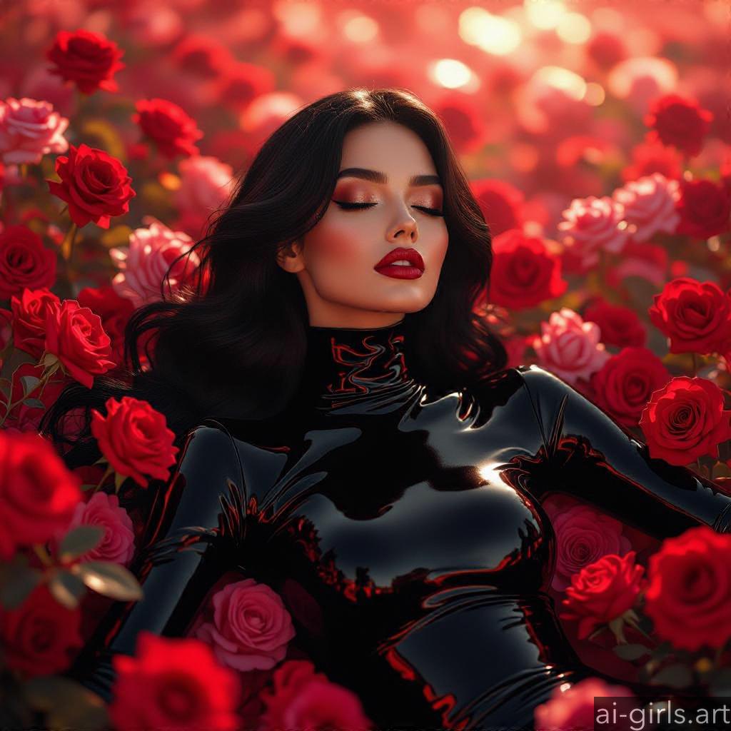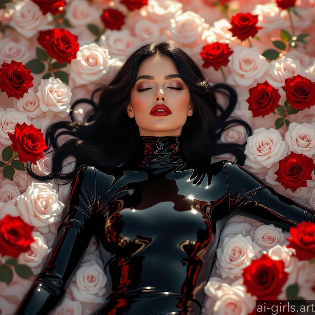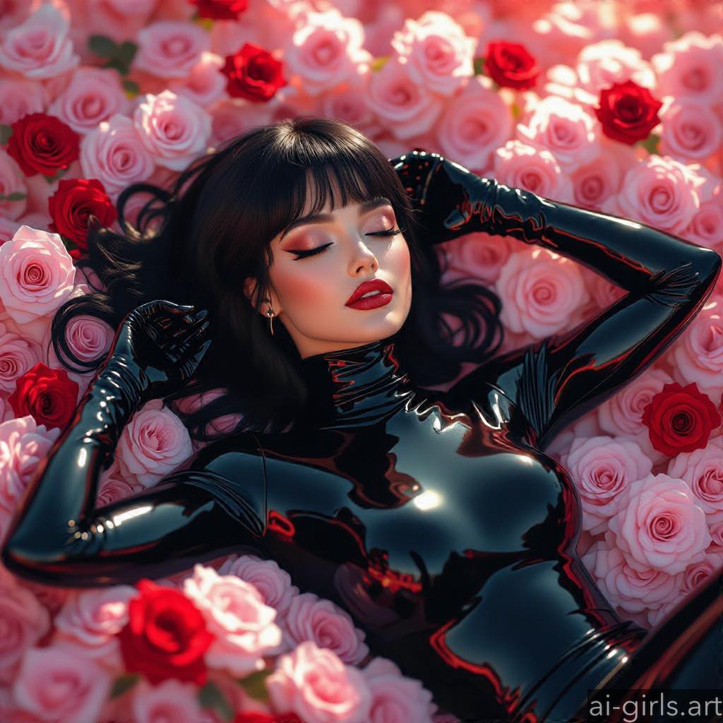 Beautiful AI girls in latex catsuit lying on roses