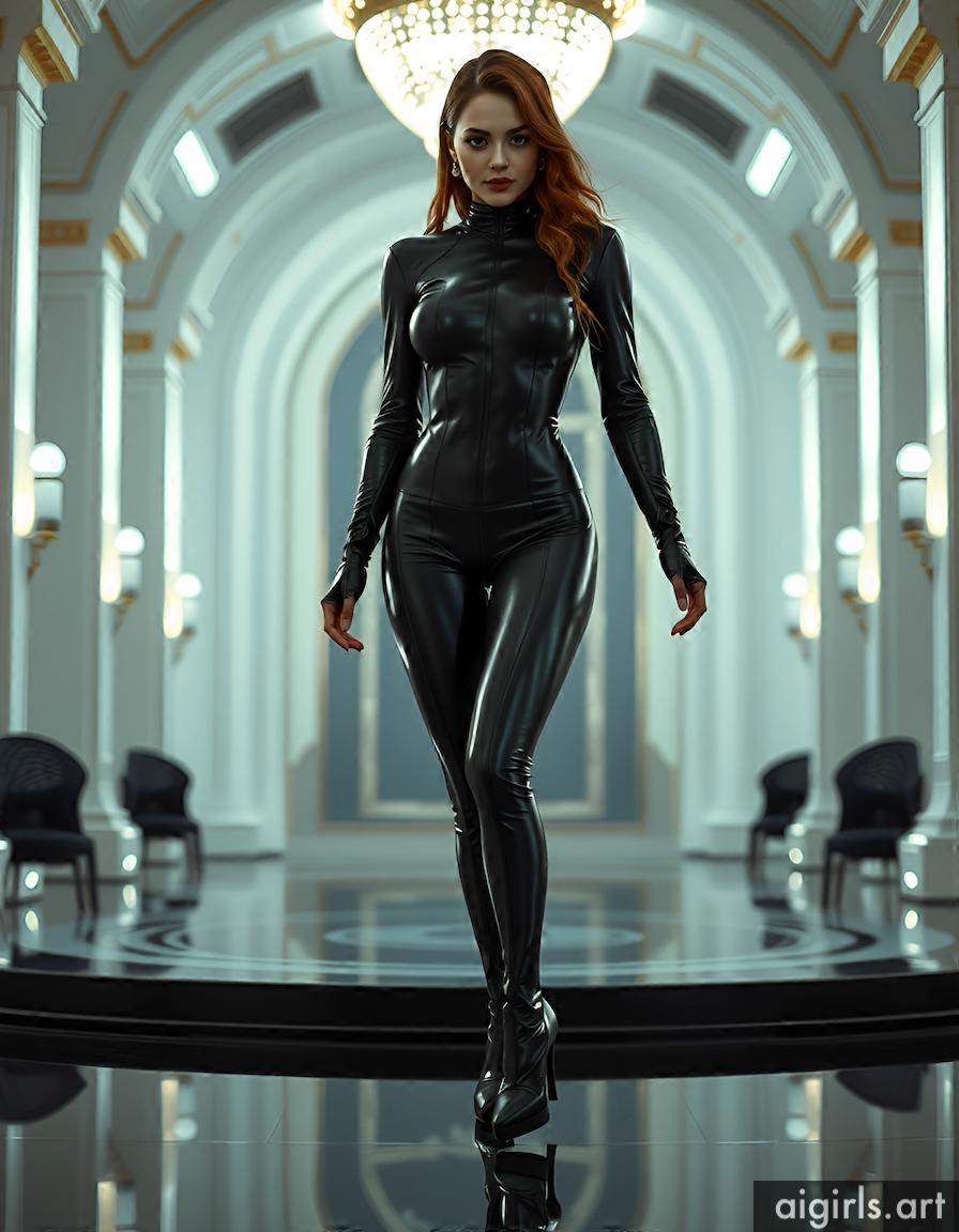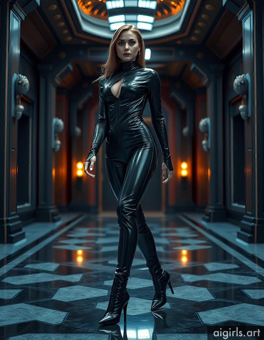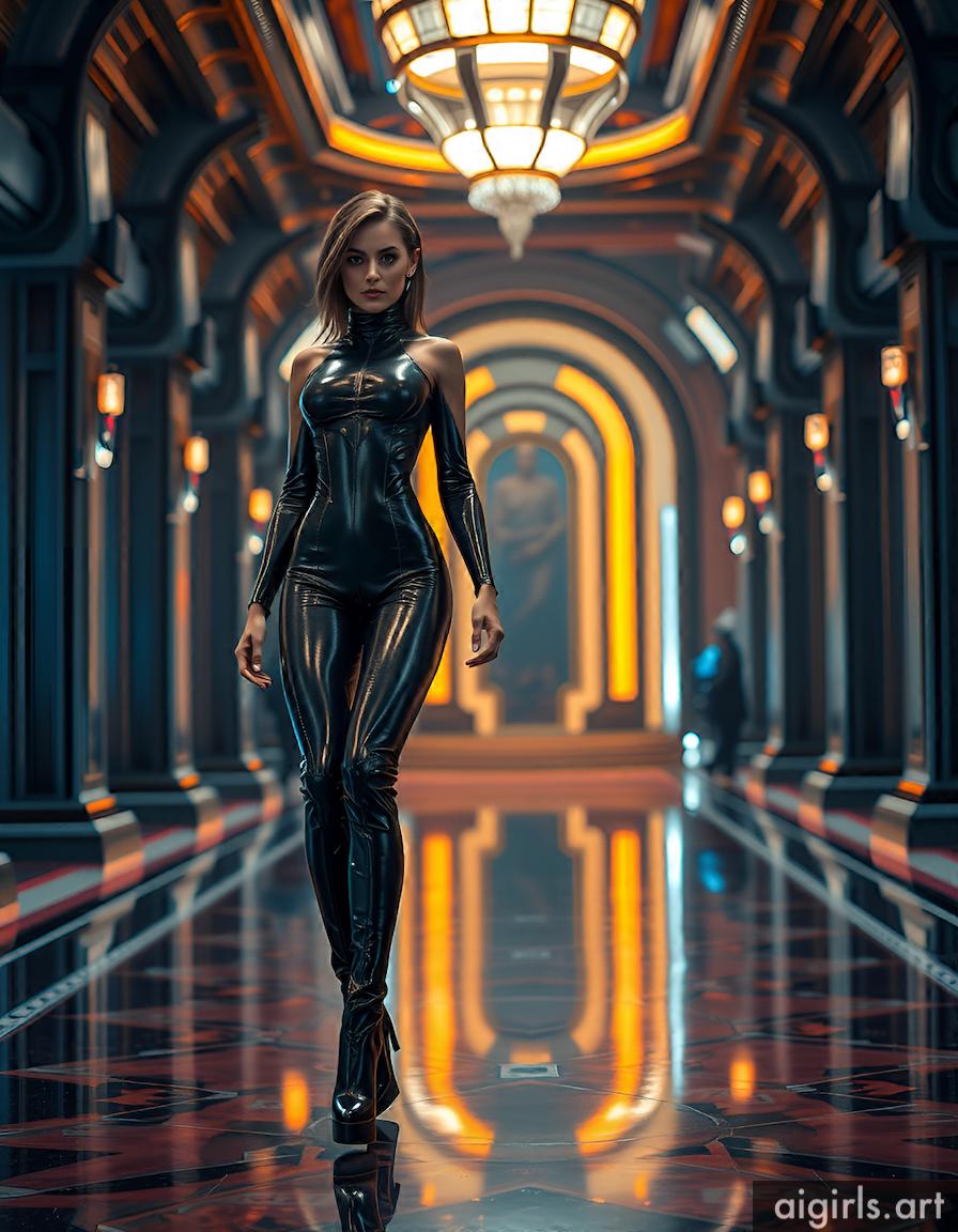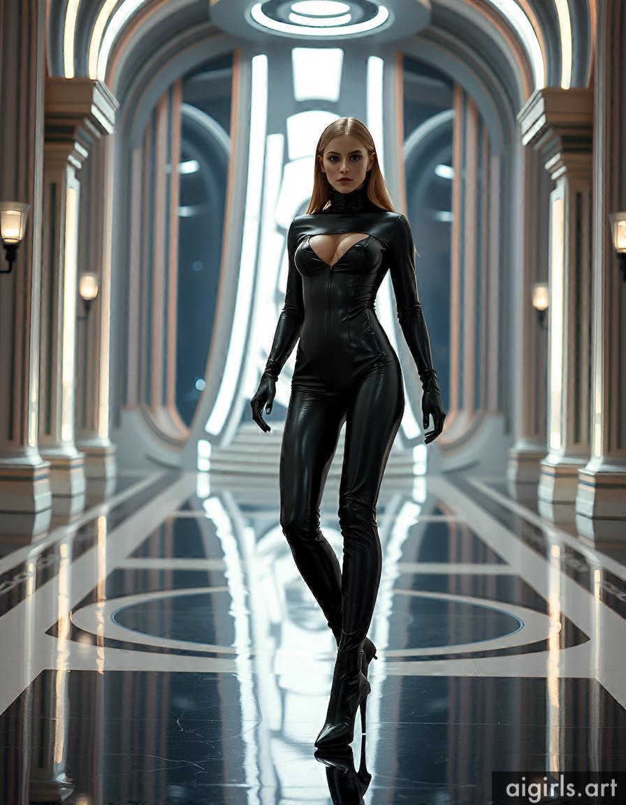 A sexy young woman wearing a black leather catsuit and high heels, walking in a futuristic palace room.