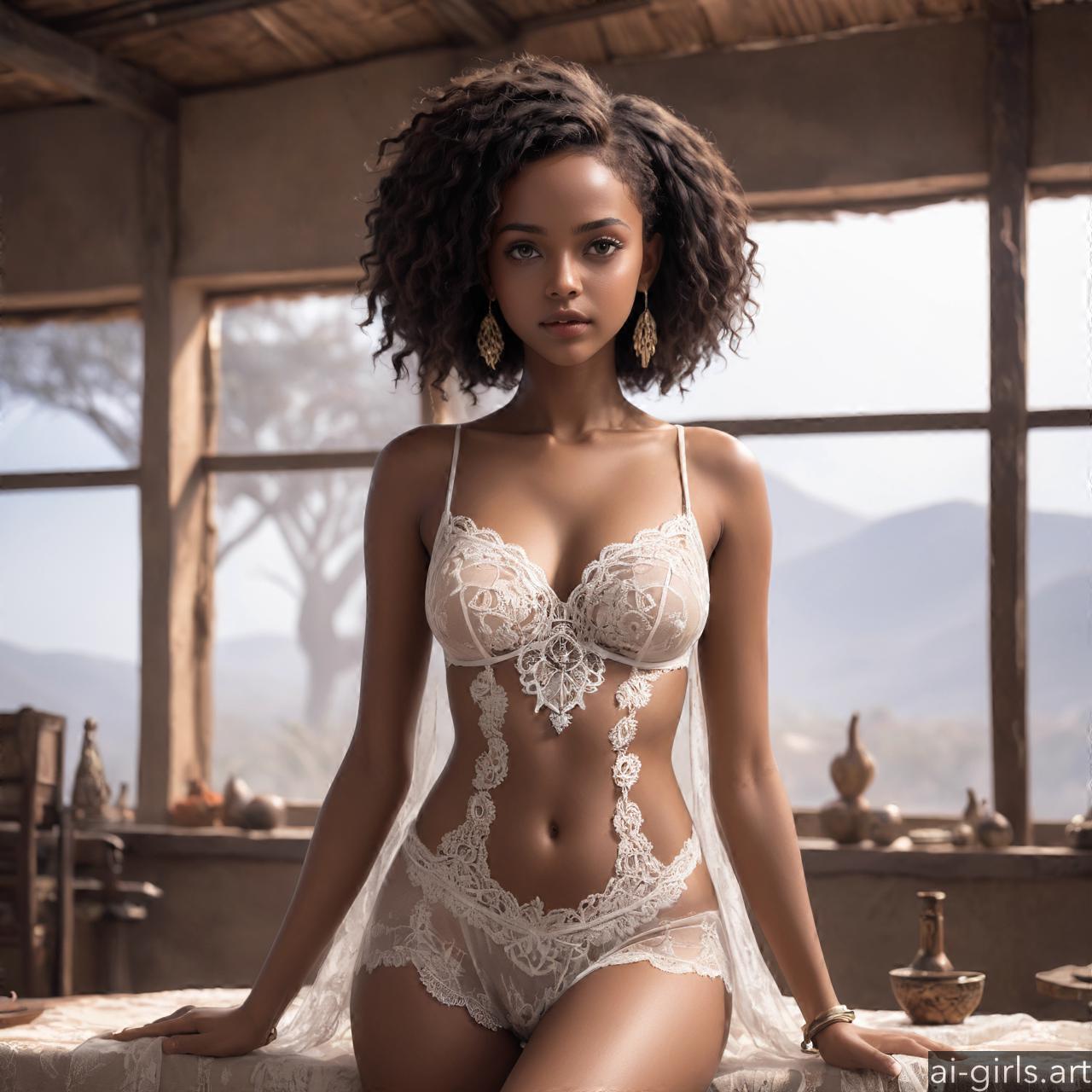 Black girl in sheer lace babydoll in a palace bedroom.