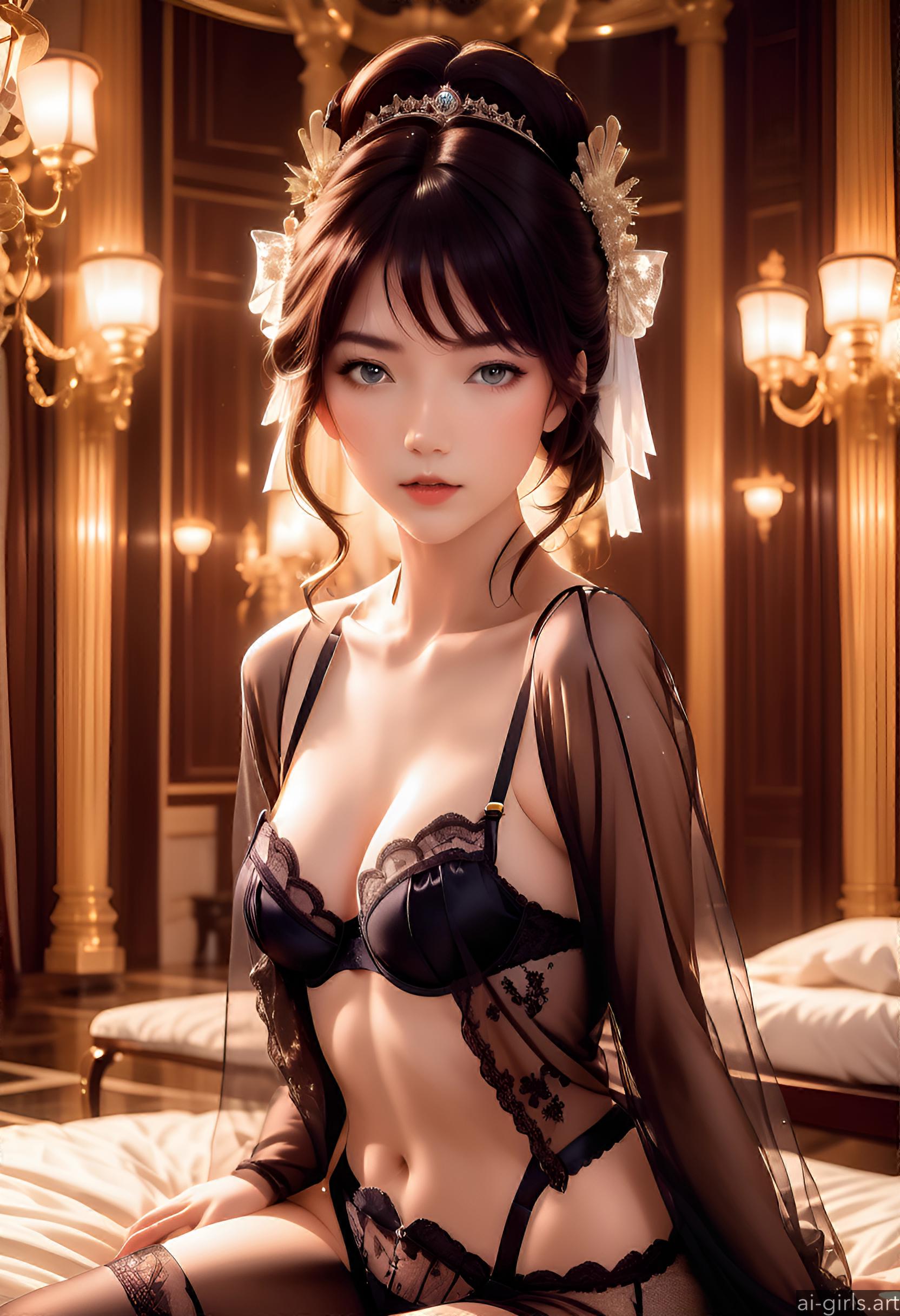 japanese girl wearing bras,hosiery and garter belts in a palace bedroom