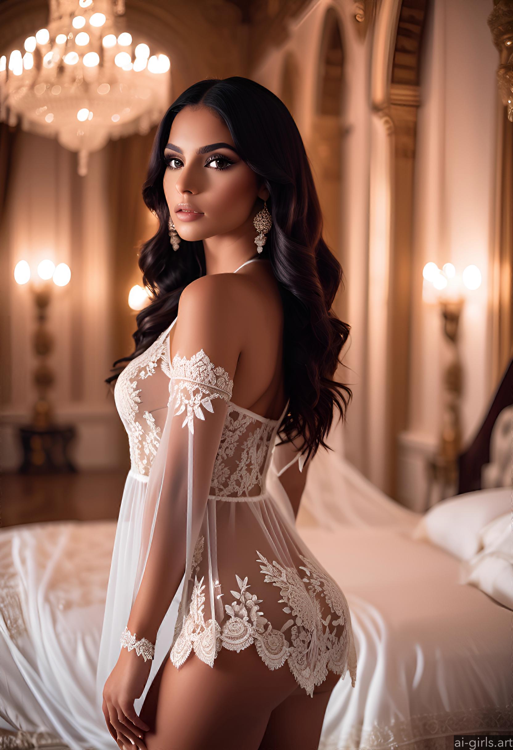 Latino girl in sheer lace babydoll in a palace bedroom.