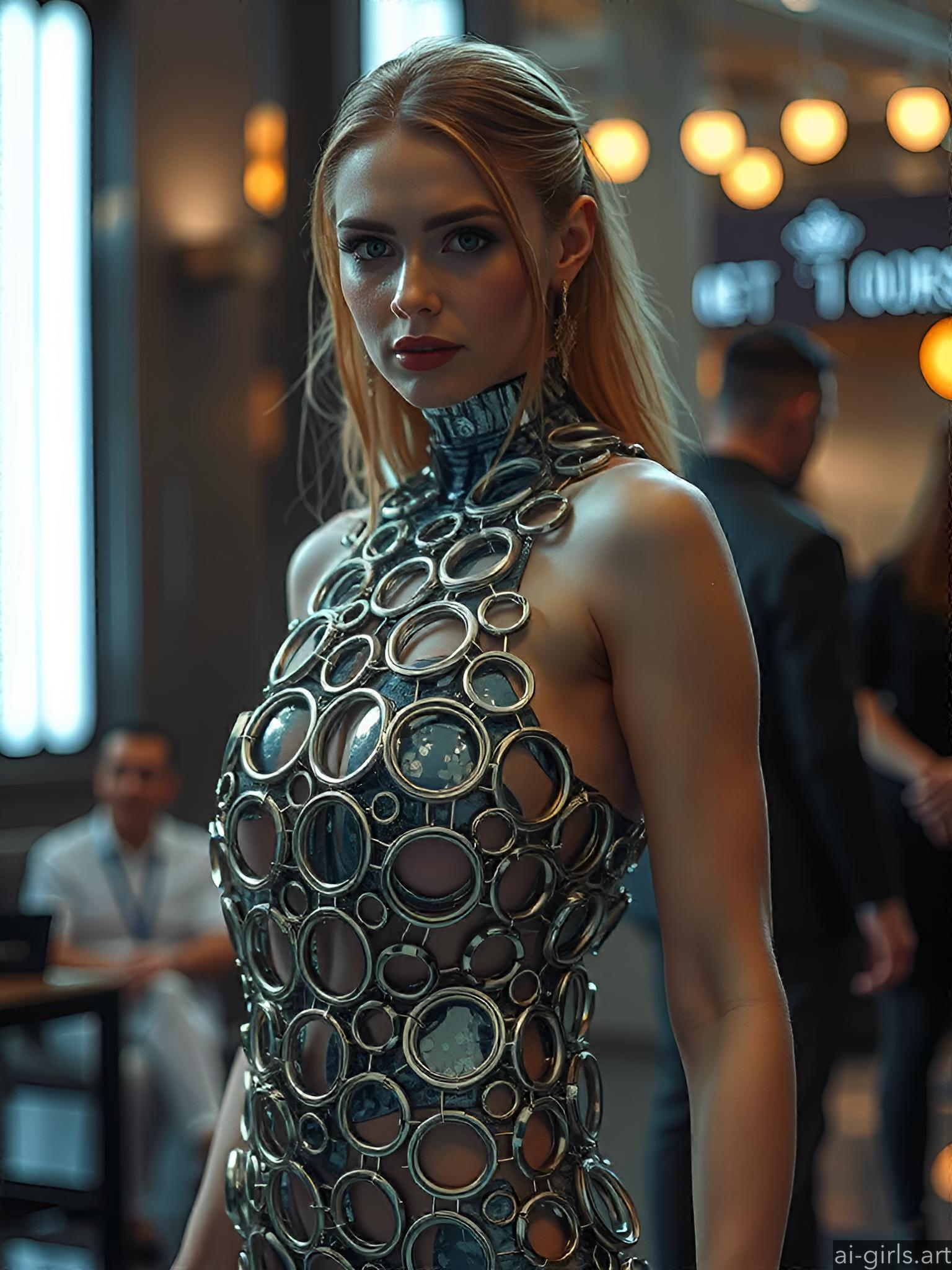 Woman in metallic ring dress.