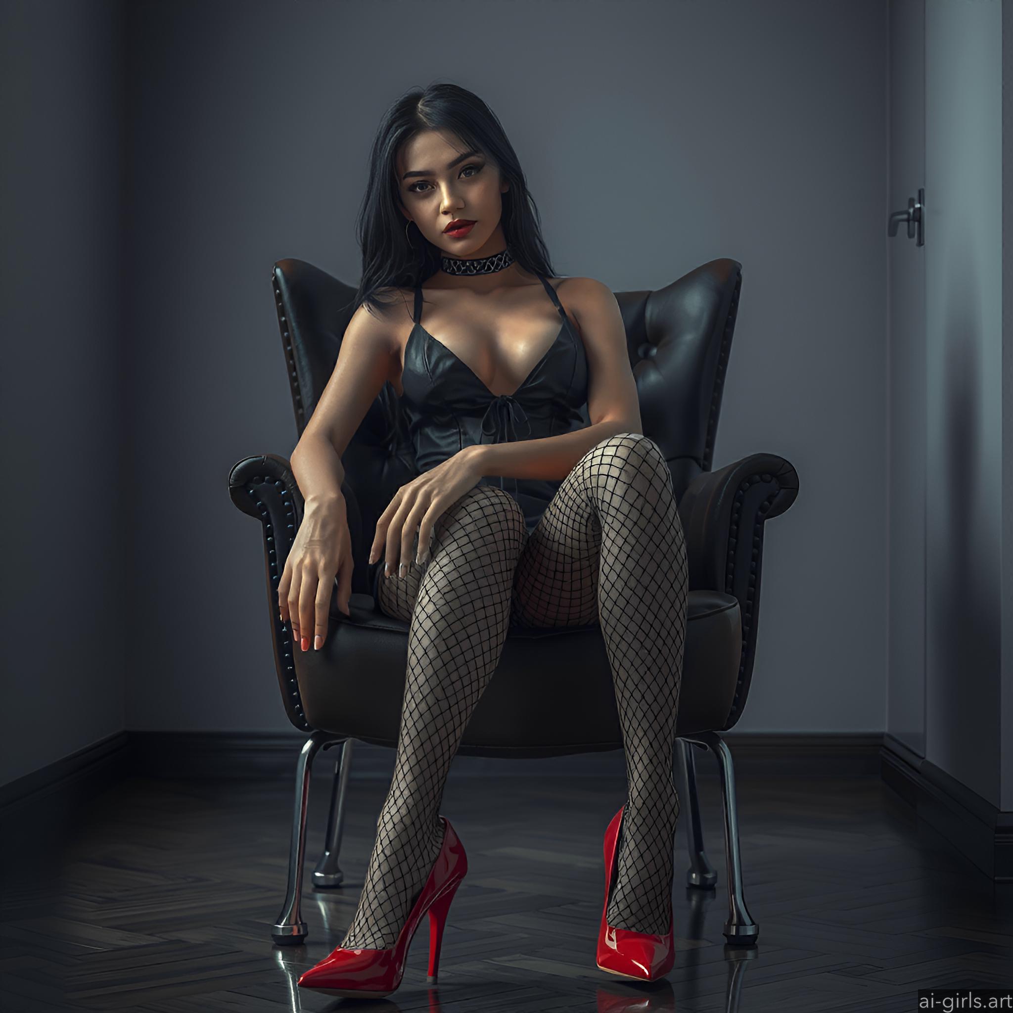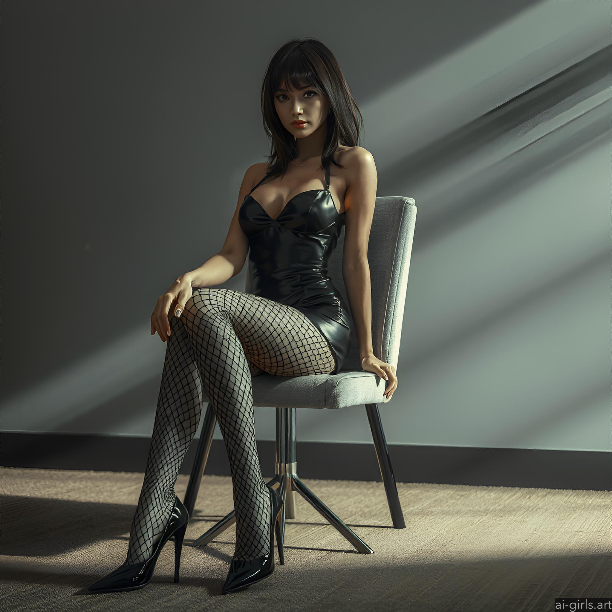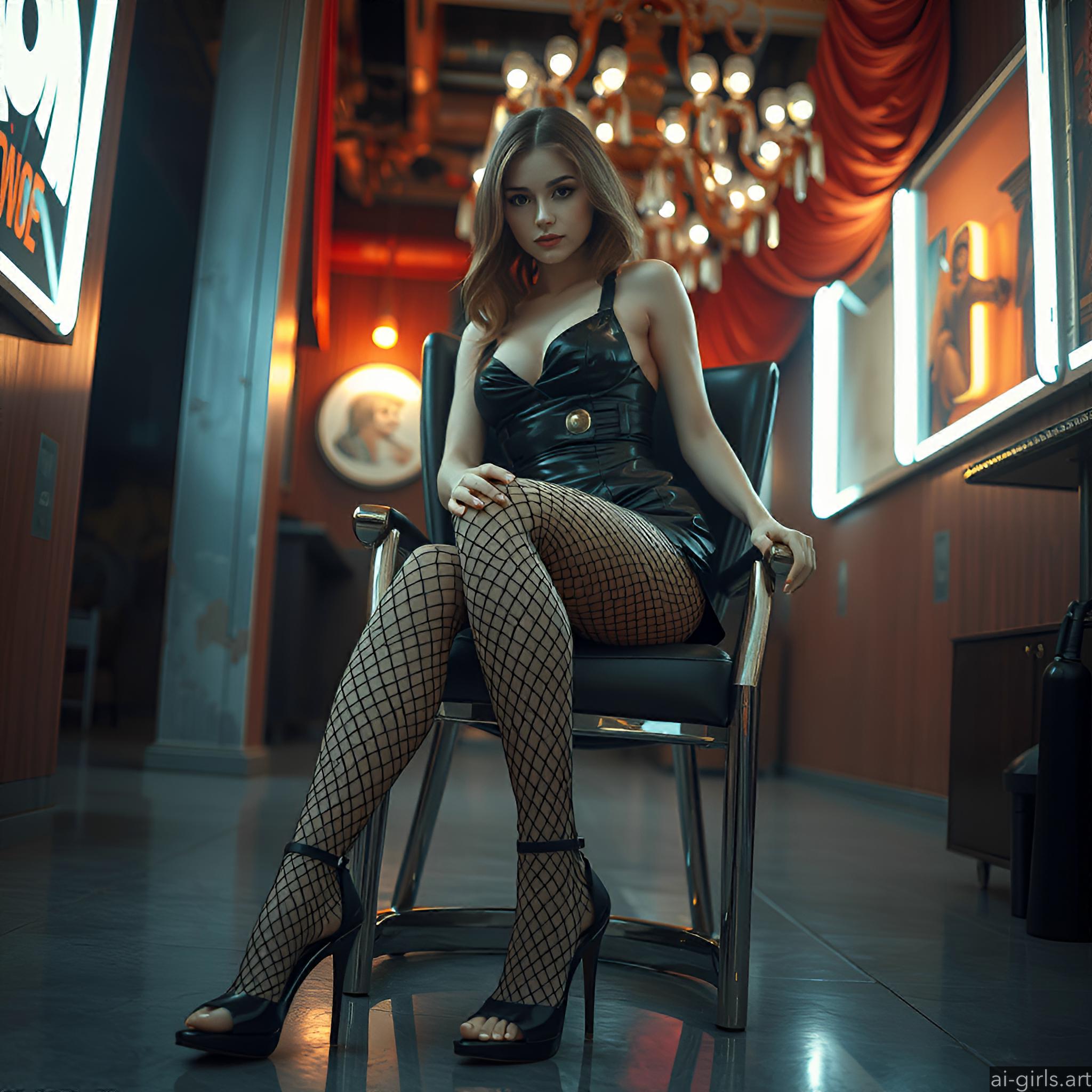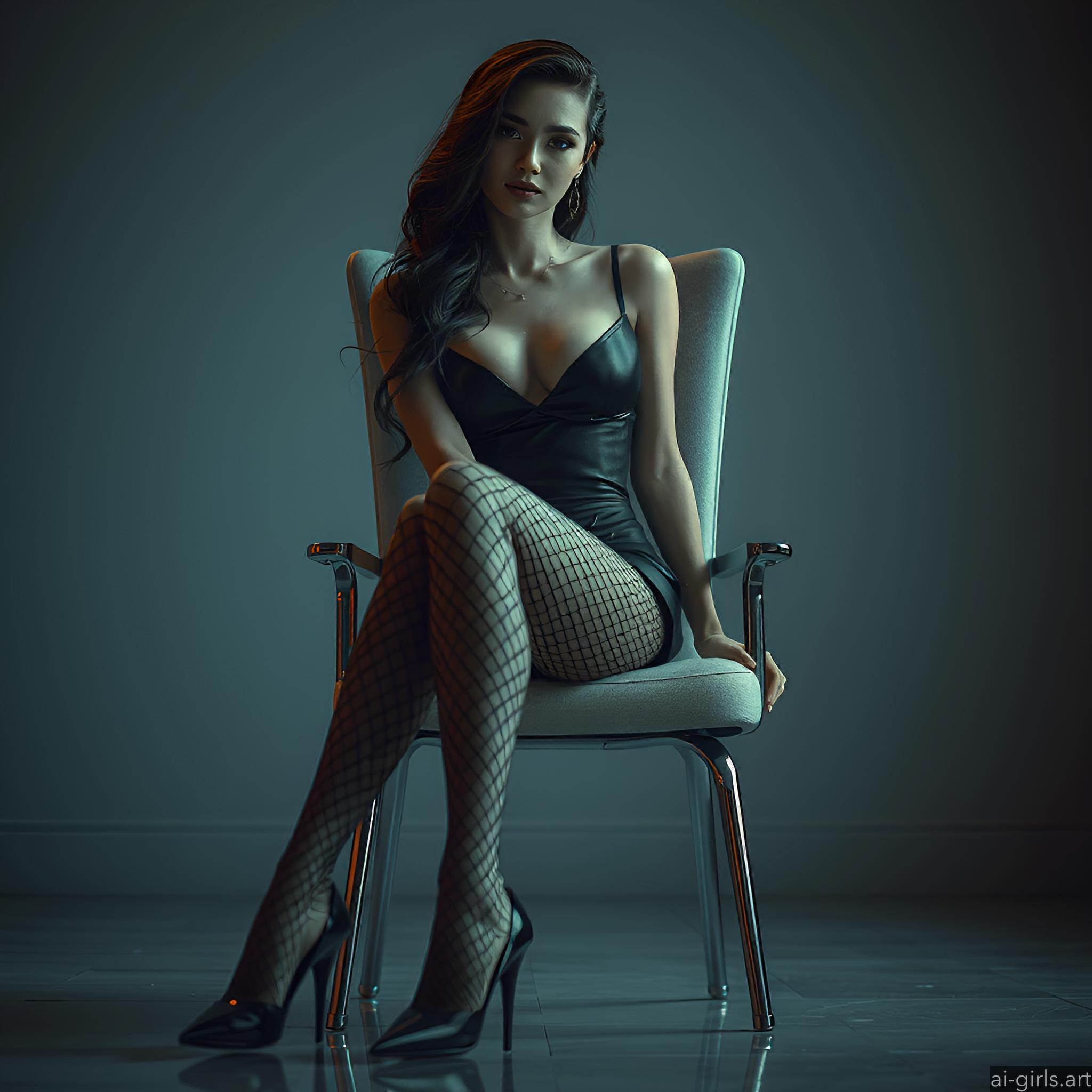 A seductive young woman siting on a chair and wearing a short stealth dress, fishnet panty and high stilettos heels.