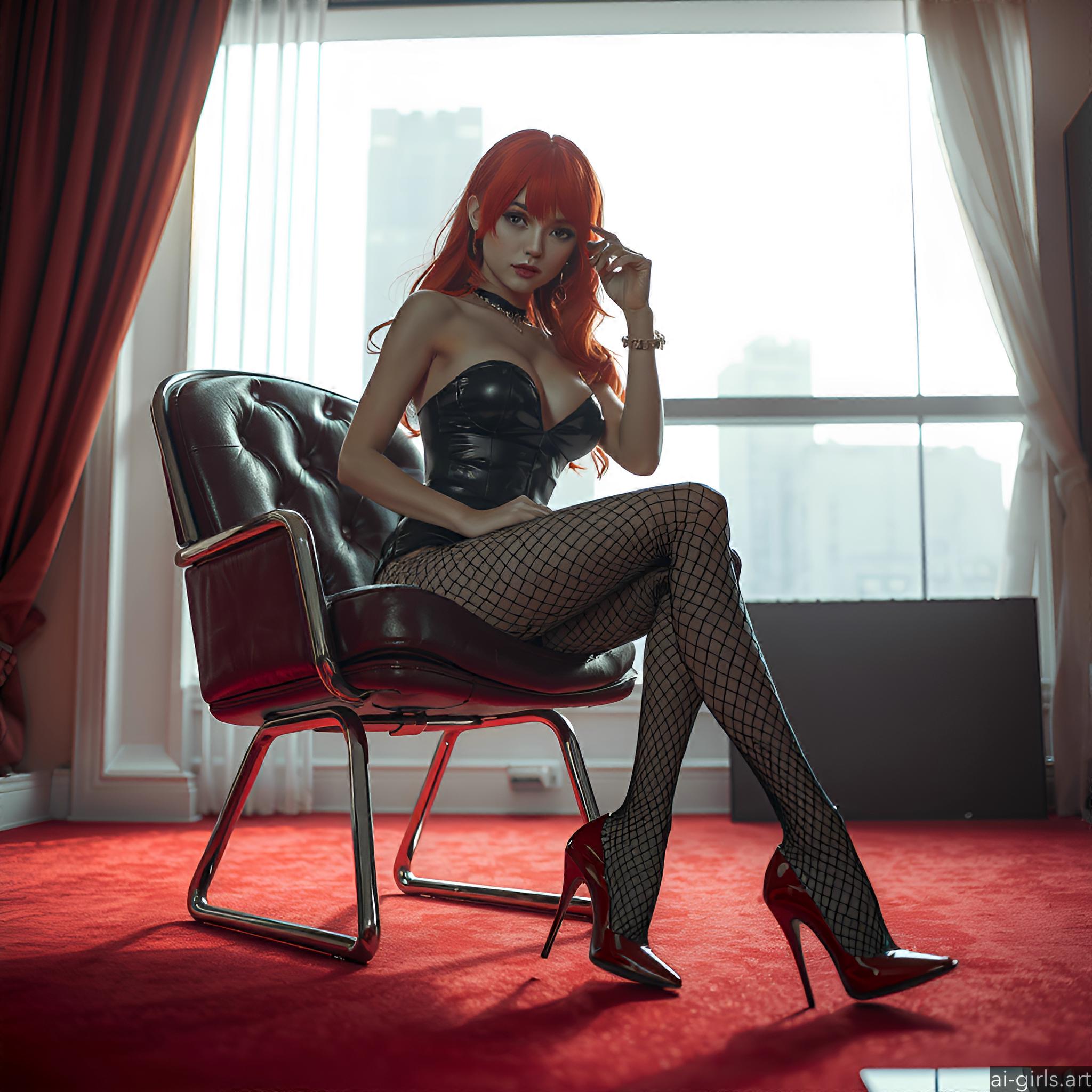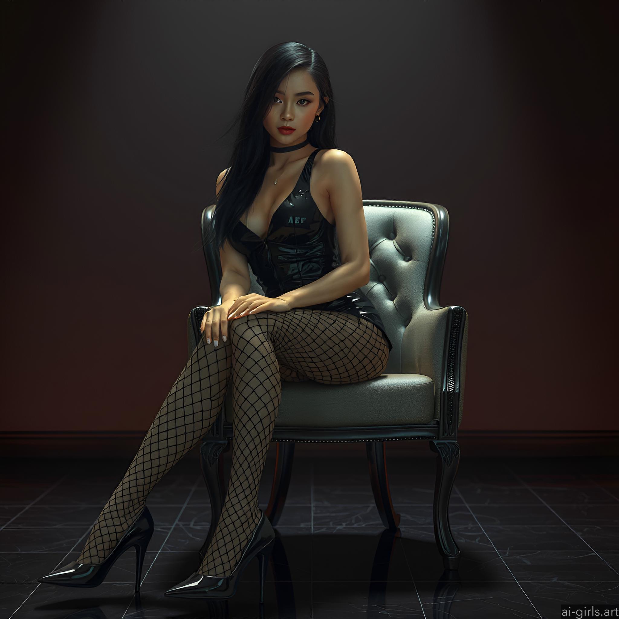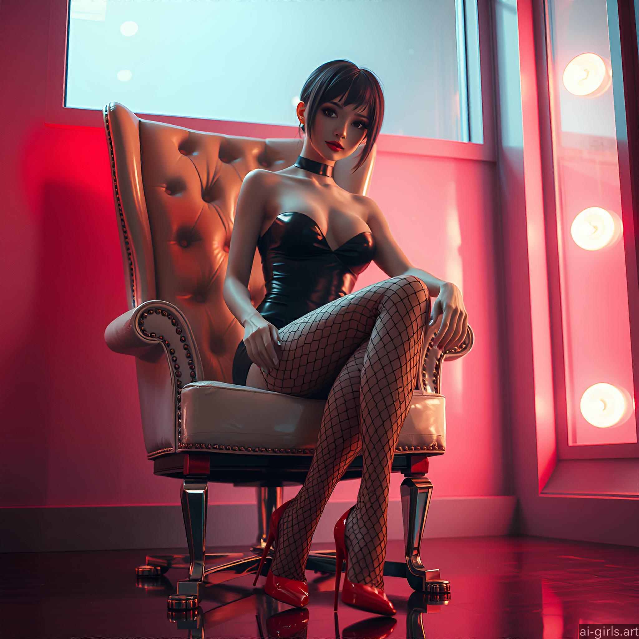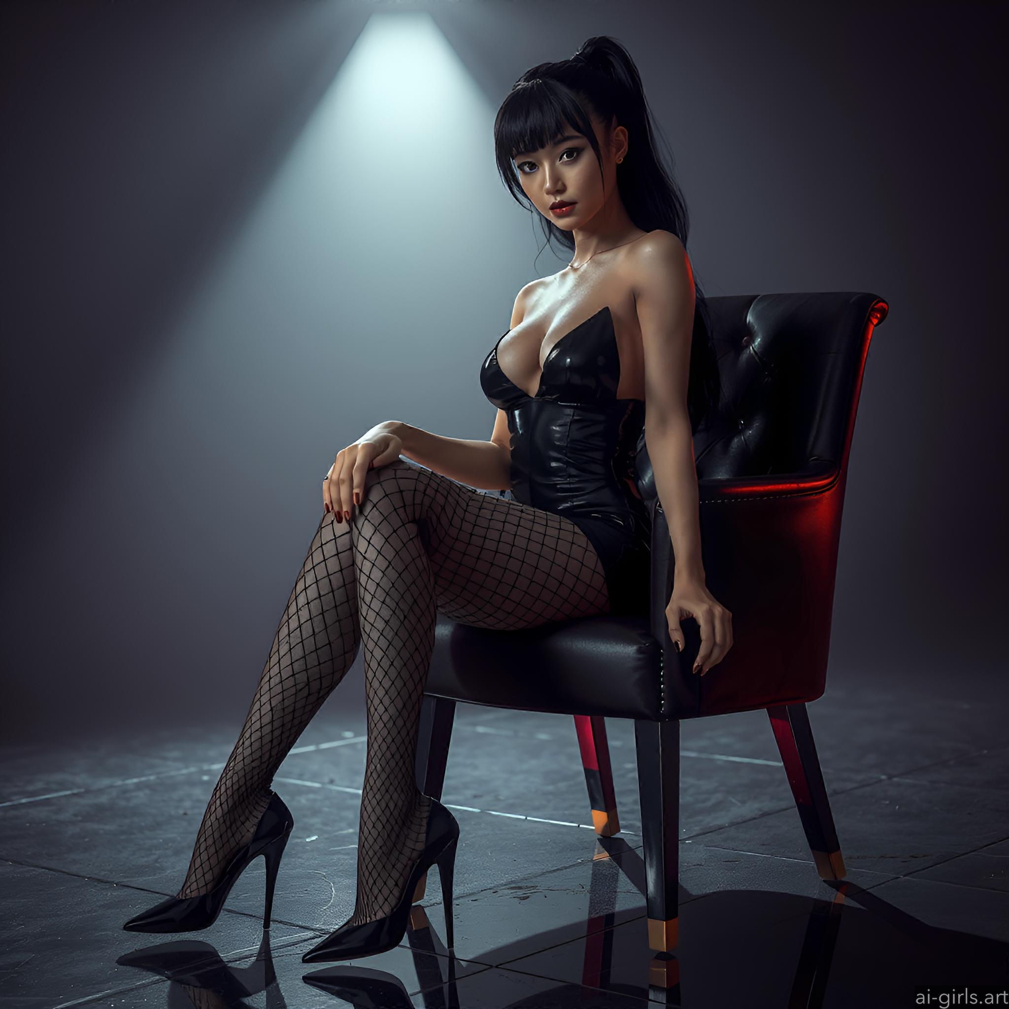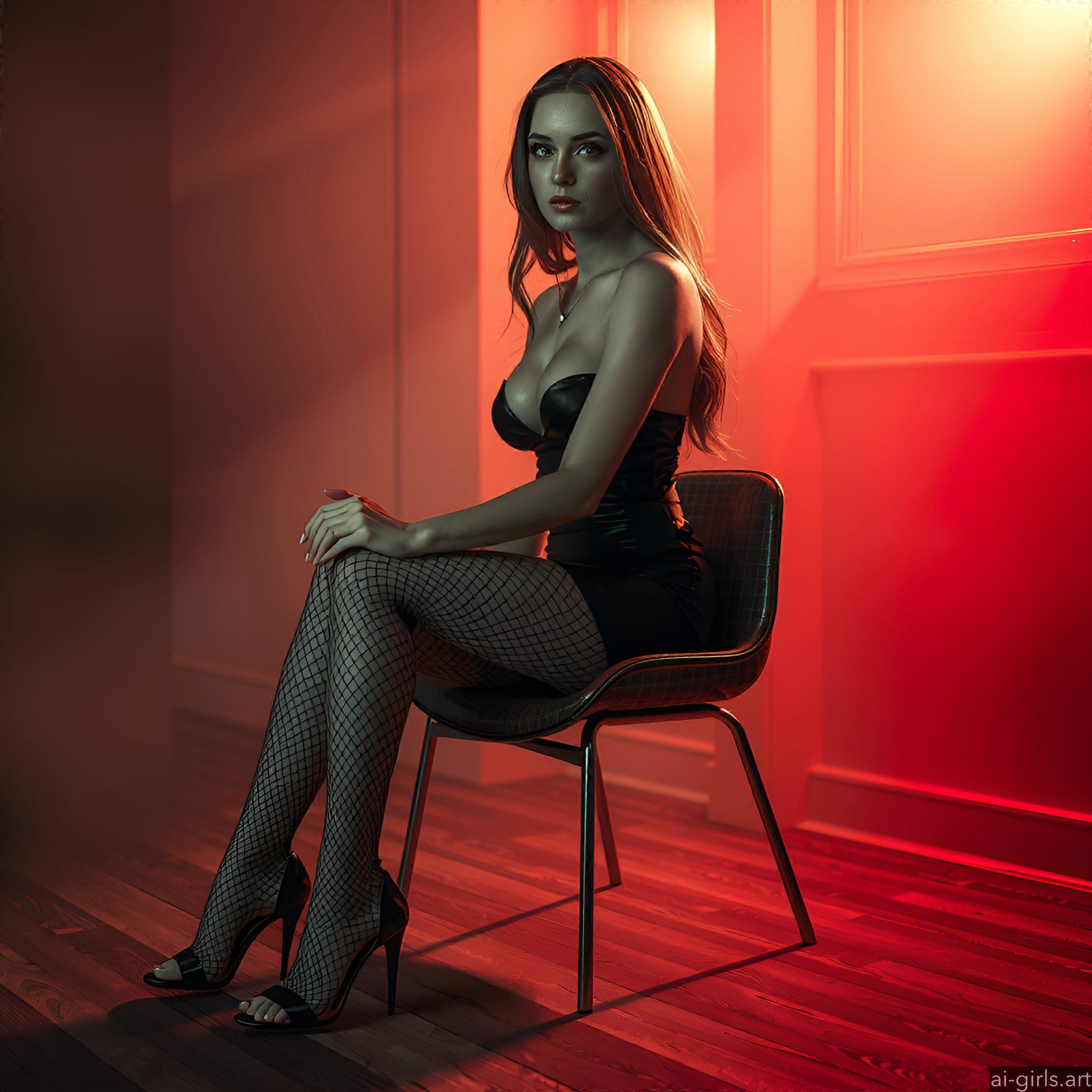 A seductive young woman siting on a chair and wearing a short stealth dress, fishnet panty and high stilettos heels.