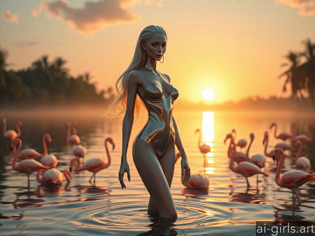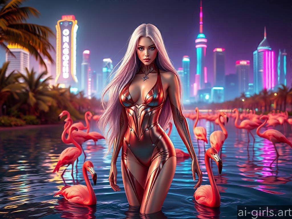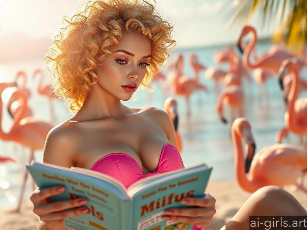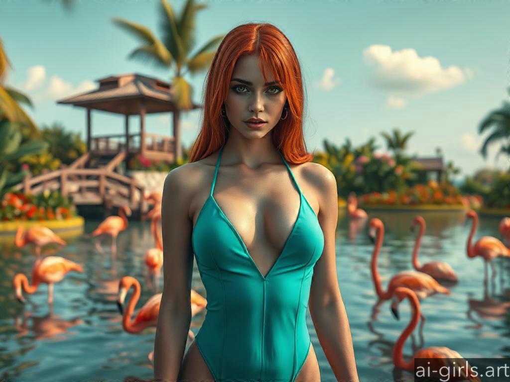 Woman in swimsuit with pink flamingos