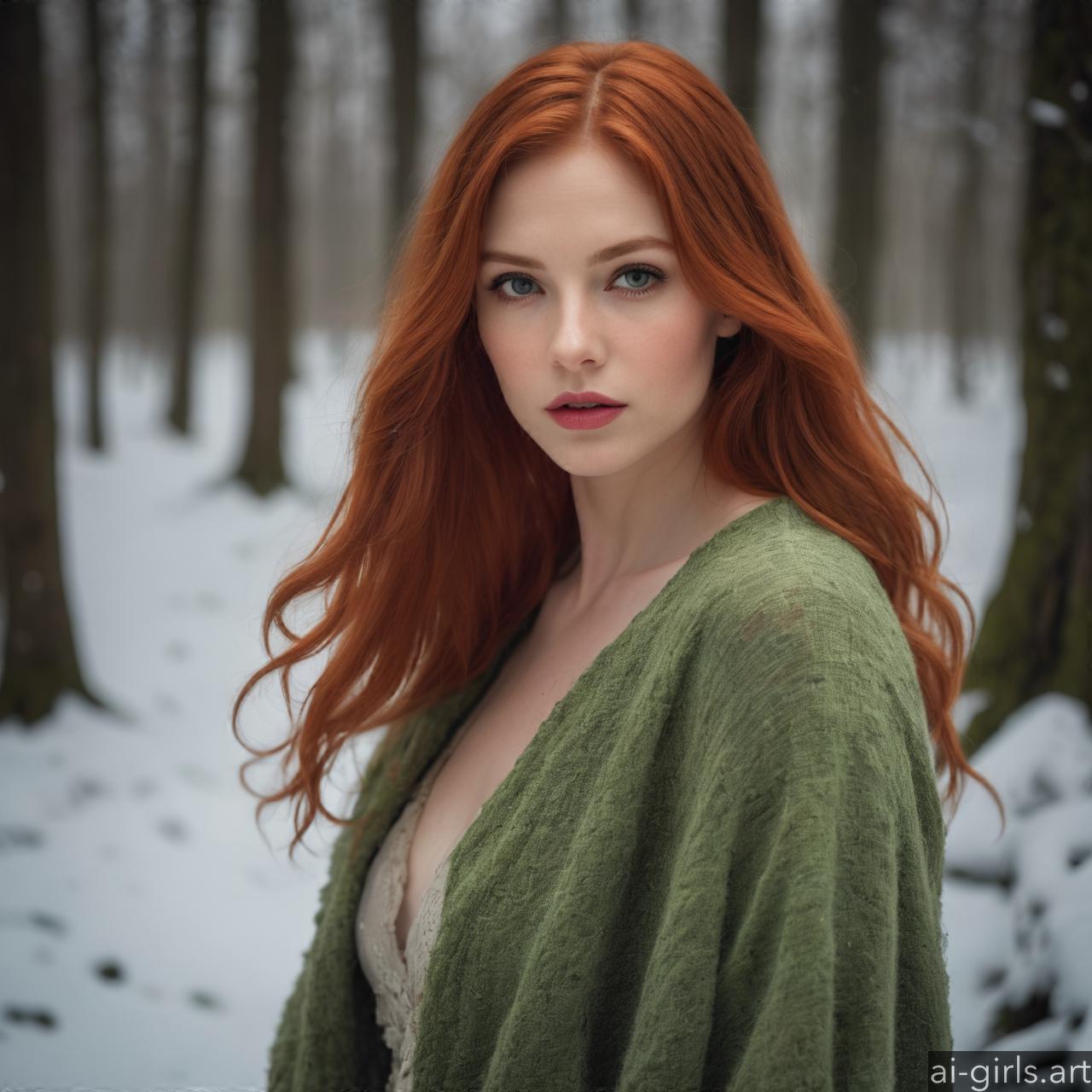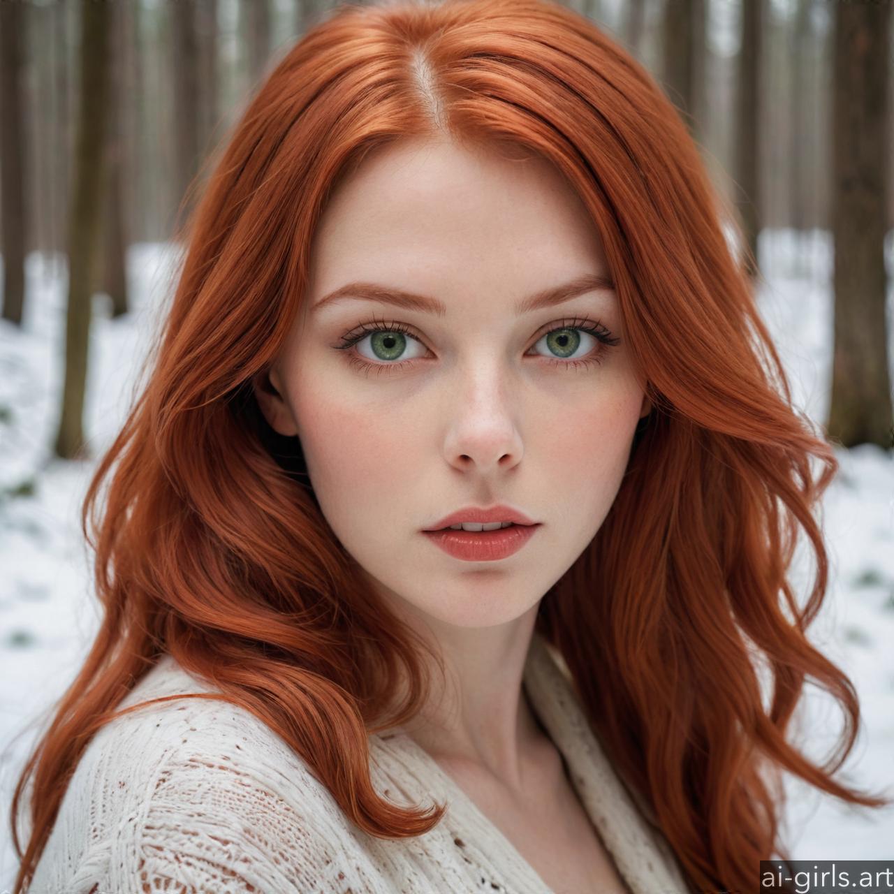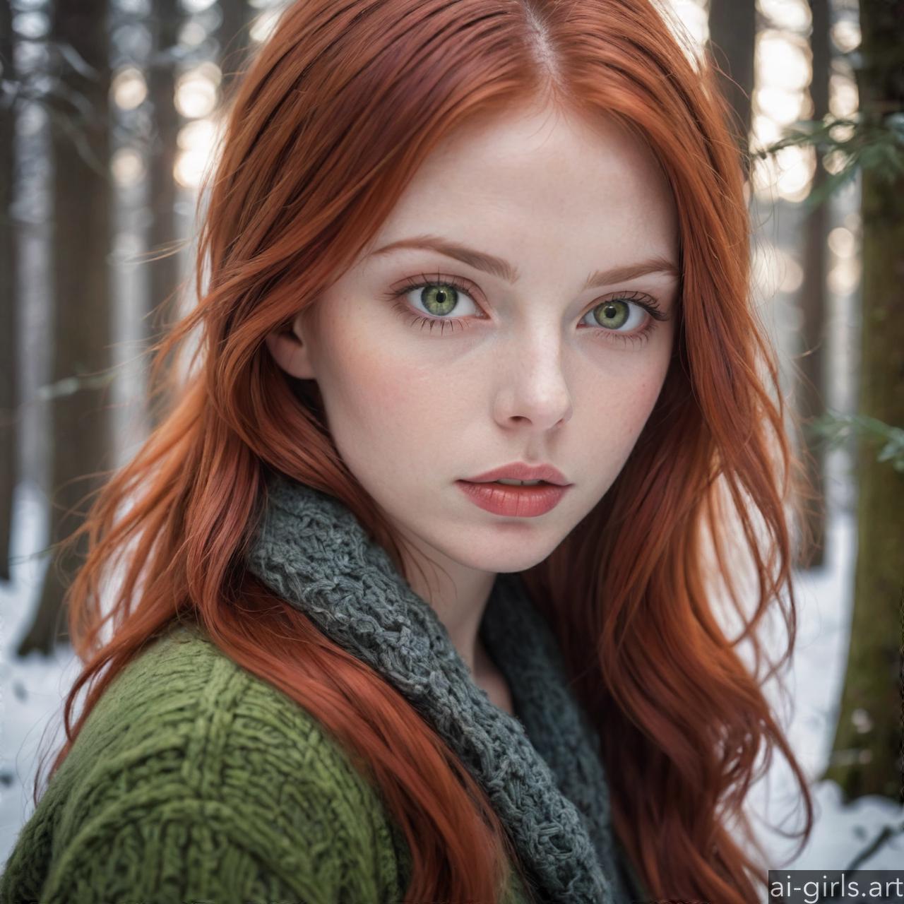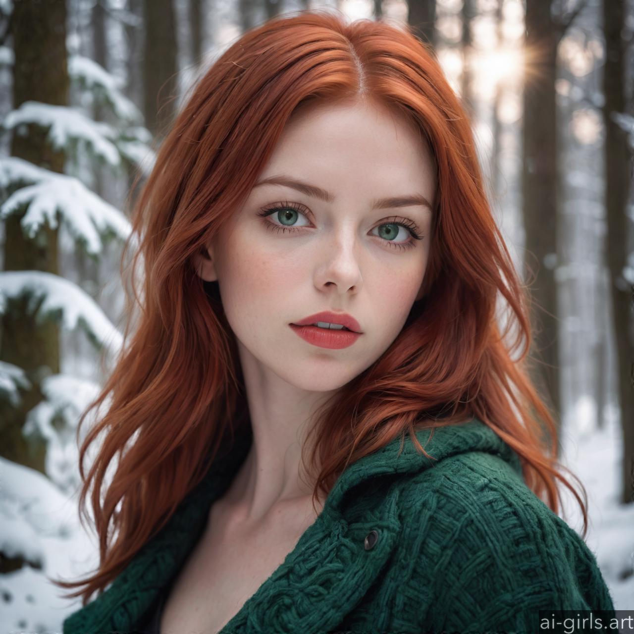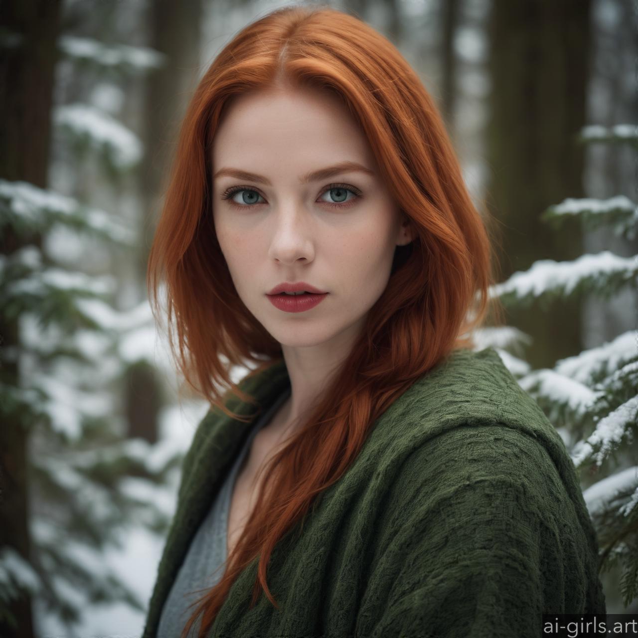 Portrait of a beautiful woman with red hair and green eyes in a winter forest.