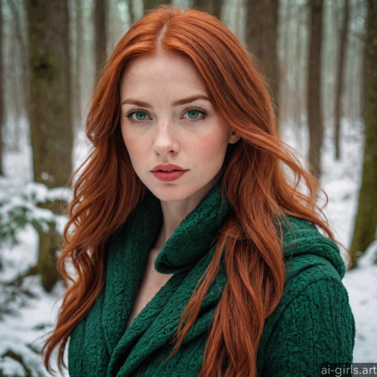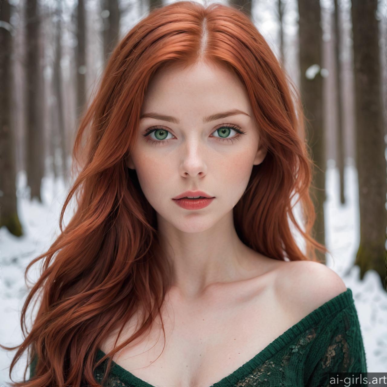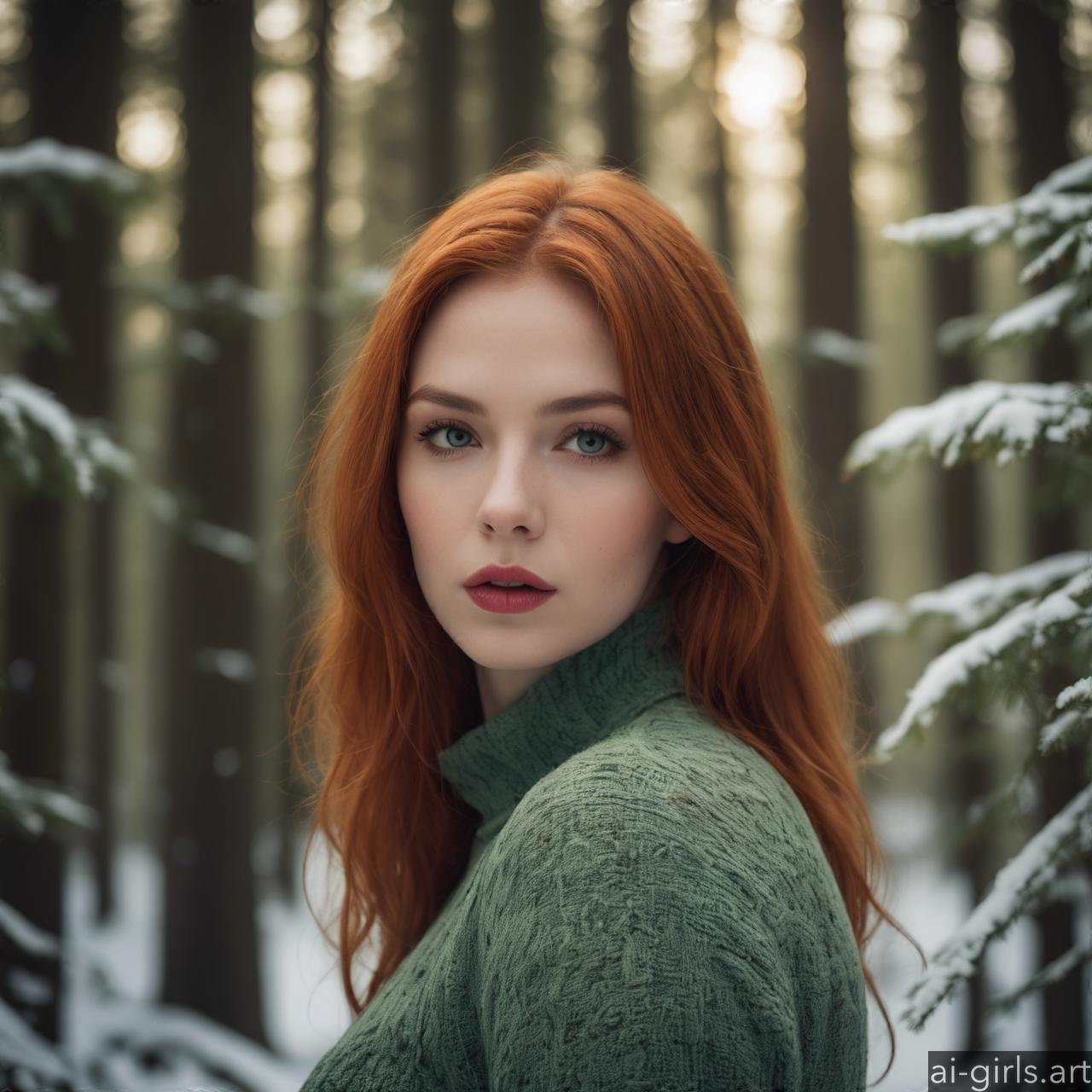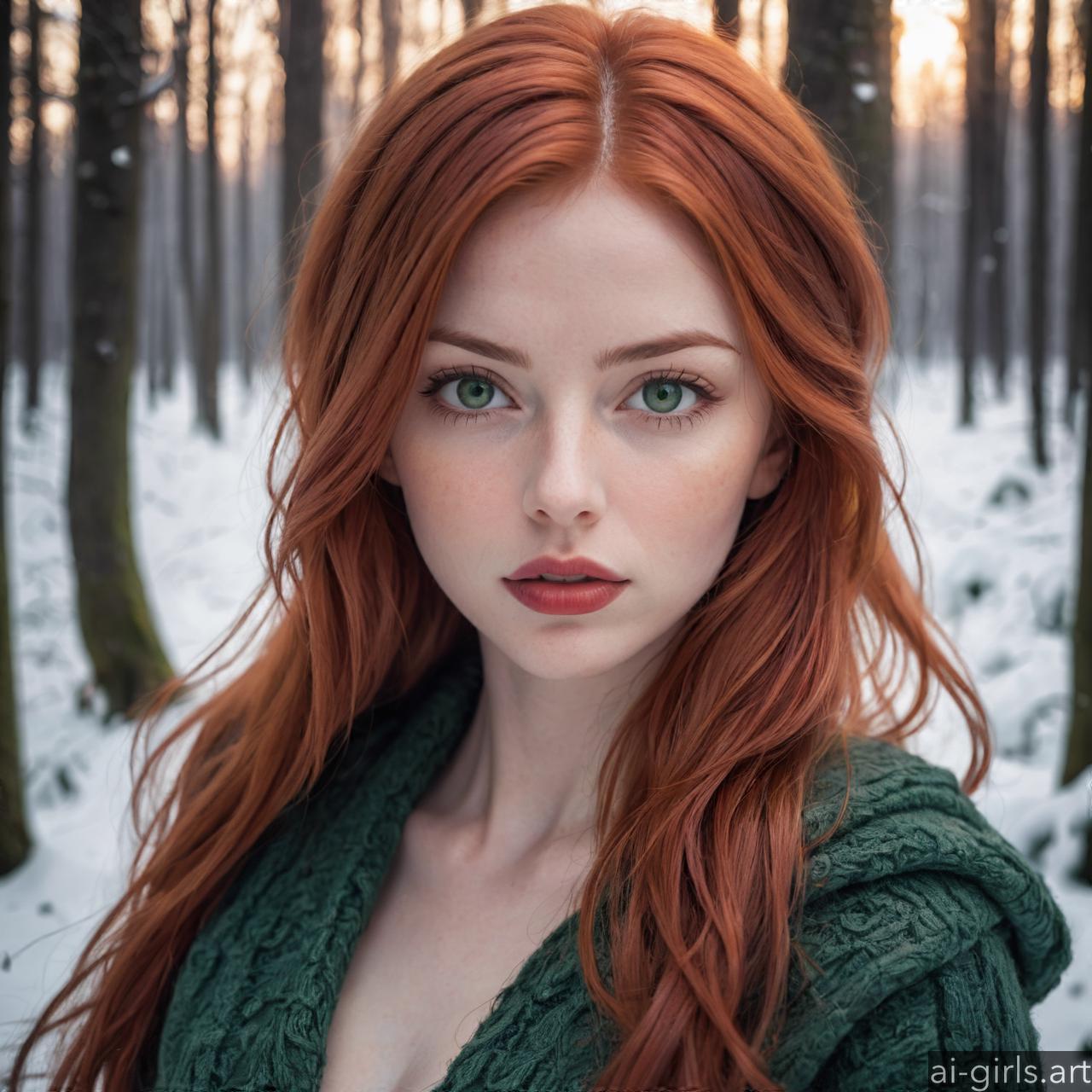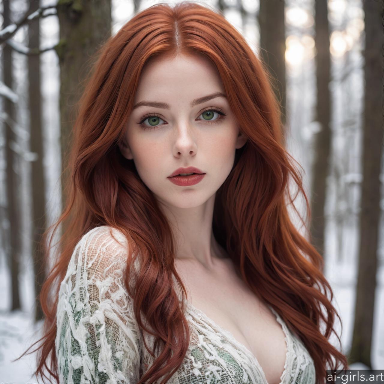Portrait of a beautiful woman with red hair and green eyes in a winter forest.