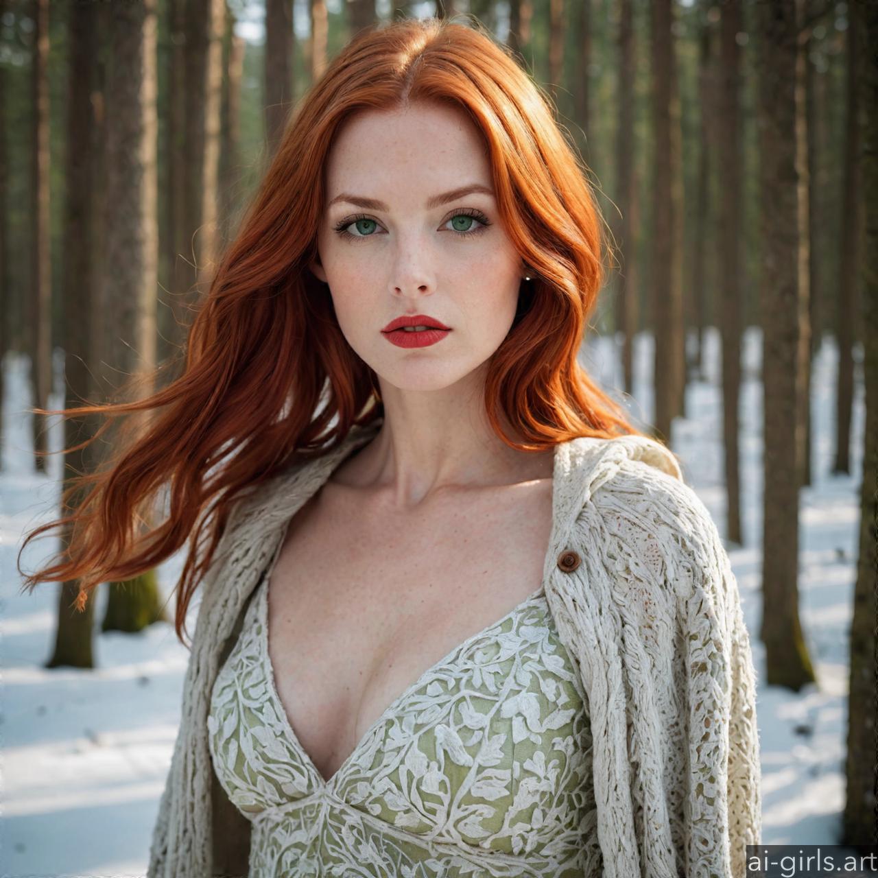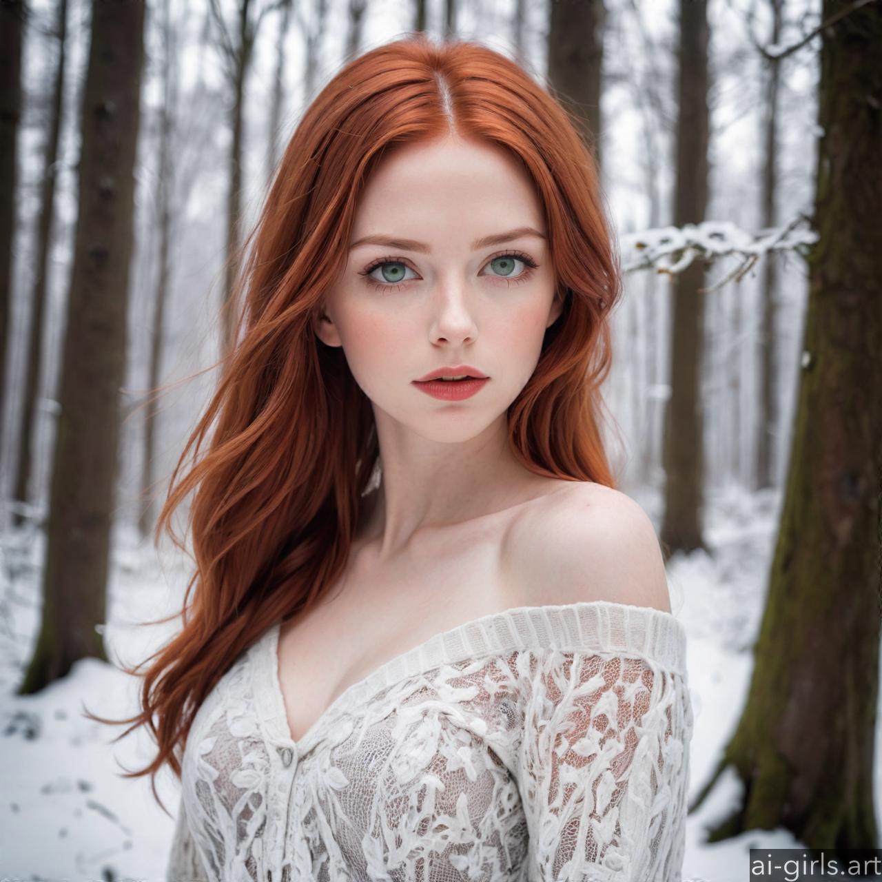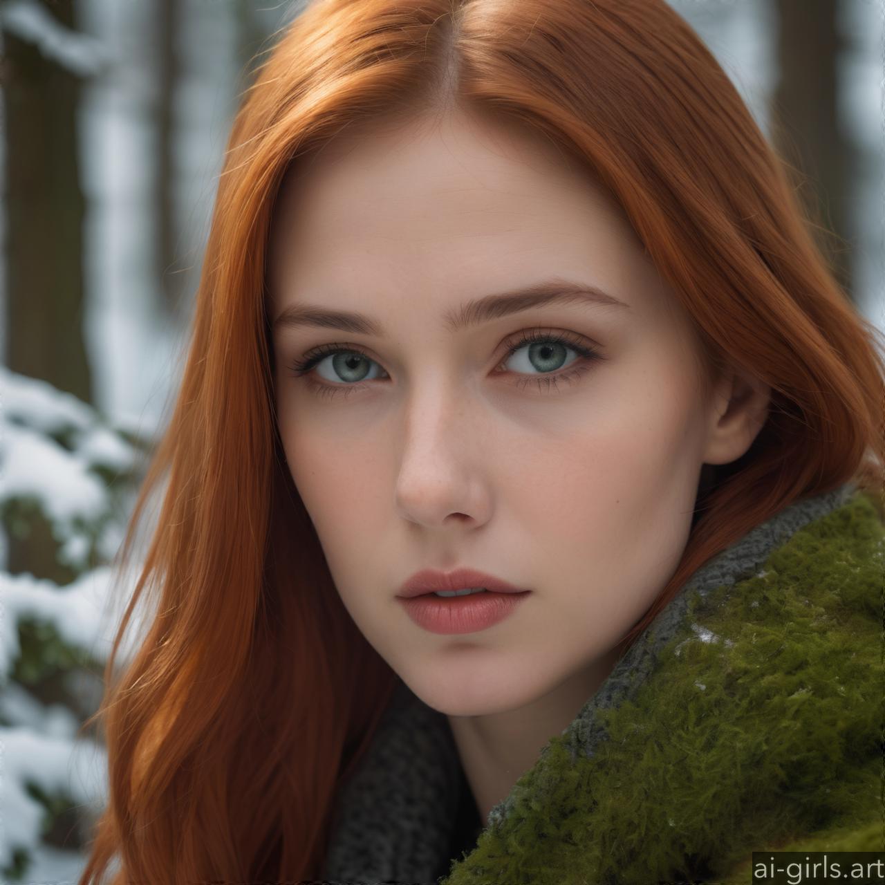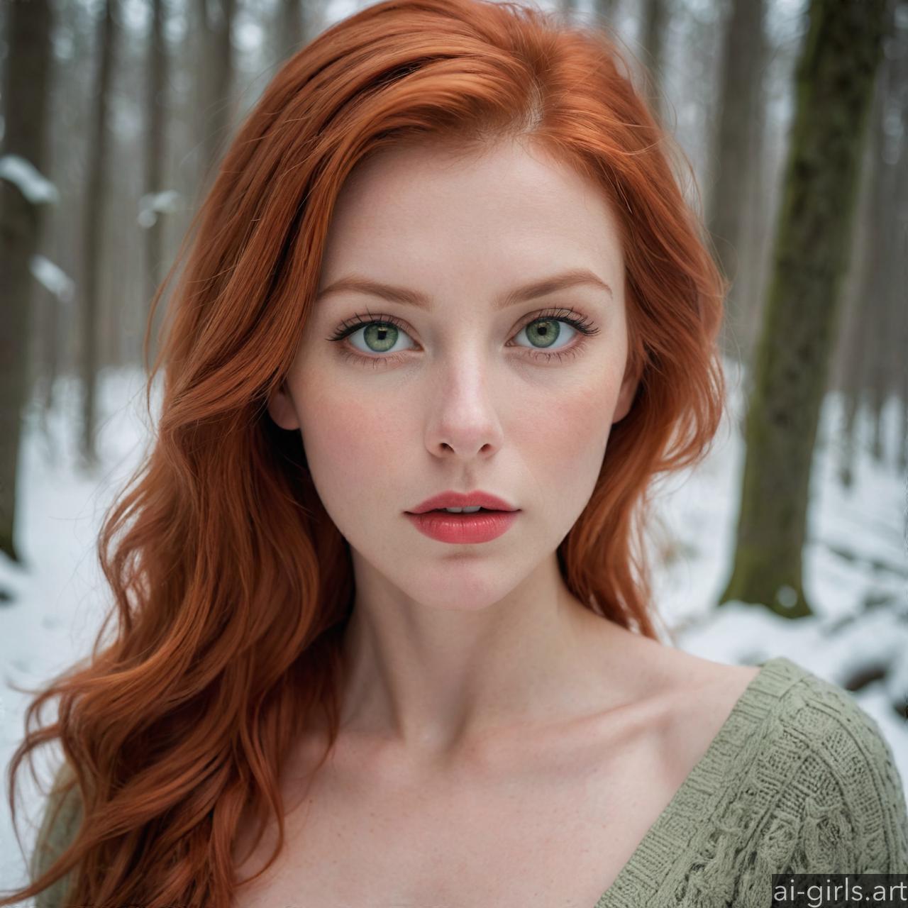 Portrait of a beautiful woman with red hair and green eyes in a winter forest.