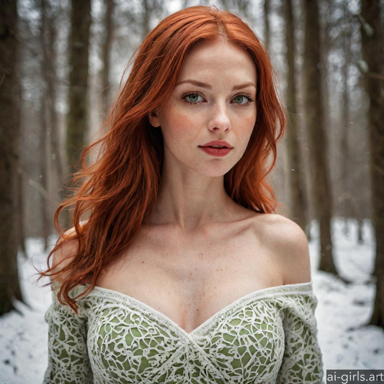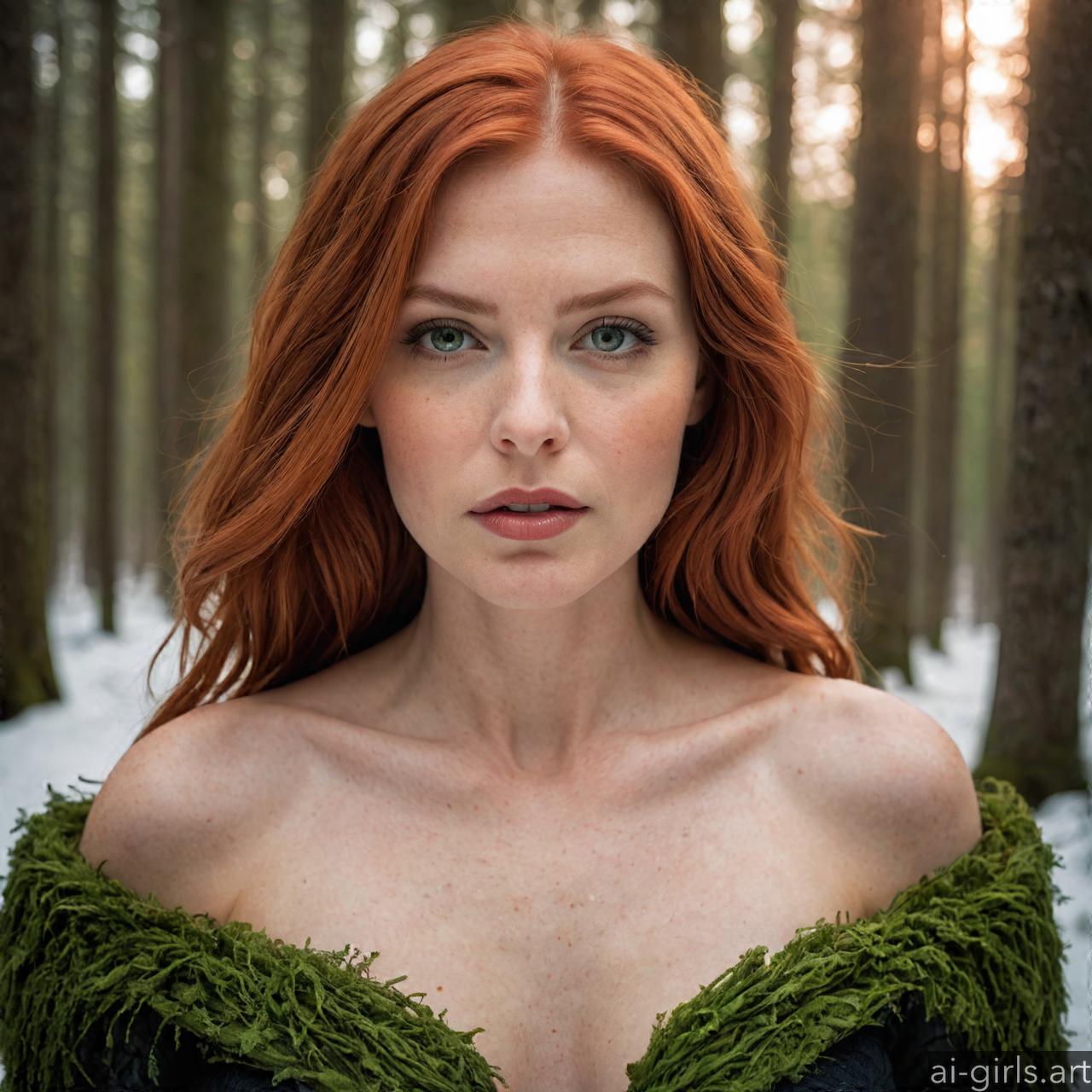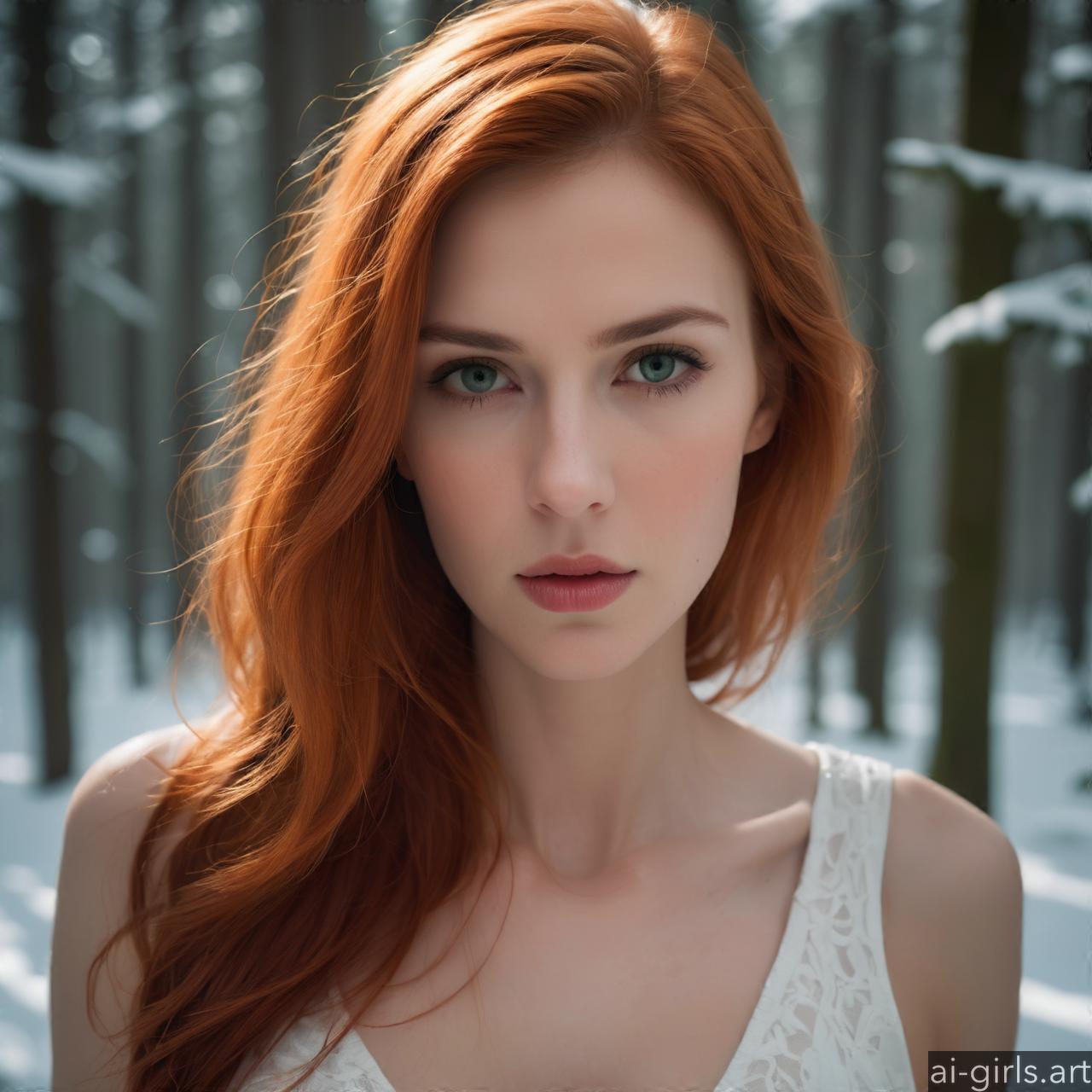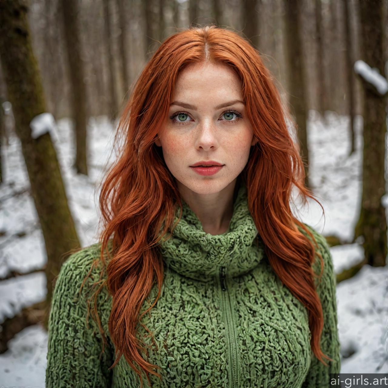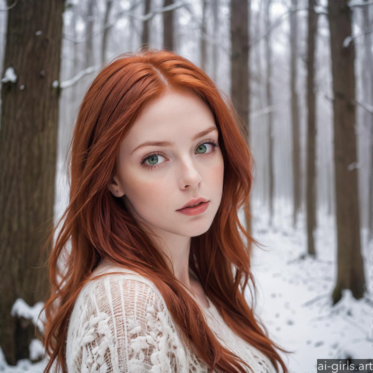 Portrait of a beautiful woman with red hair and green eyes in a winter forest.