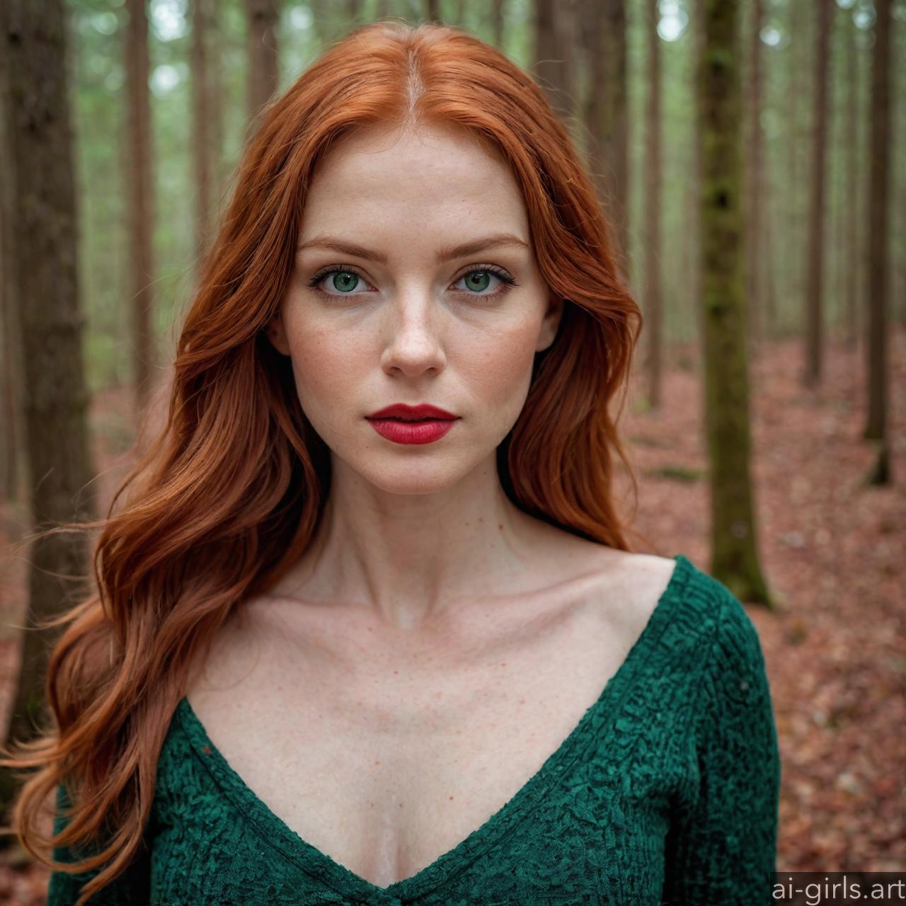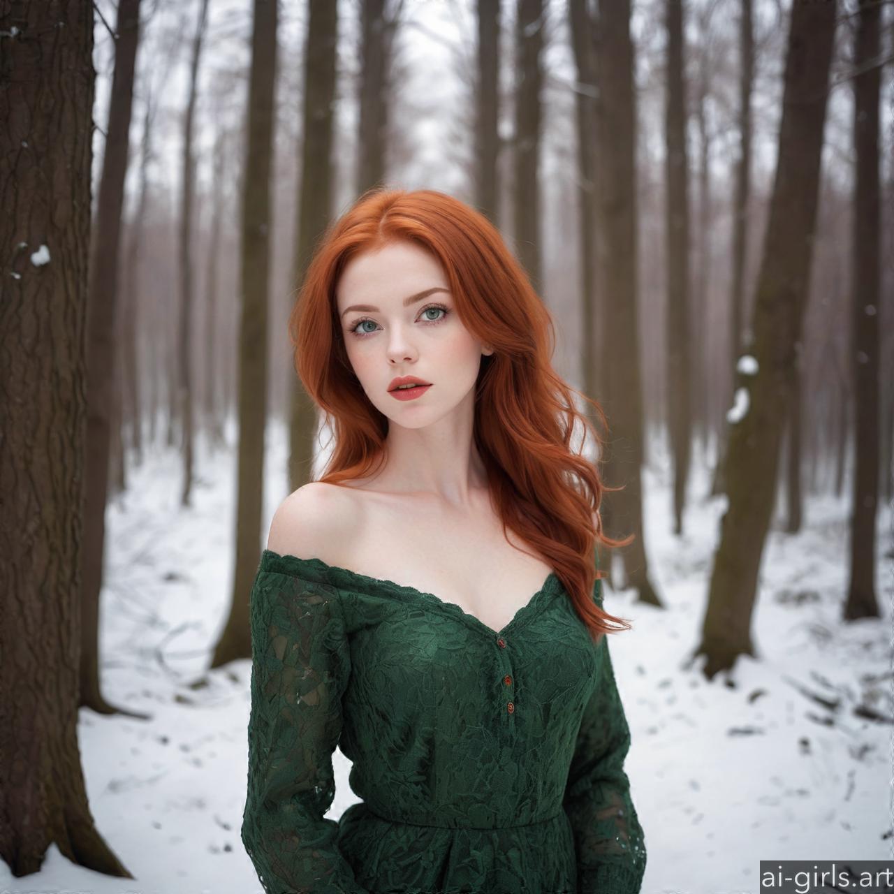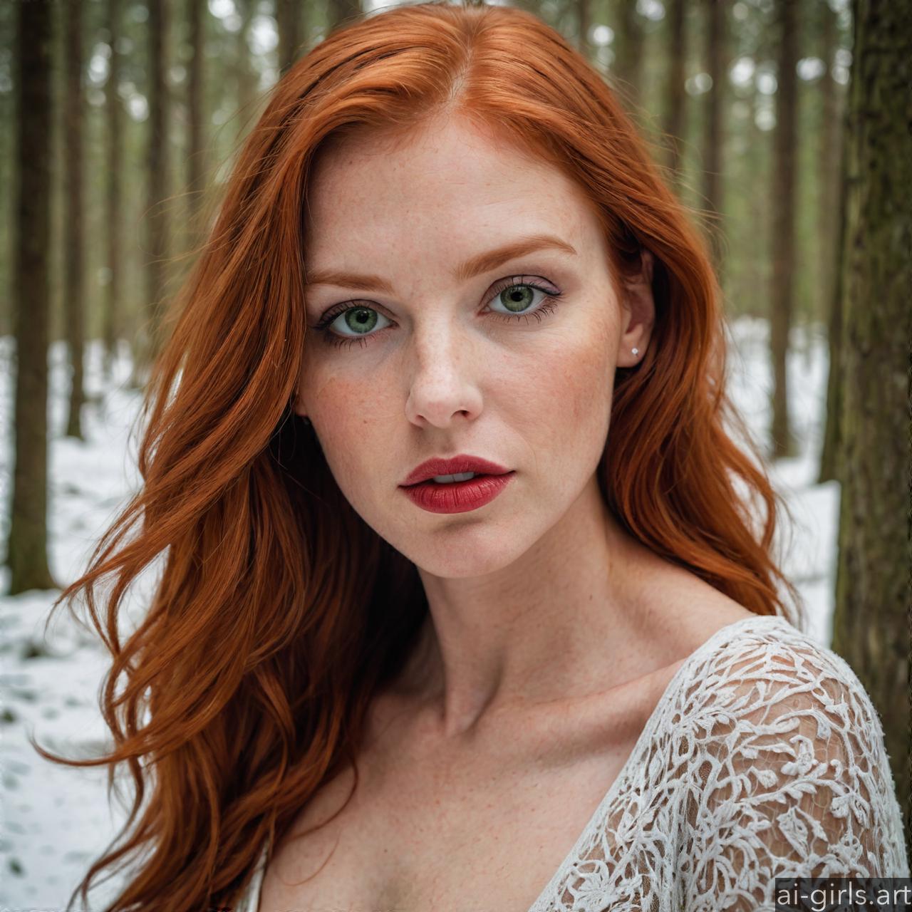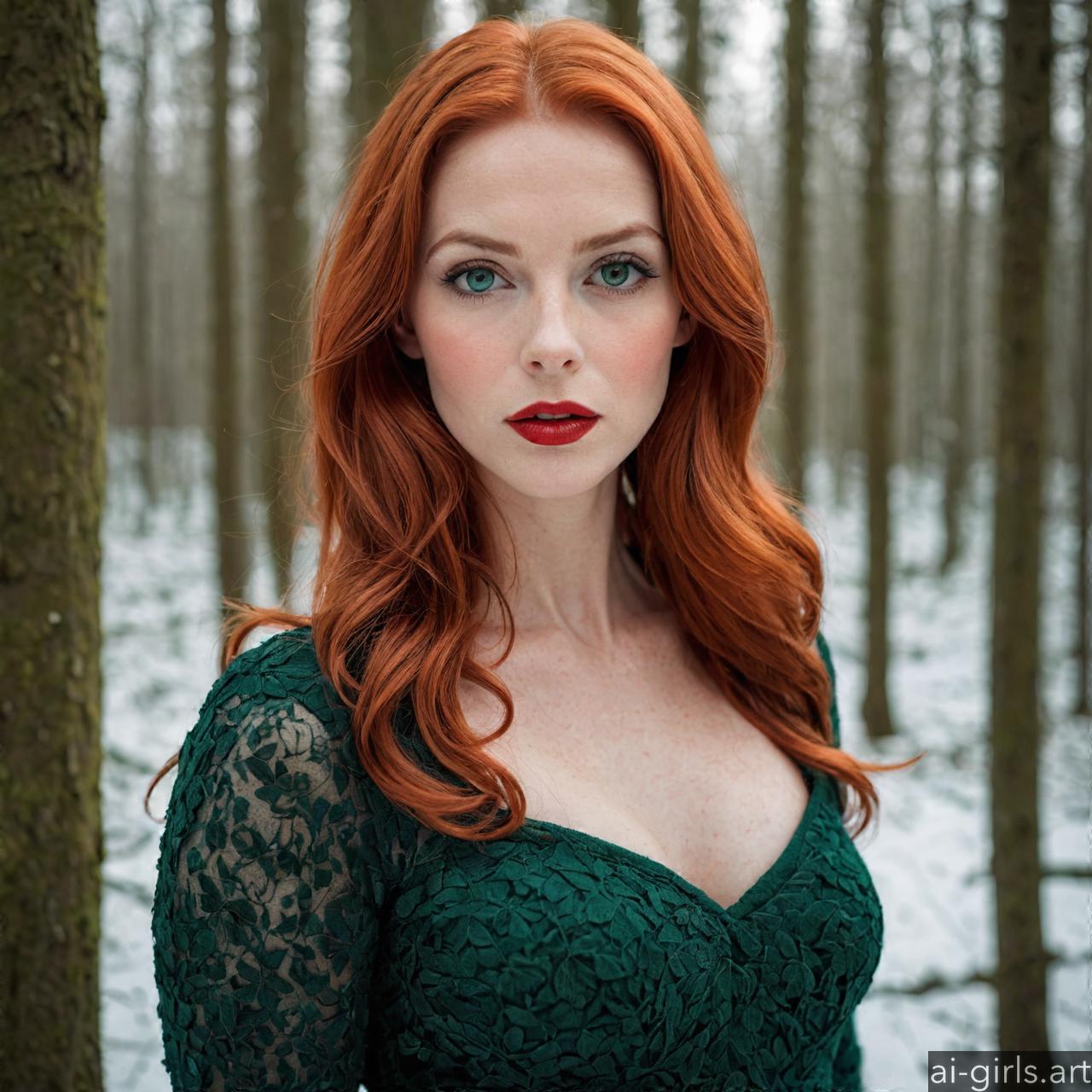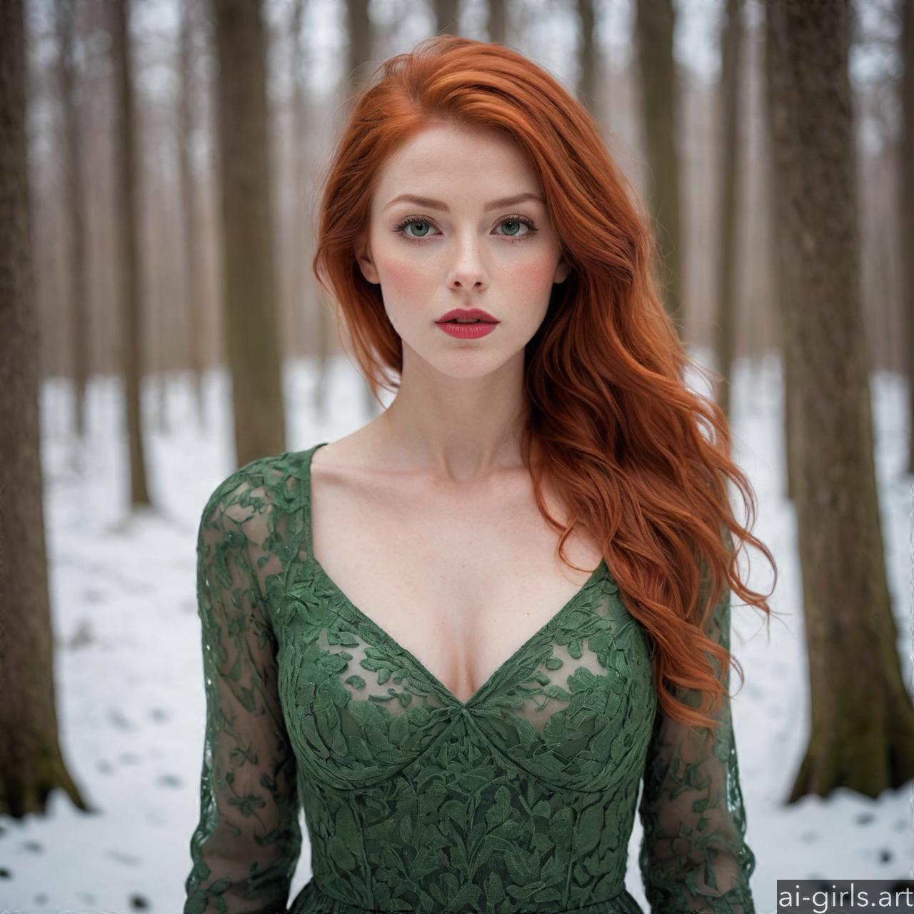 Portrait of a beautiful woman with red hair and green eyes in a winter forest.