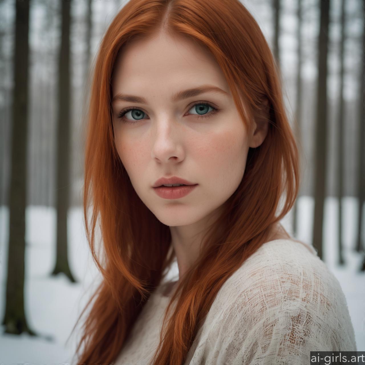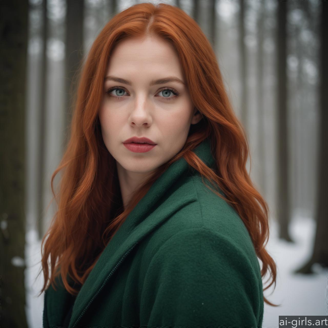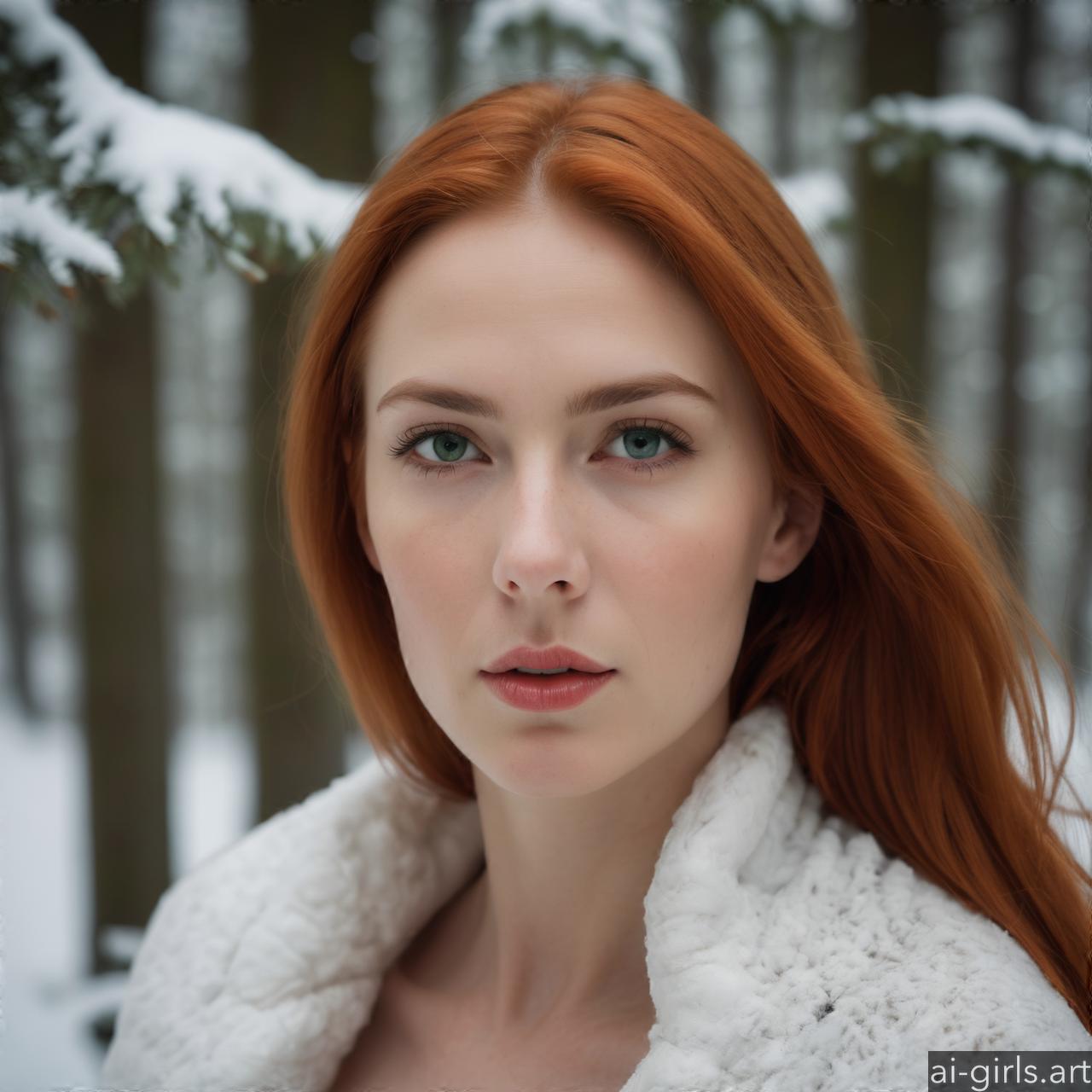 Portrait of a woman with red hair in a winter forest