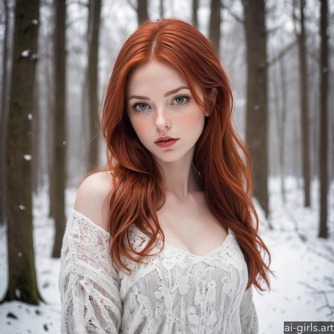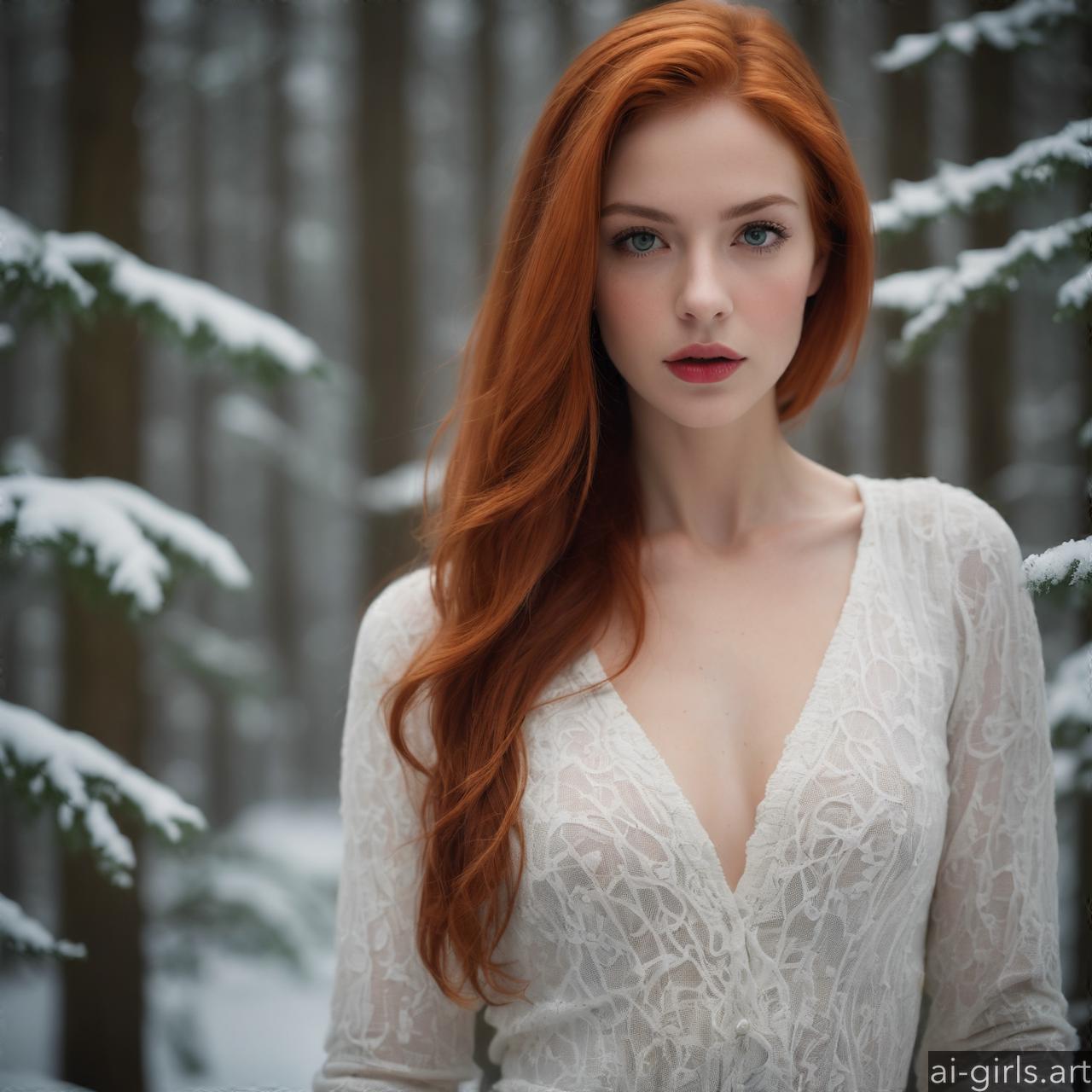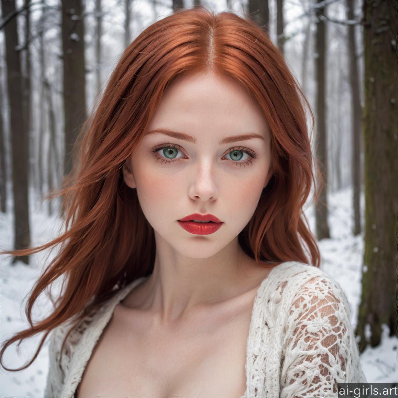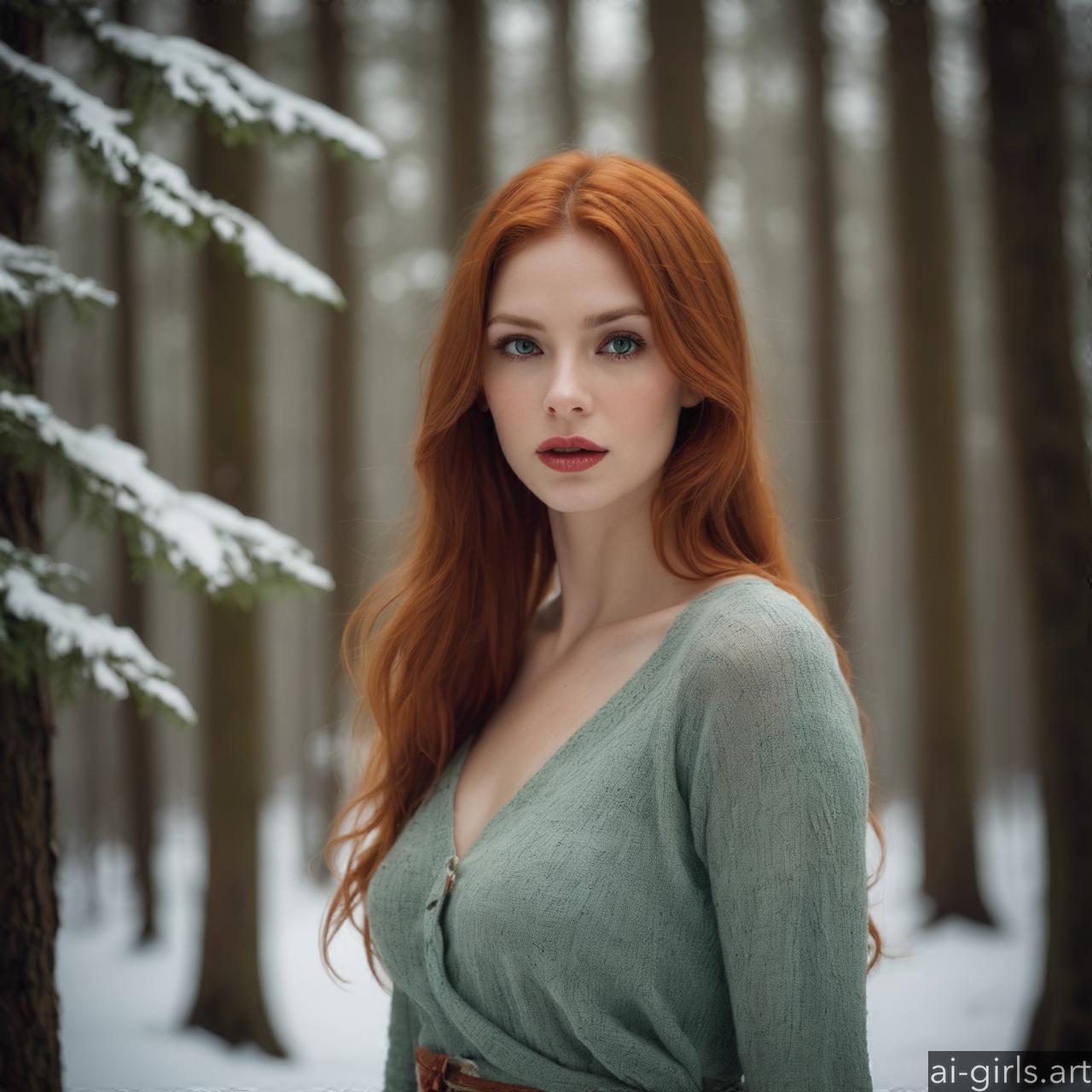 Portrait of a woman with red hair in a winter forest