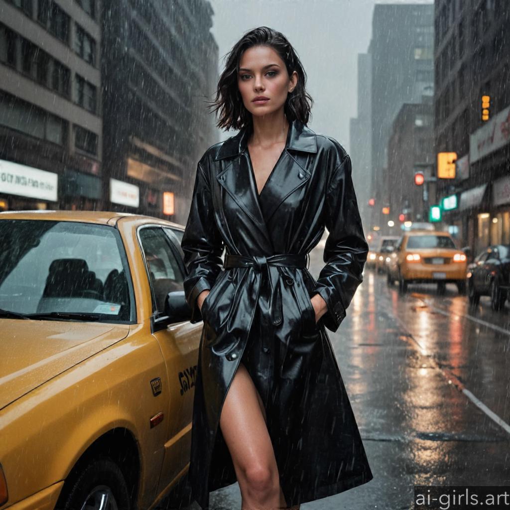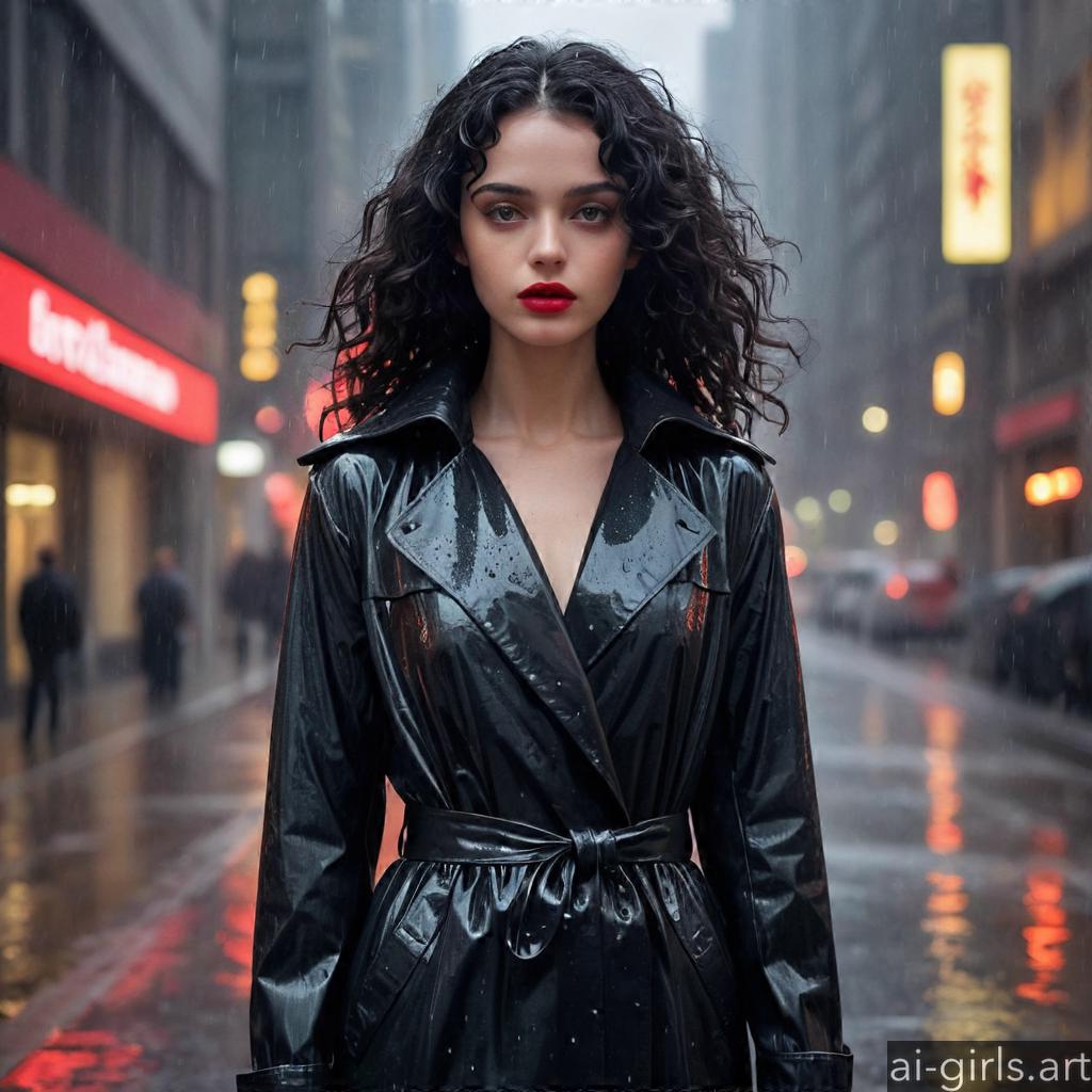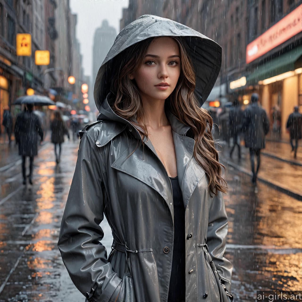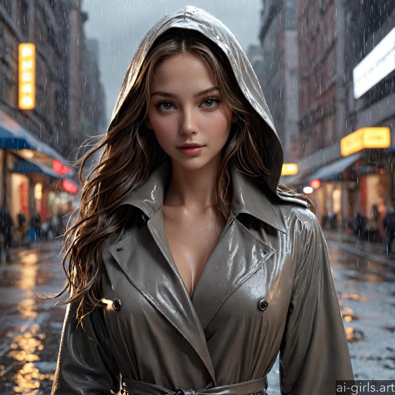 A sexy girl with long hair, wearing a raincoat in a rainy city street.