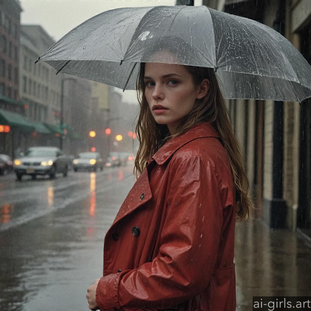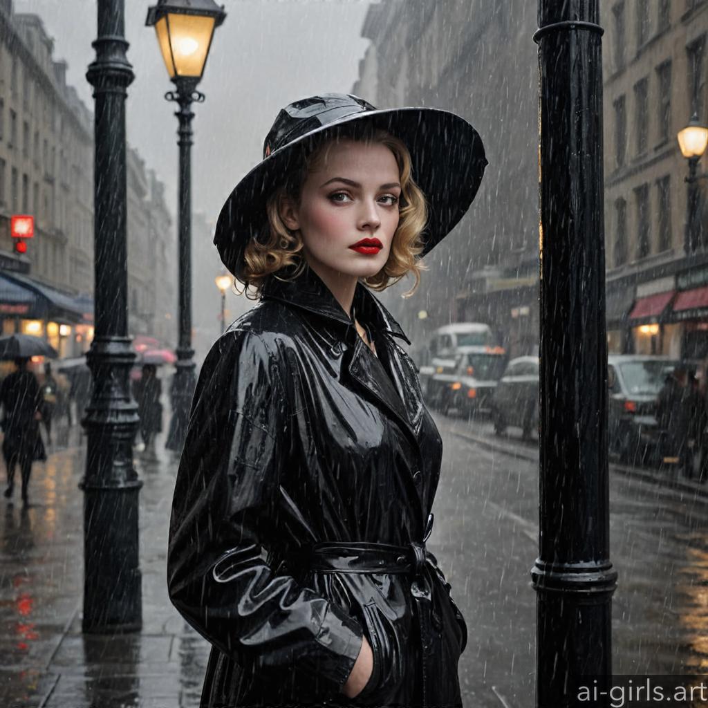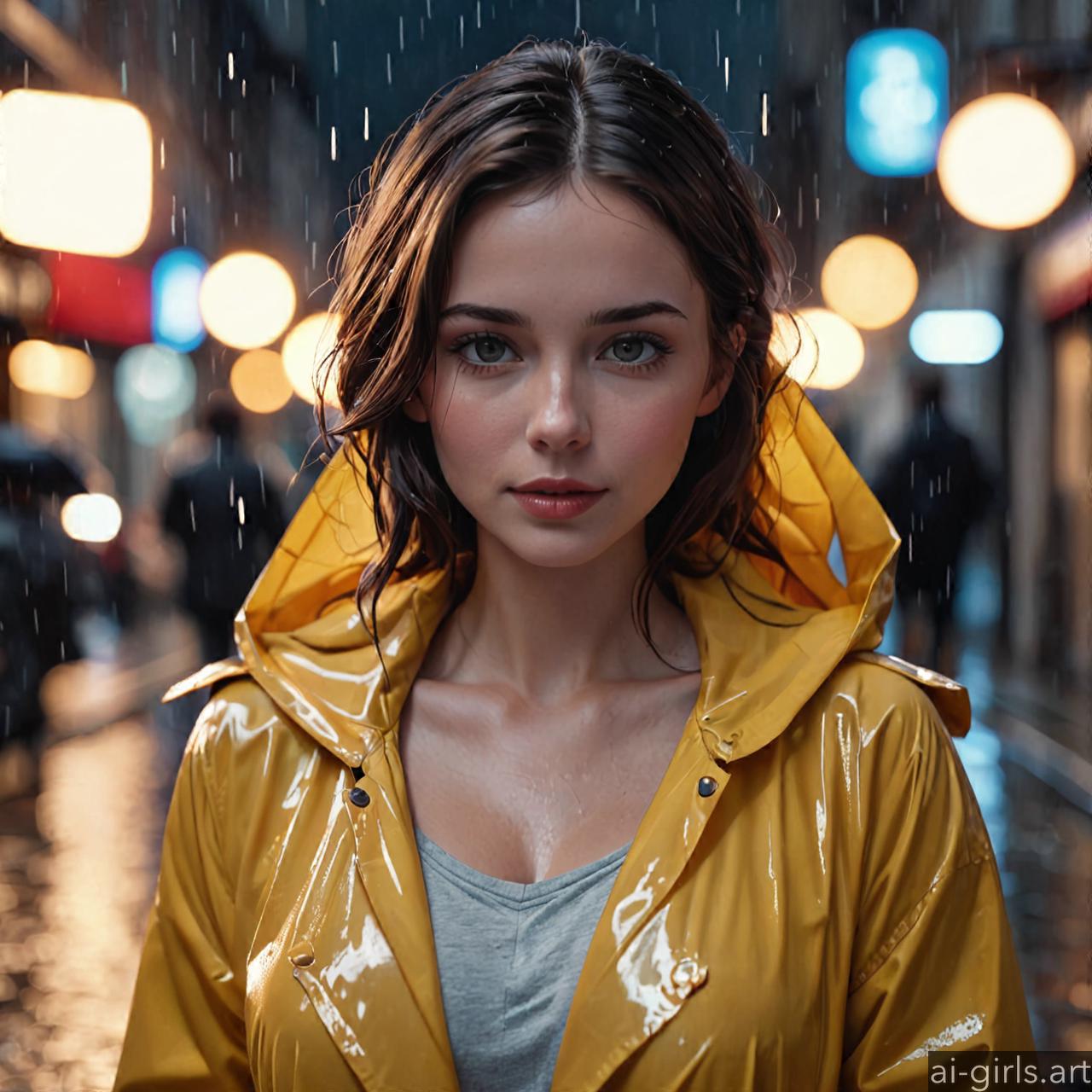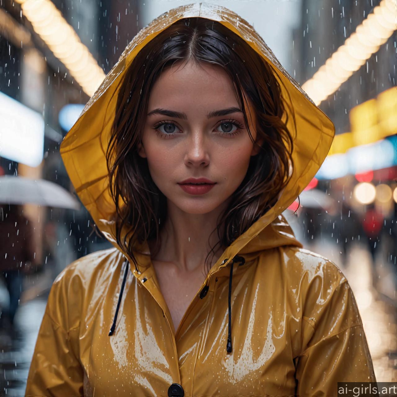 A sexy girl with long hair, wearing a raincoat in a rainy city street.