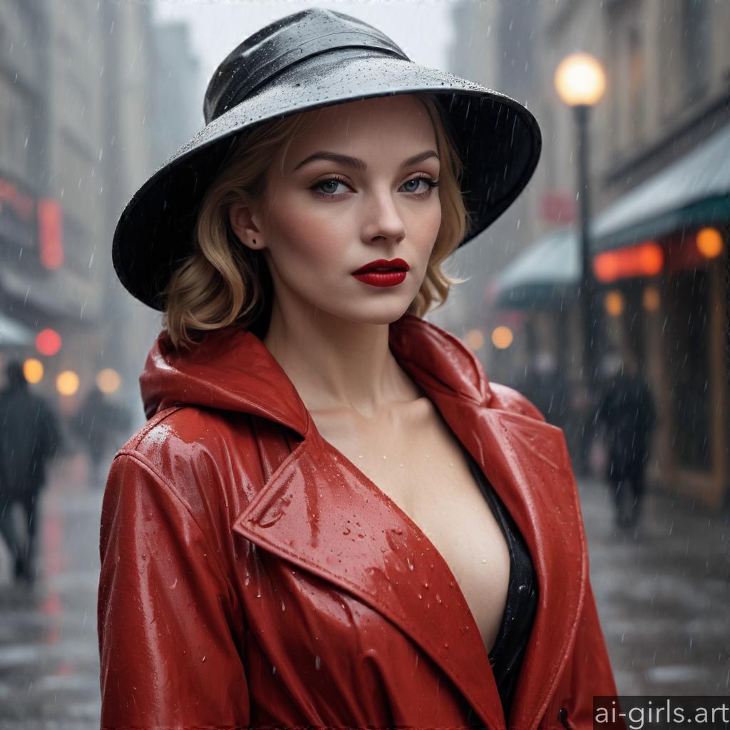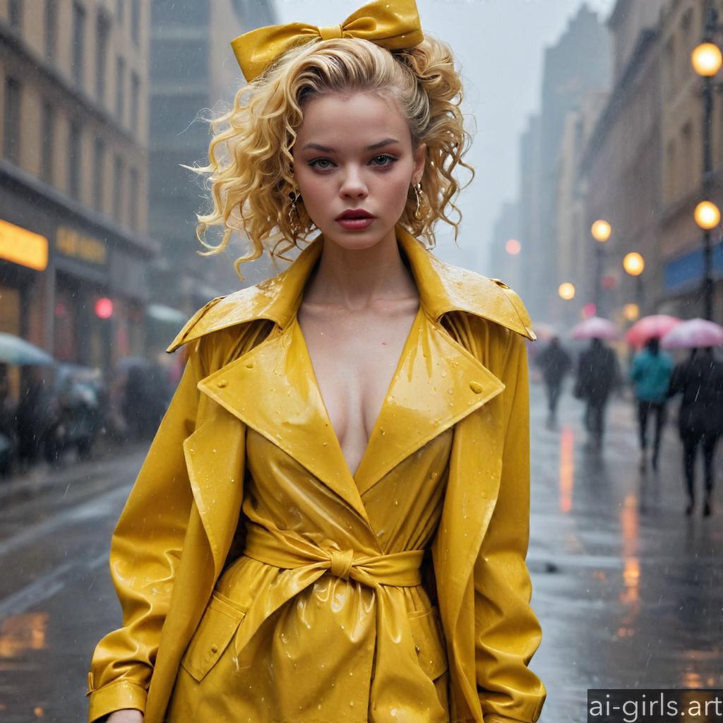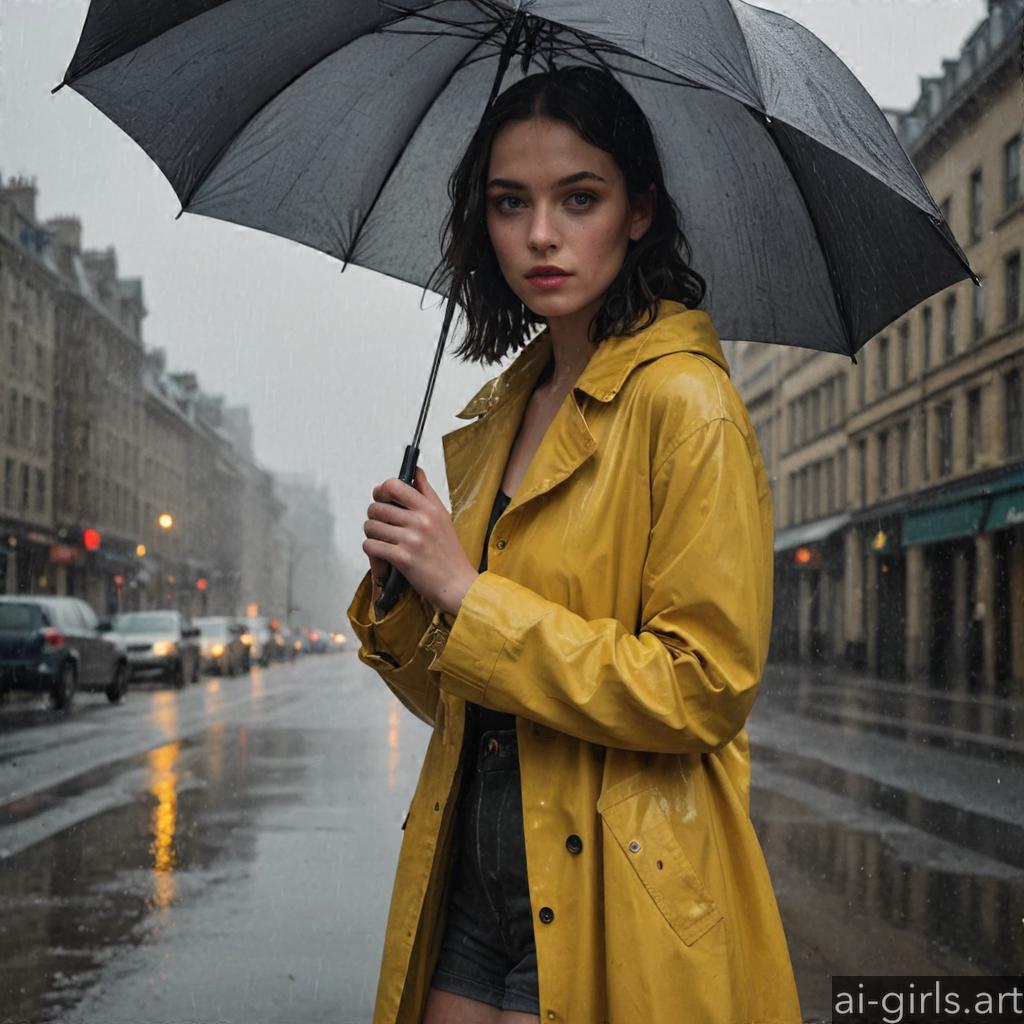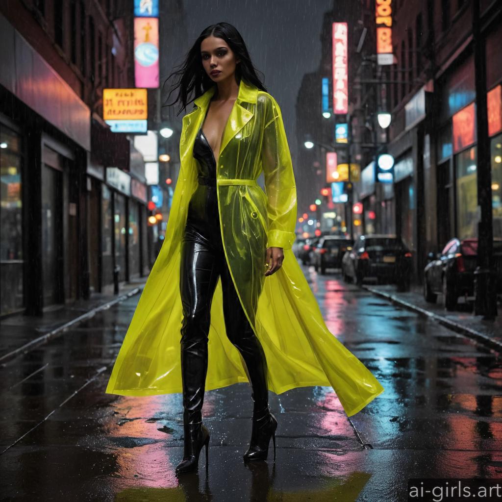 A sexy girl with long hair, wearing a raincoat in a rainy city street.
